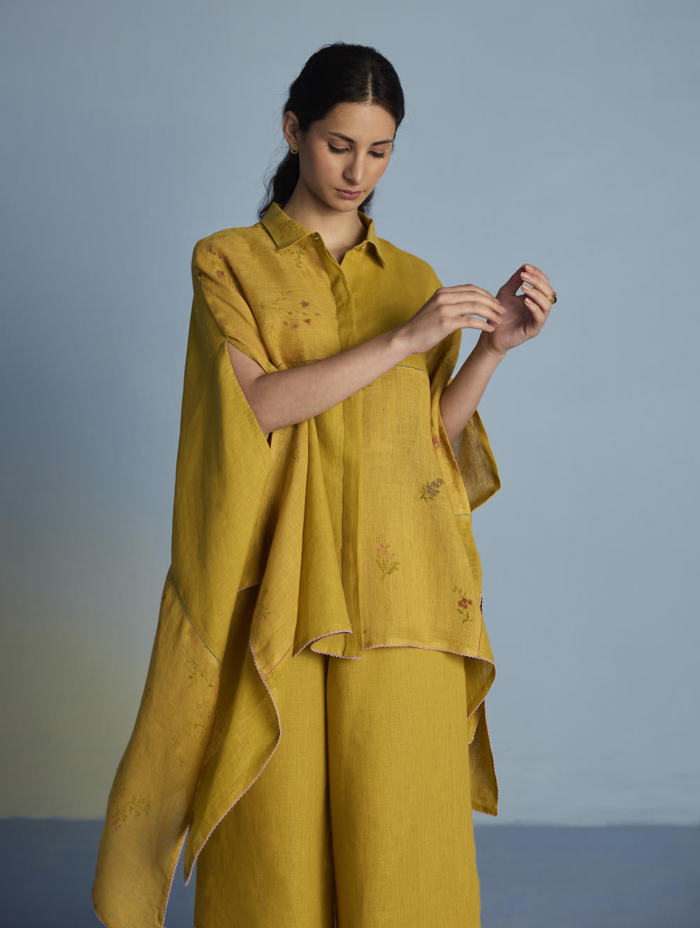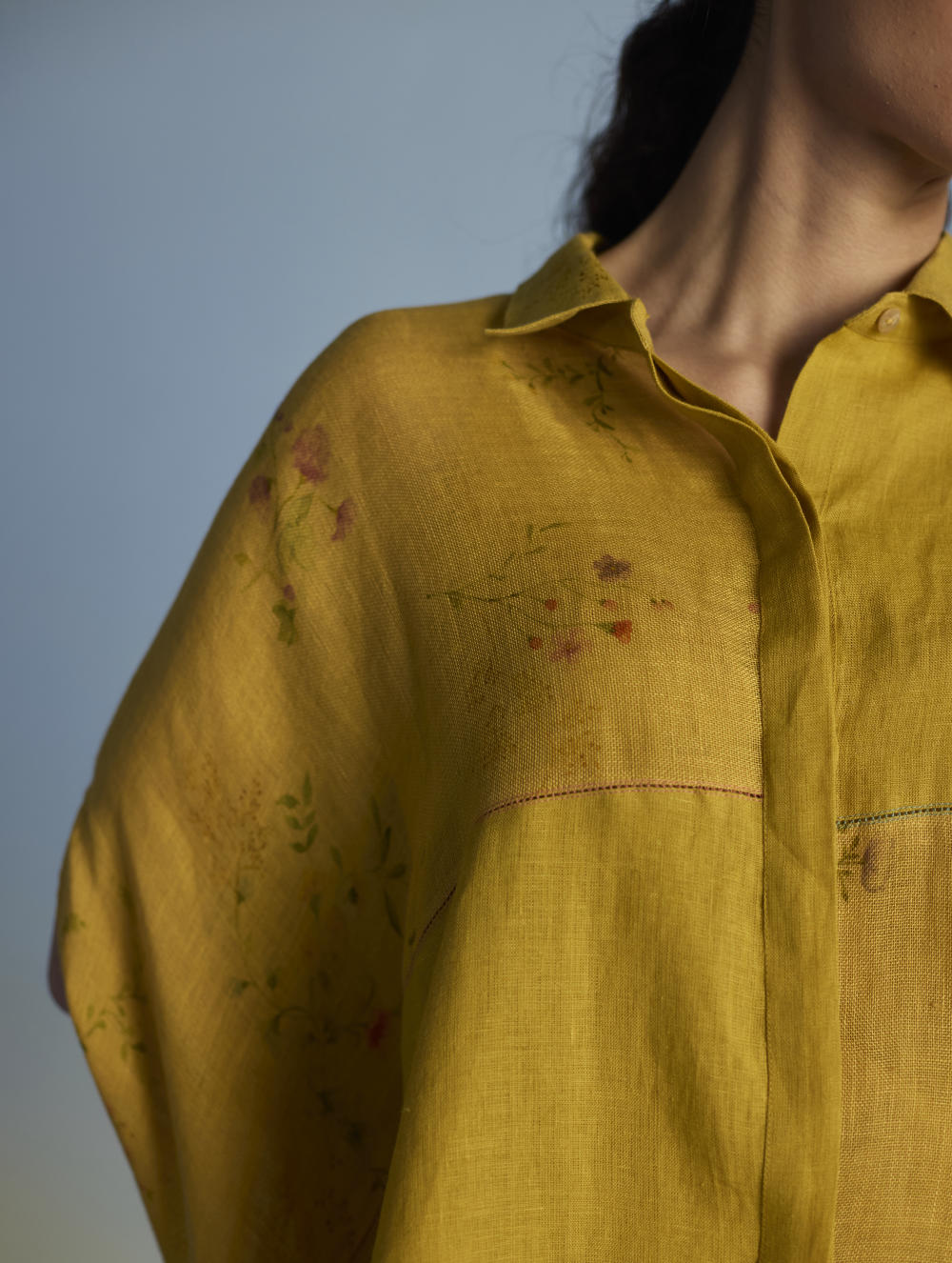 A contemporary take on a kaftan shirt crafted by patching soft yarn-dyed linen and printed sheer linen; featuring hand-illustrated delicate floral prints on the sheer panels and joined with vibrant, multi-colored intricate fagotting thread details. The statement oversized shirt pairs beautifully and easily with our linen pants. It is finished with pop-coloured intricate picoting detail at the hem.
