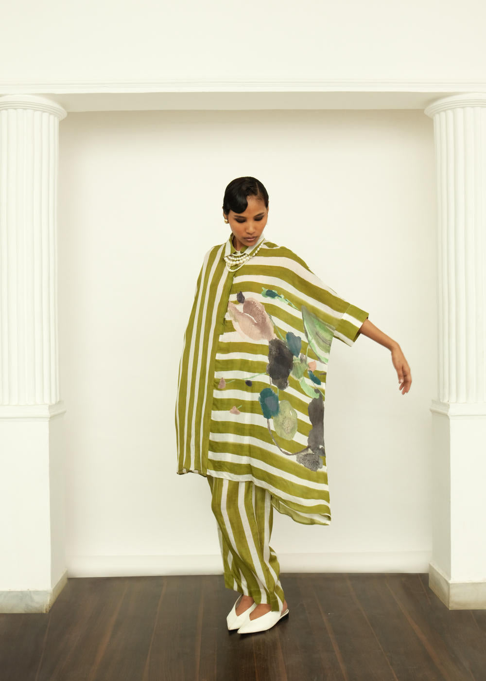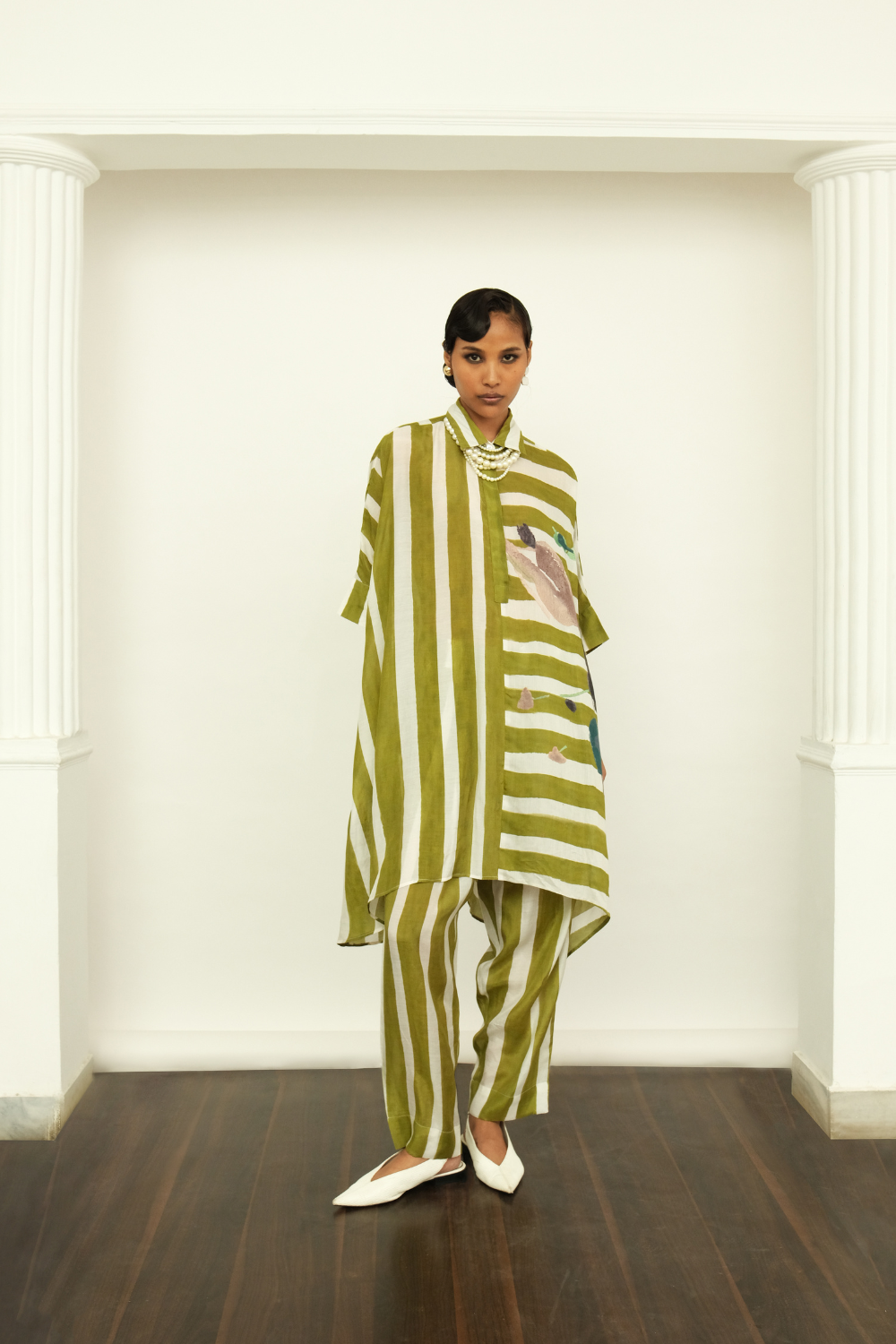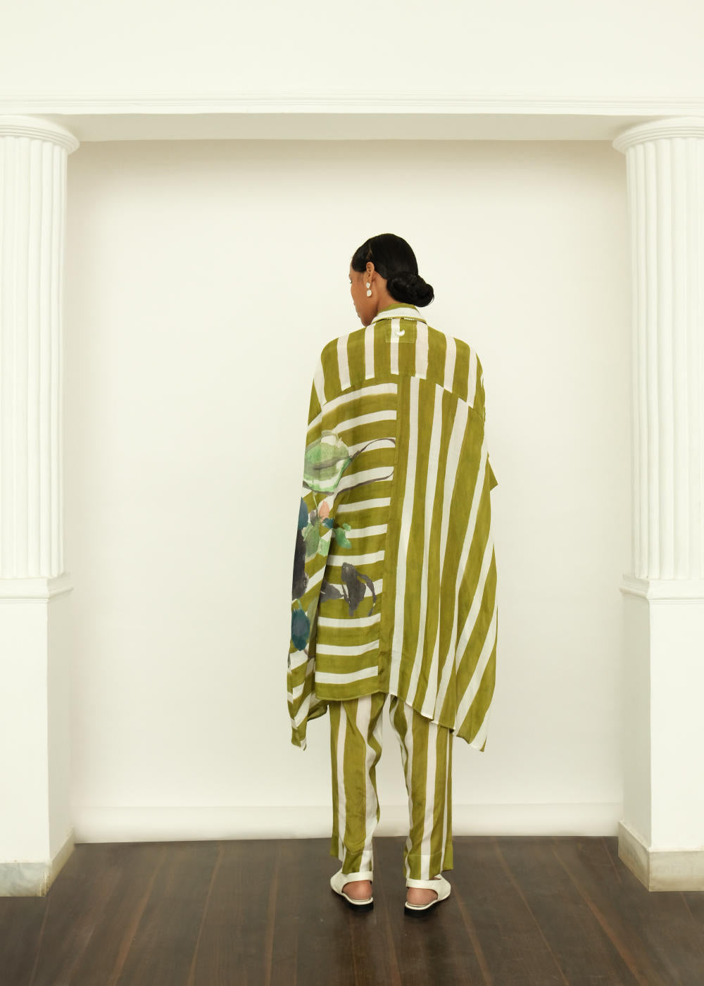 Anti-Fit, Handpainted Signature Ofrida Stripes. Hand-painted abstract expressionist digitally transferred print, Hidden placket, Pair it with our olive tapered fit lowers to complete the look. Hand-embroidered signature OFR Lune. Print placements will vary—single Piece.
