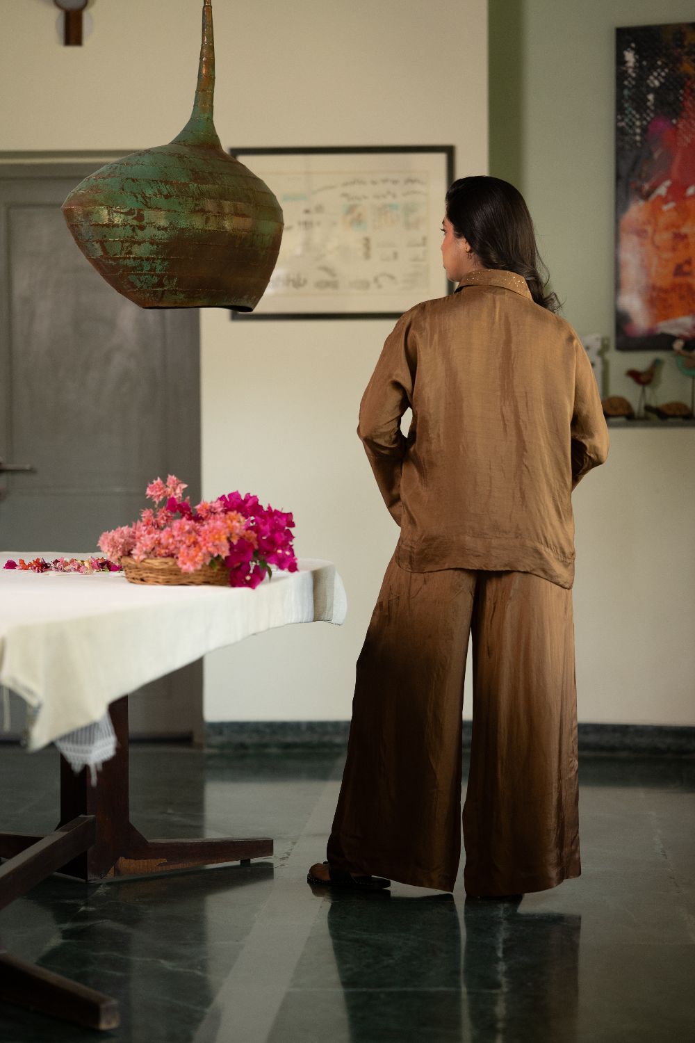 The relaxed-fit top features badla details along the collar, sleeves, and pockets, small glimmers that catch the light subtly. The matching straight-leg trousers bring balance, creating a set that’s as effortless as it is refined.
