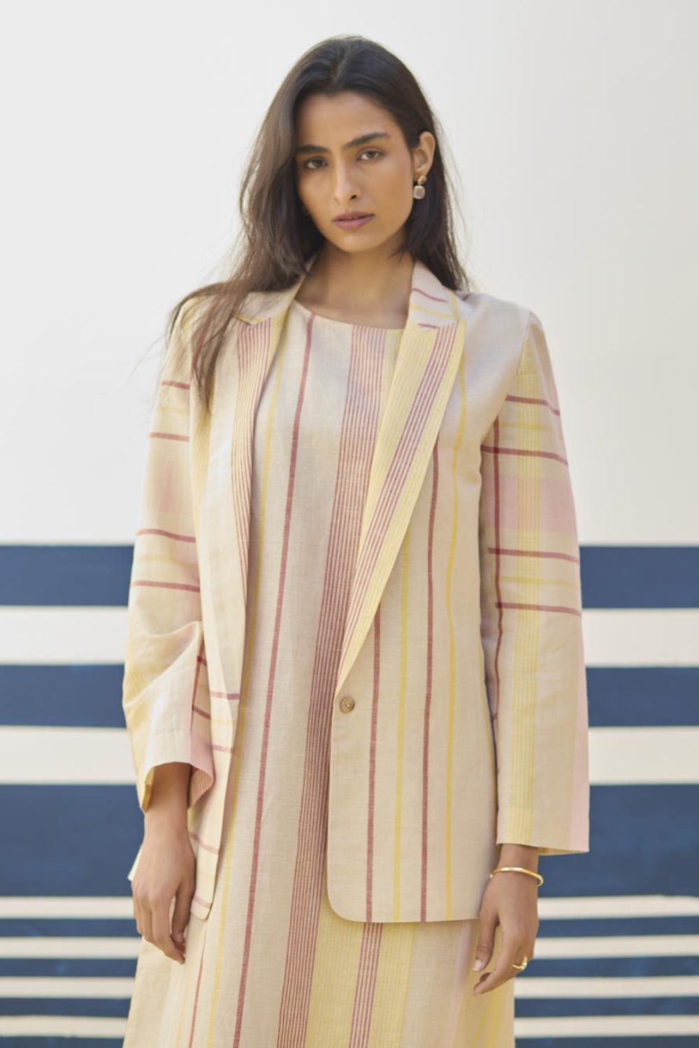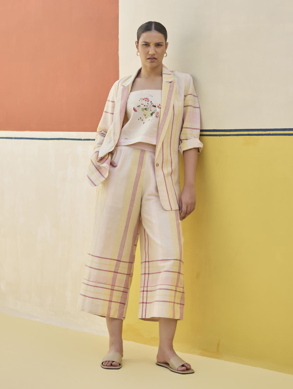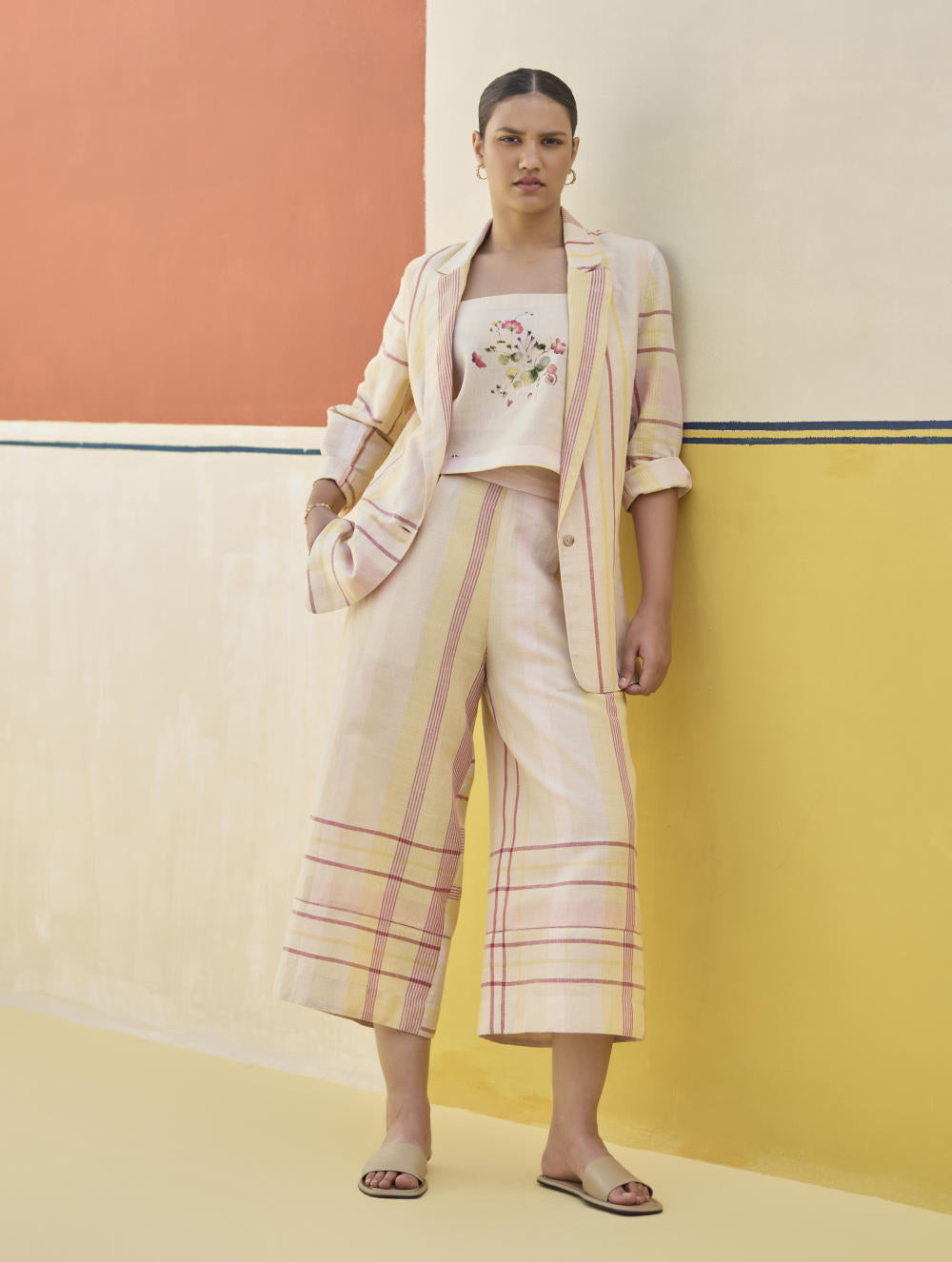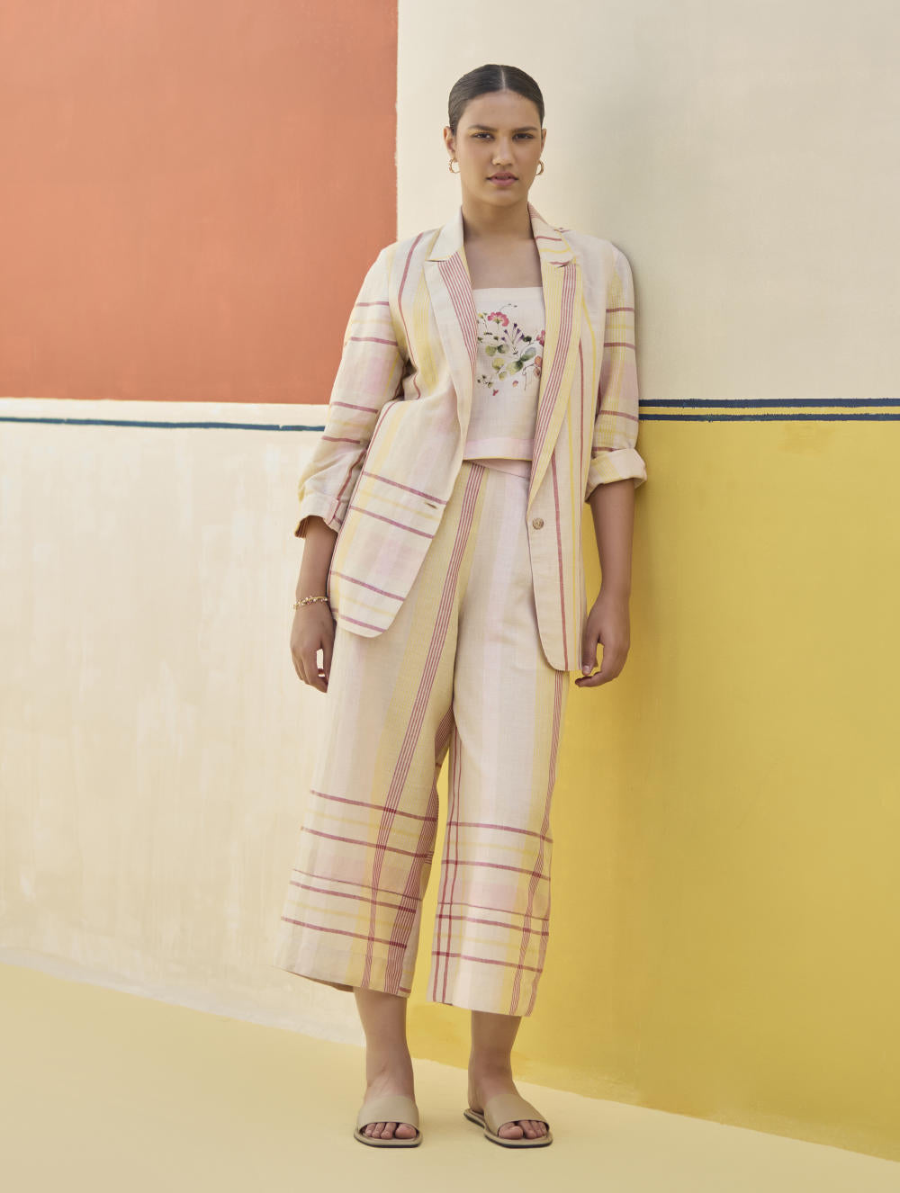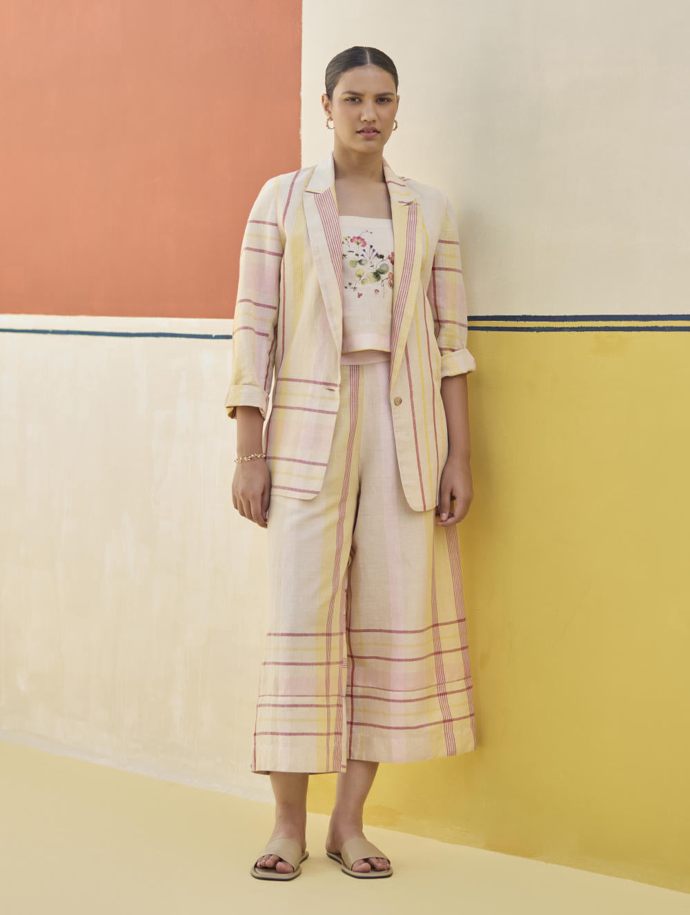 Tailored blazer designed in our soft handloom linen cotton woven with a modern check pattern. Finished with timeless mother-of-pearl buttons, Talia exudes sophistication and timeless style.