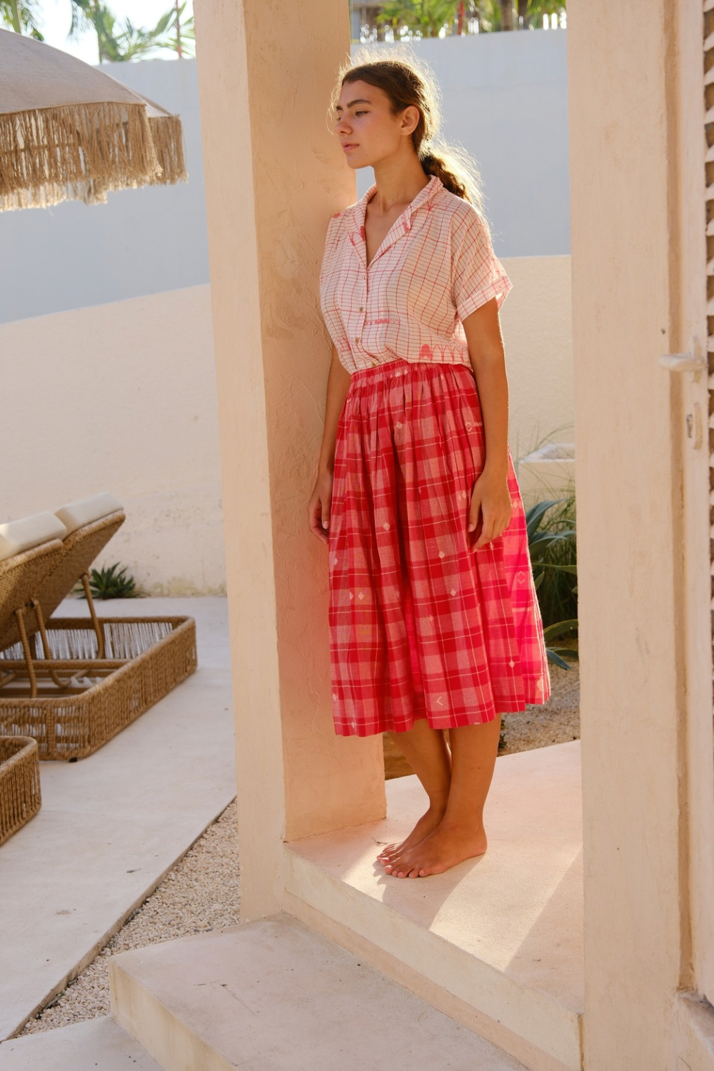 Introducing our Crimson Checkered Cuban Shirt made in collaboration between Audrey E Leary and World of Crow. This special shirt is made using jamdani fabric which is super light and breathable making it perfect for your everyday wear. The light pink color of the shirt and the short sleeves gives the shirt a fun look.