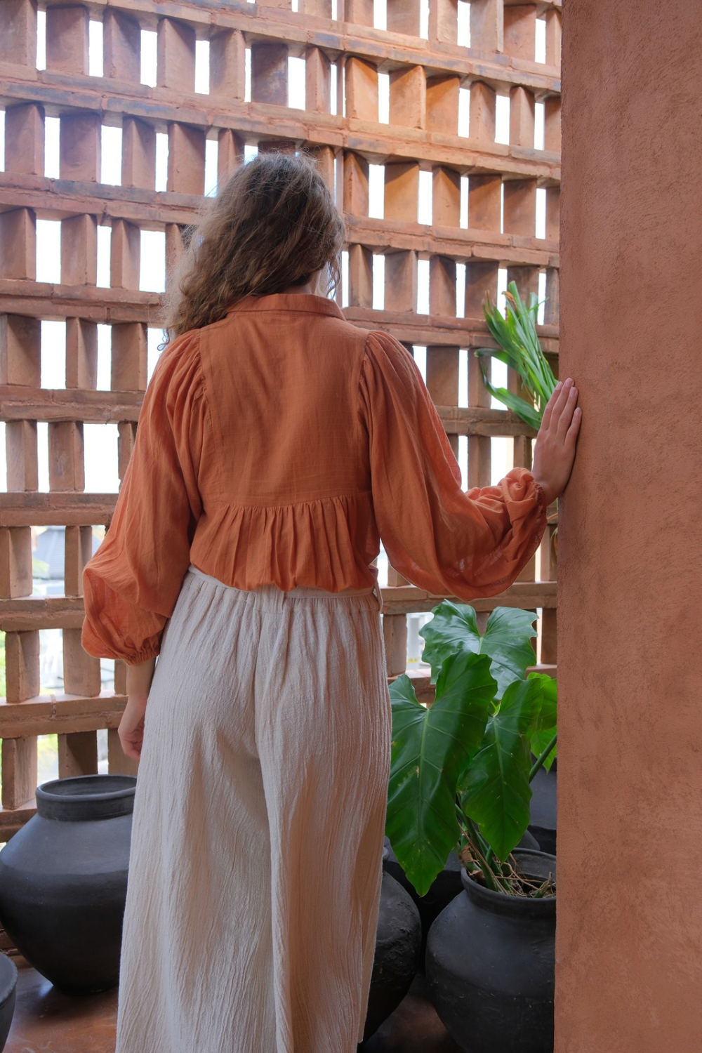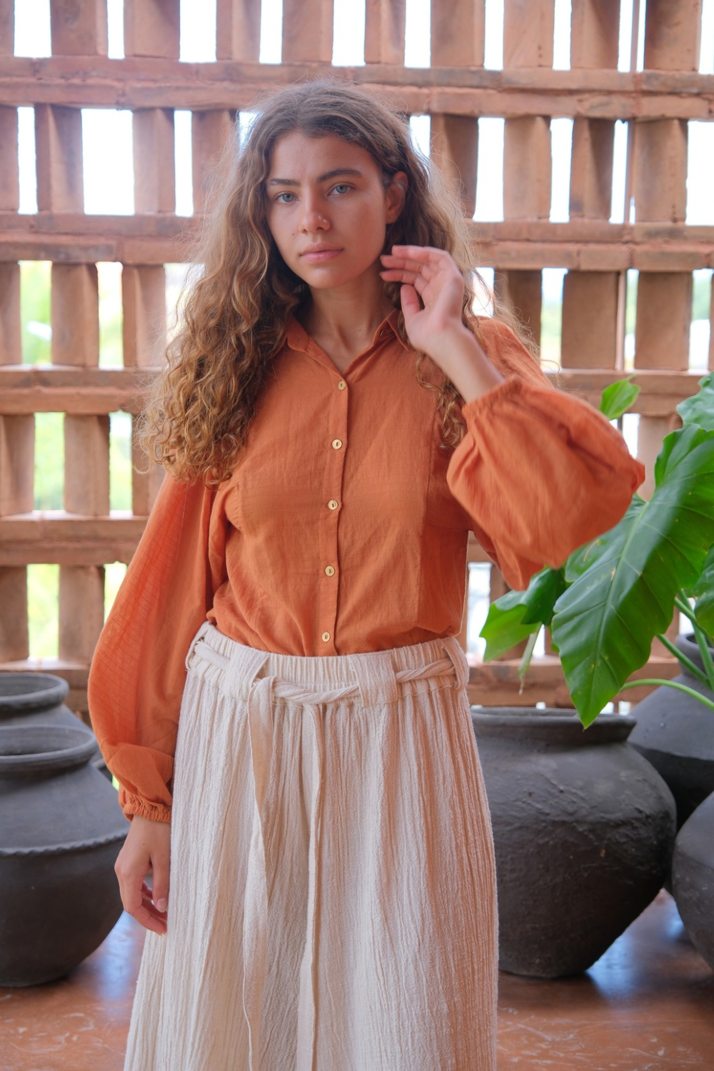 Their silhouettes—relaxed, modern, quietly poetic—carry a language of ease and intention. Natural dyes, azo-free pigments, and slow-woven textiles result in garments that feel honest: soft on the skin, kind to the earth, and deeply respectful of the communities who create them. Each piece is cut and stitched only when ordered, honouring the principle that beauty need not come at the cost of excess.