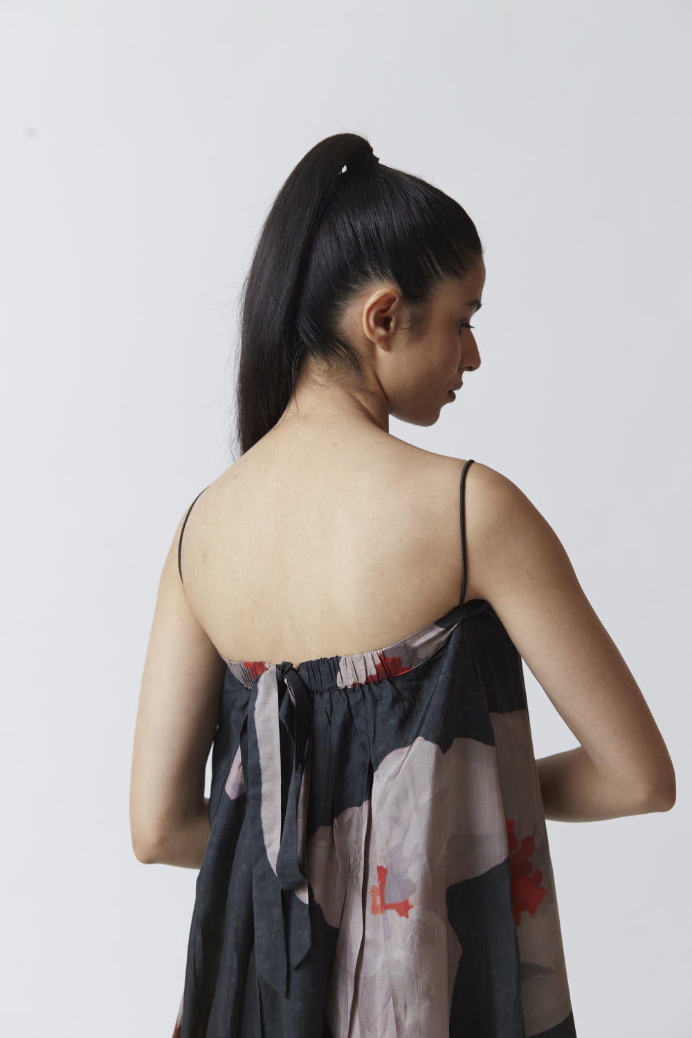 Pure silk printed kurta in black with elasticated back and tie up.