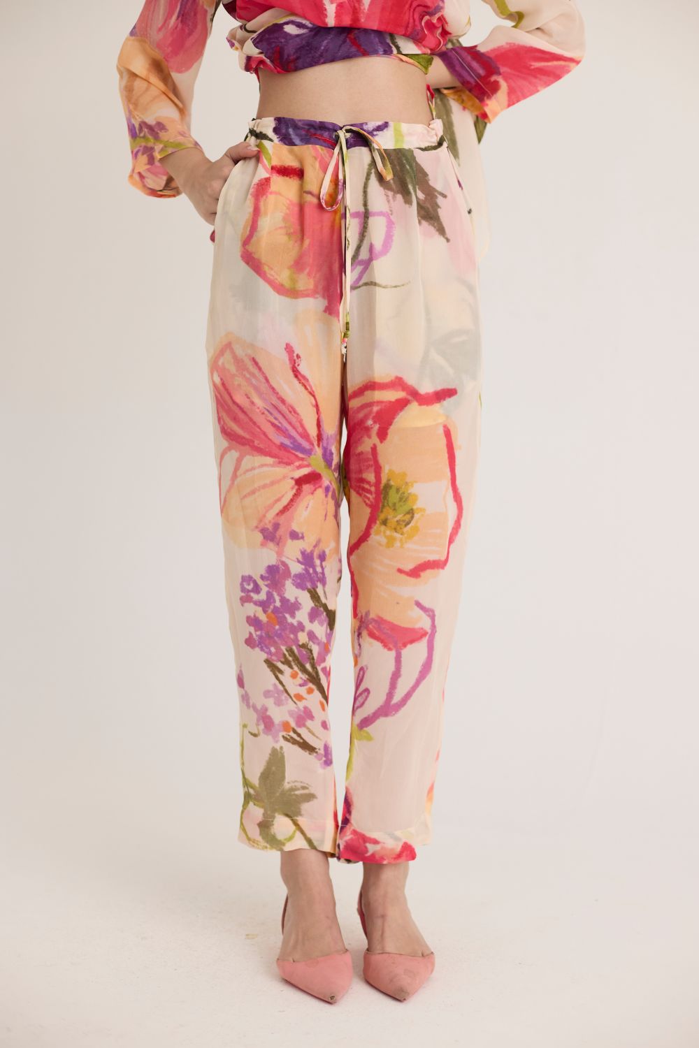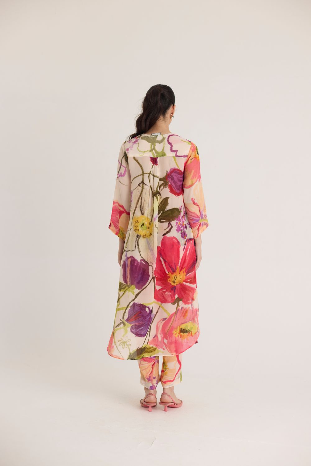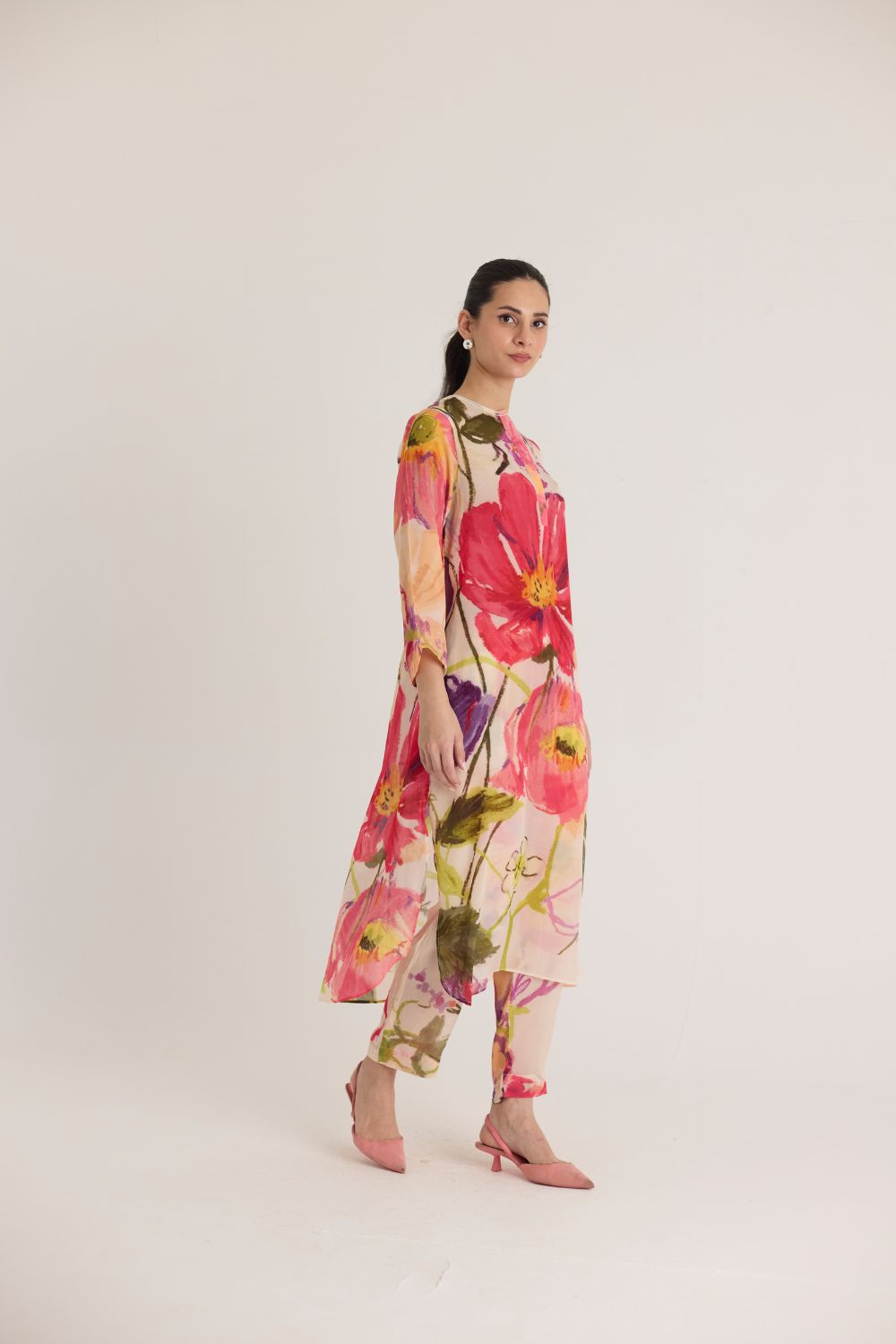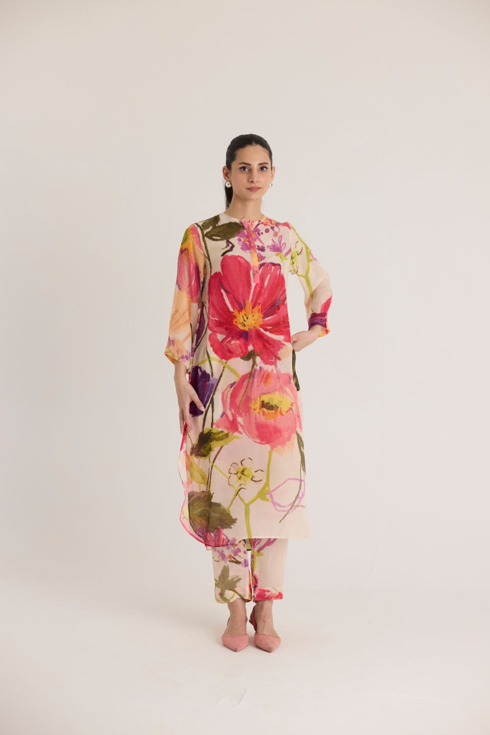 This flowy kurta set features a striking oversized floral print in vibrant hues of red, pink, and green, beautifully contrasted against a soft blush base. The painterly blooms add an artistic touch, making this outfit perfect for contemporary sophistication. With its relaxed silhouette and lightweight fabric, this set ensures comfort while making a bold statement.