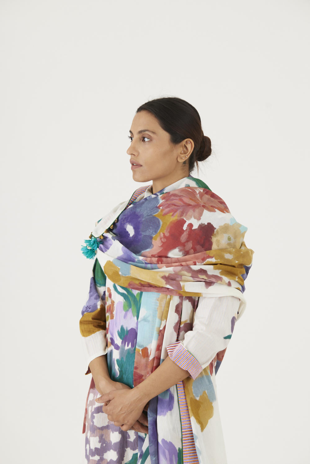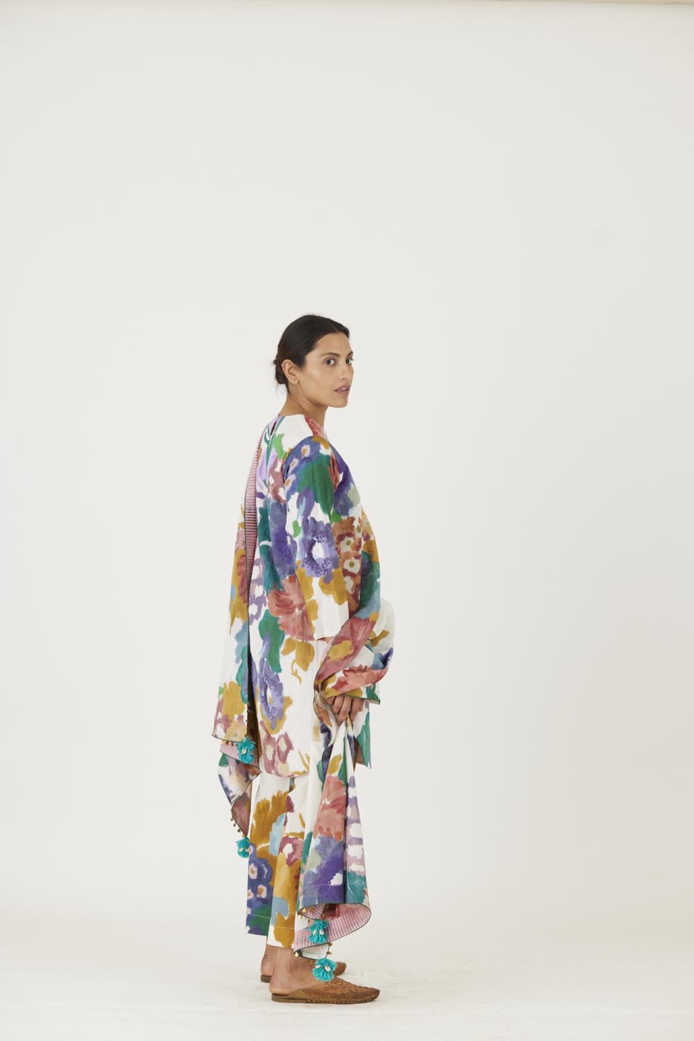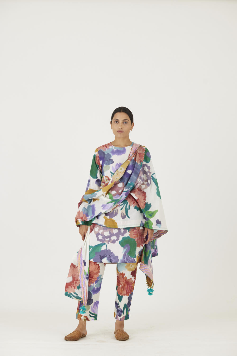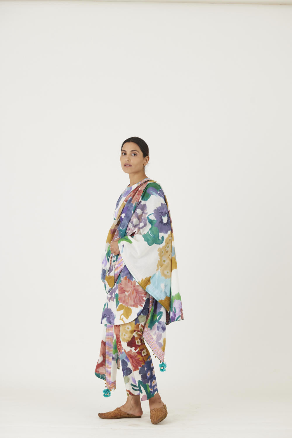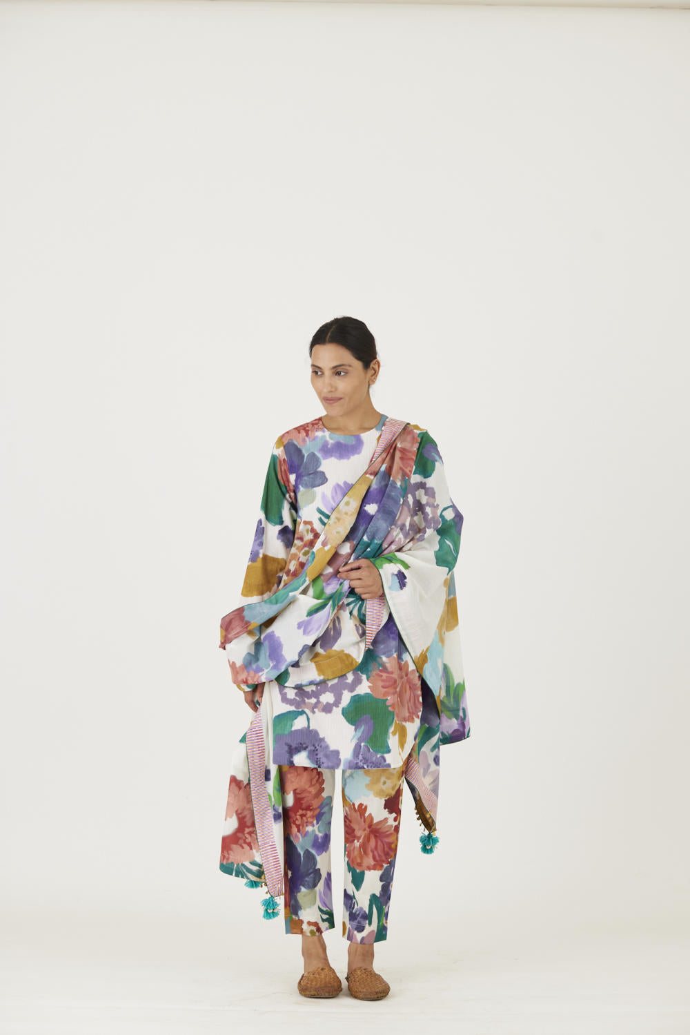 The print features an abundance of roses along with marigolds and jasmines arranged together in a bouquet on a summer white base. The dupatta is in mulmul and has a 2" wide striped facing . The kurta is finished with tassel bunches and metal hangings on the edges.