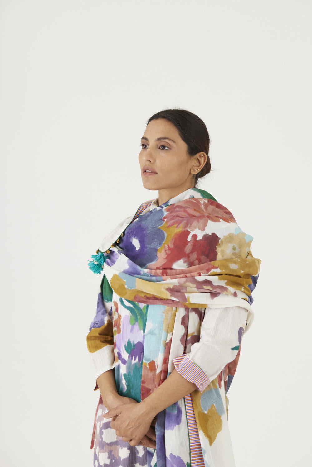 Priya takes her art and places it on garments that slip seamlessly into wardrobes around the world — dresses, blouses, scarves, and sarees that carry a certain versatility: expressive without being loud, contemporary without losing cultural nuance.