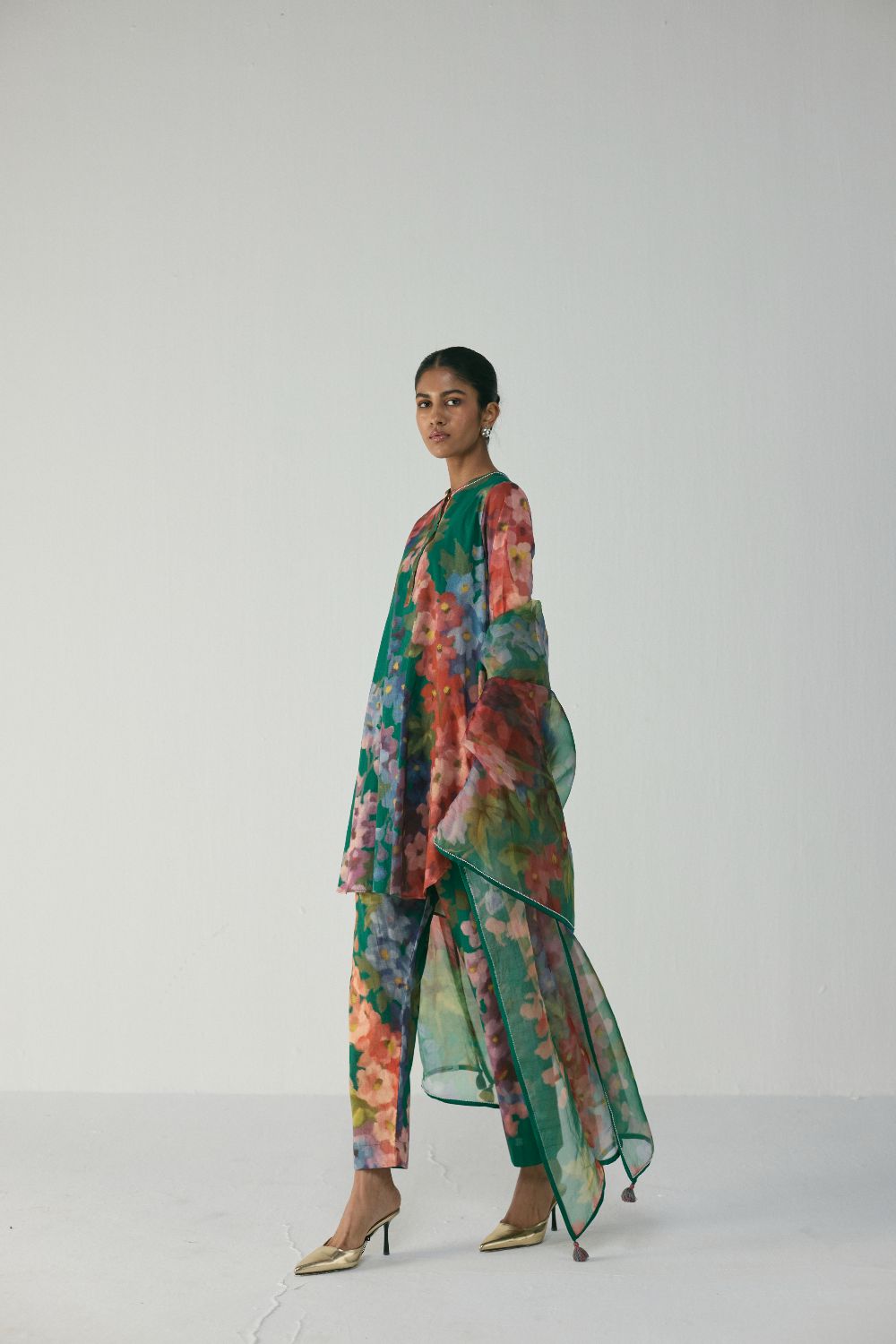 This elegant cotton kurta set is a celebration of vibrant florals and effortless sophistication. Crafted in lightweight, breathable cotton, the ensemble features an all-over painterly floral print in lush hues of green, pink, lilac, and coral — evoking the beauty of a hand-painted. The kurta is designed with a straight, relaxed silhouette, a keyhole neckline, and full sleeves, making it both comfortable and refined for everyday elegance or special occasions.