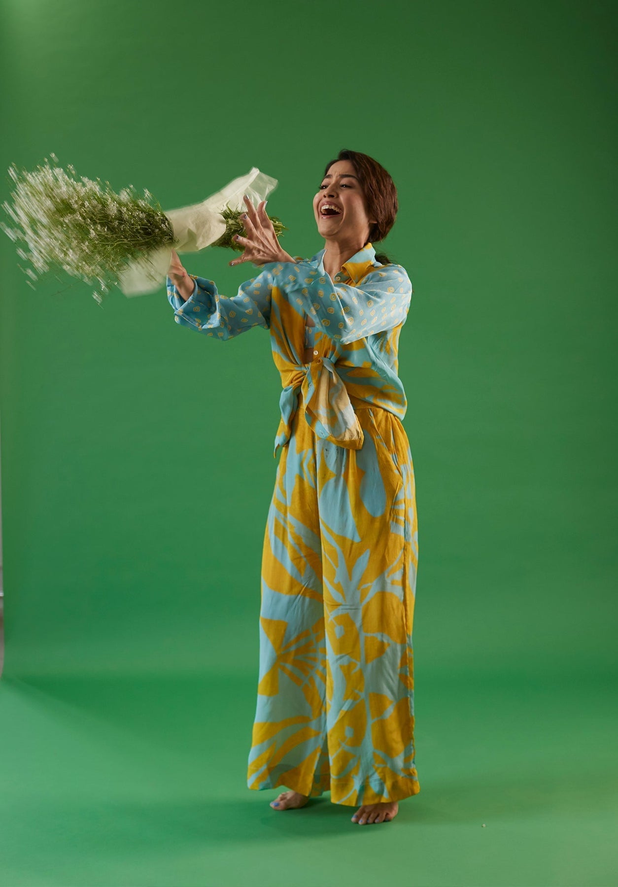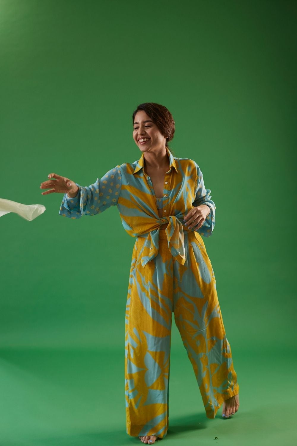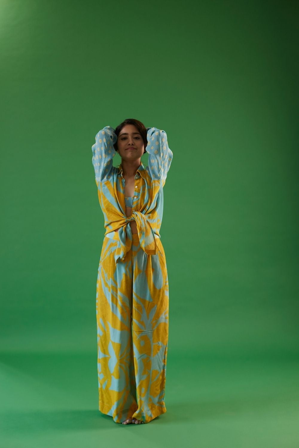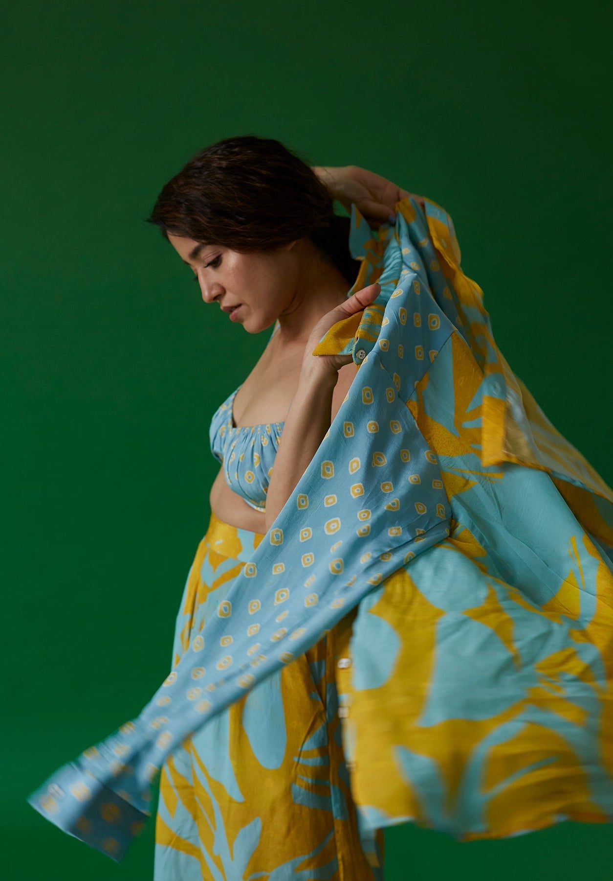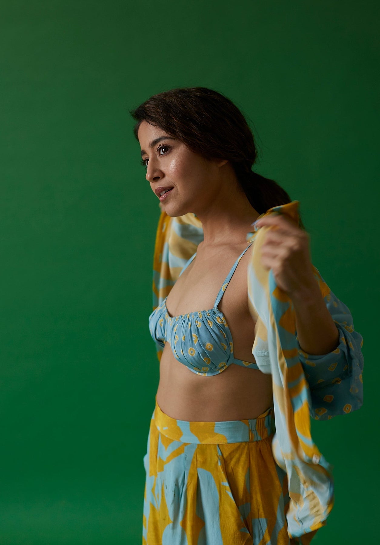 Tsuba blue crepe bralette features an all over bandhini in yellow on a bright blue base.