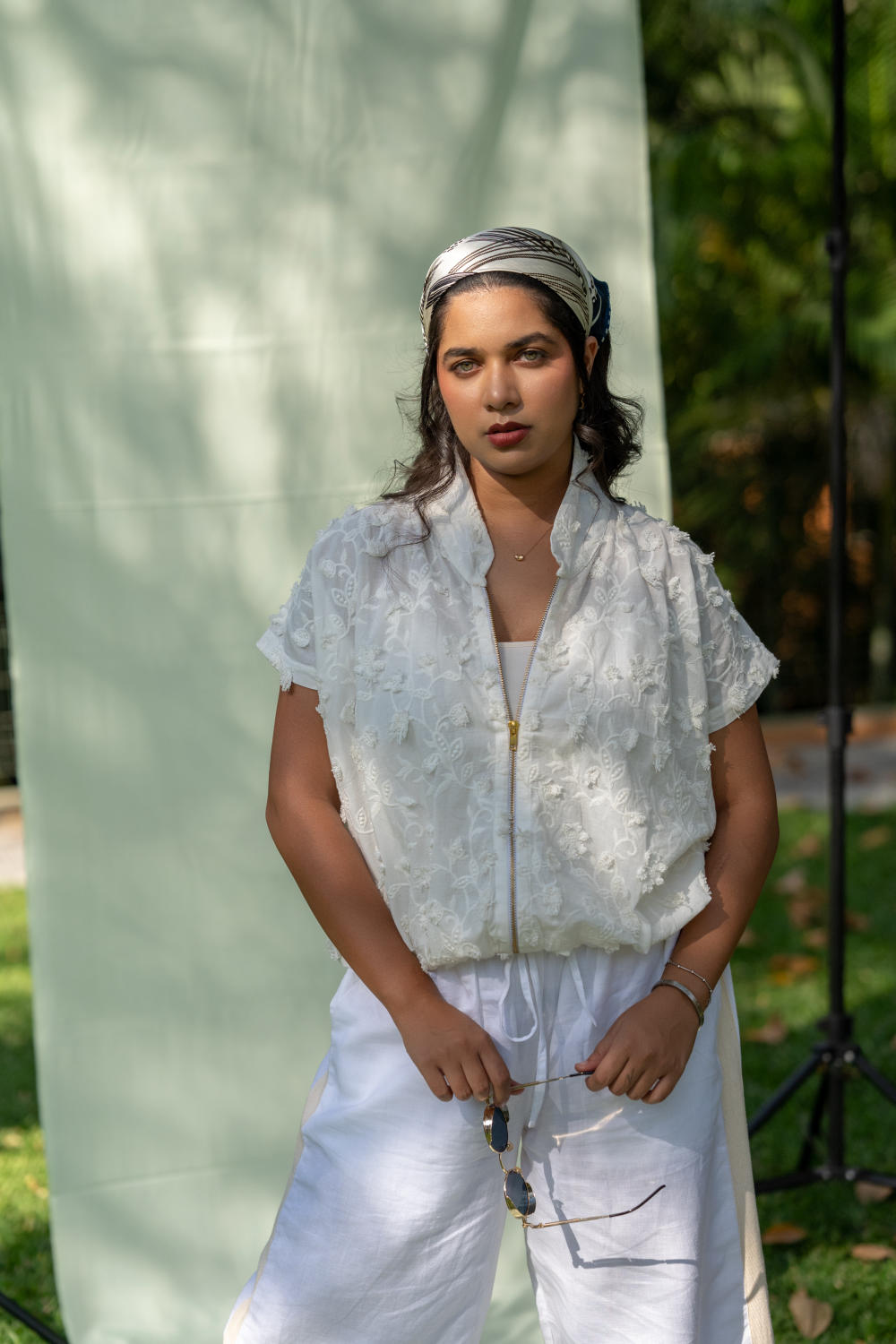 A structured yet lightweight layer, with appliqué details that echo the textures of landscapes. Meant to be thrown over prints for contrast or paired with tonal separates for a monochrome, textural play. The perfect balance of softness and structure