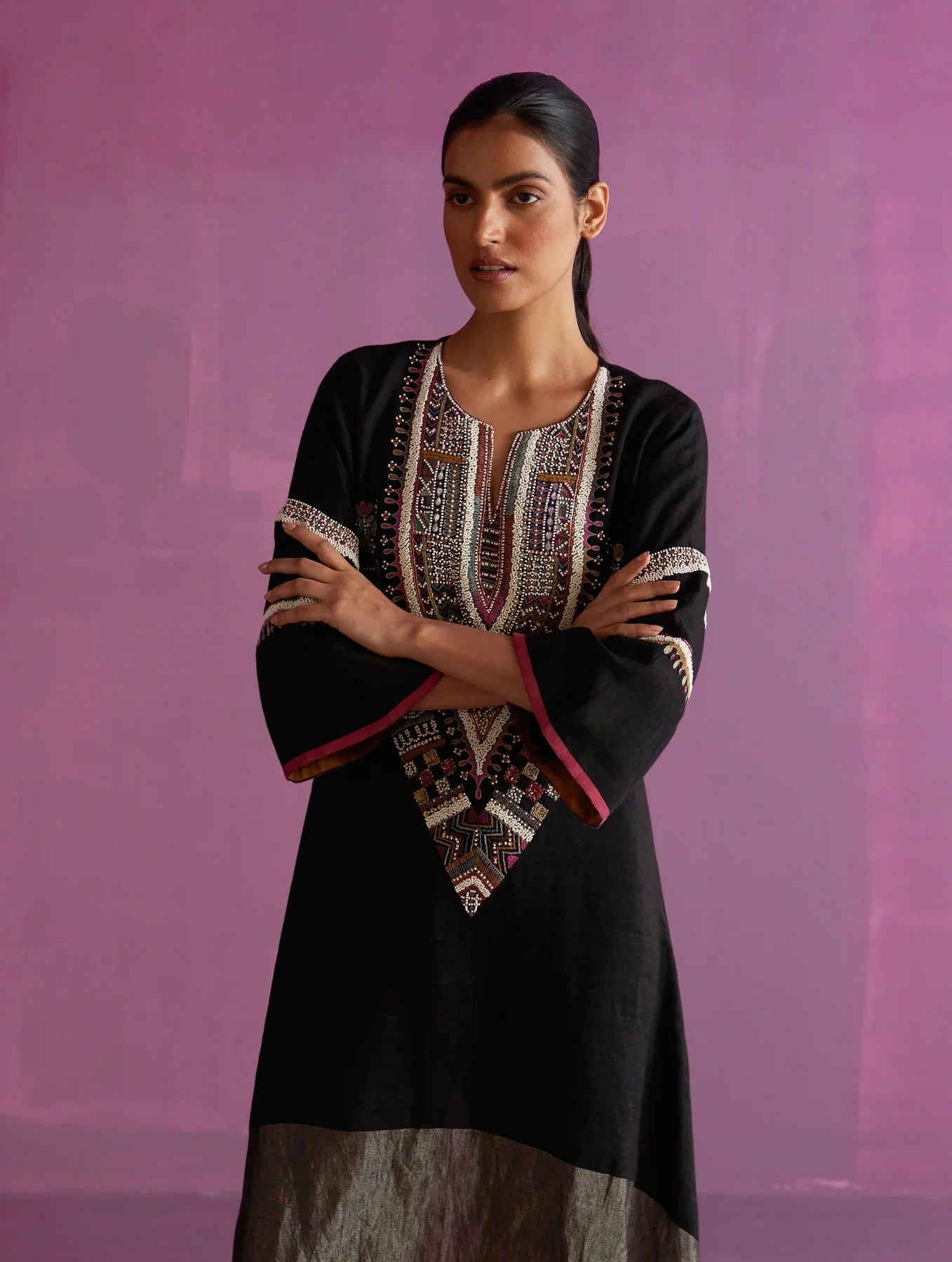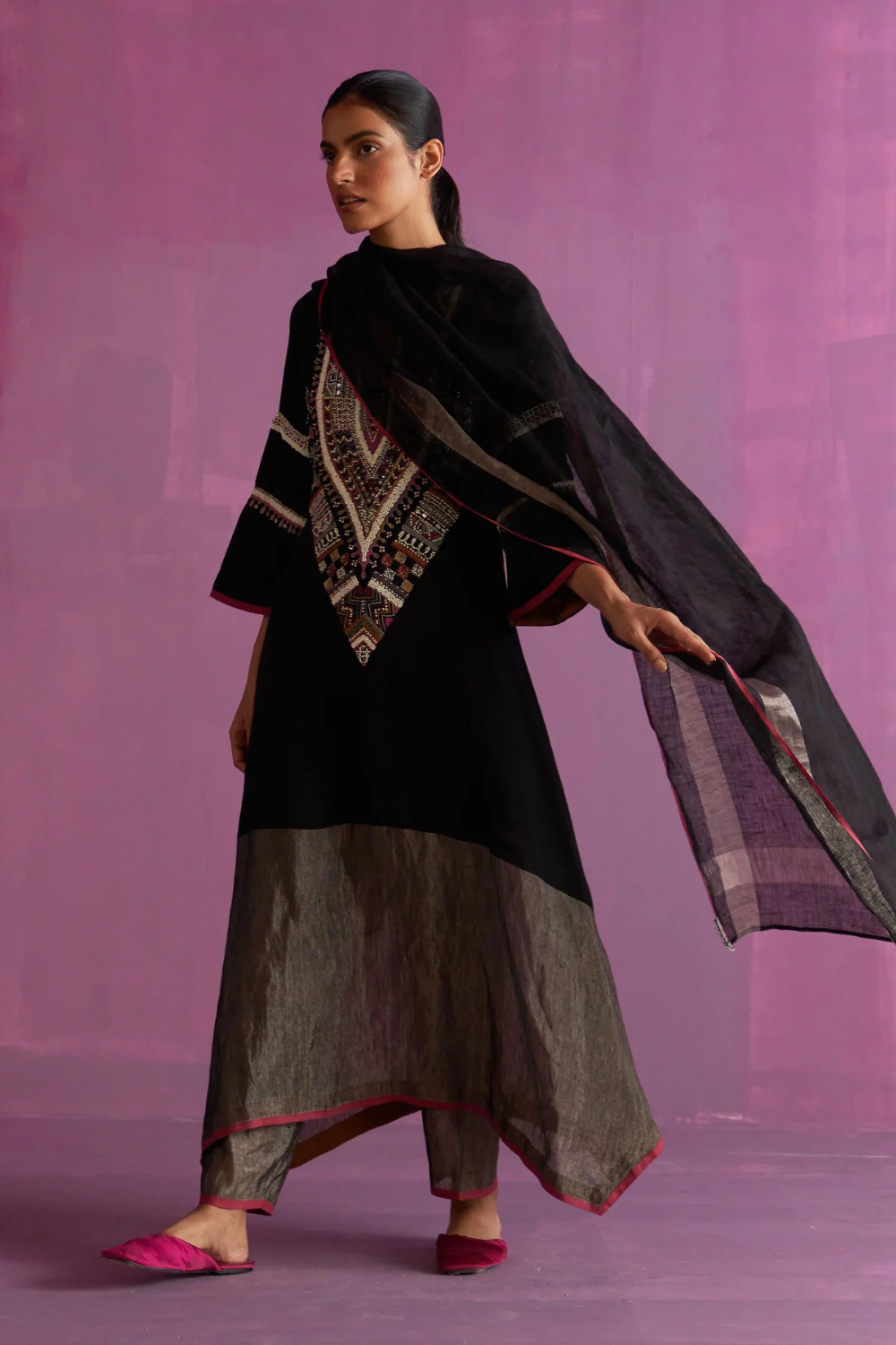 Kurta - A statement festive kurta in our signature hand-woven metallic linen with a pop colored selvedge, intricately and meticulously hand-embroidered in a mixed material banjara style with multi-colored threads, metal sequins and uneven shaped beads giving it a statement and distinct look. This kurta has 3/4th bell sleeves and is our favourite look to wear to all evening get-togethers. Pant - Handloom soft linen tapered pants with woven metallic zari border at the hem and a pop-coloured selvedge. The pant has an elasticated waistband at the back with a drawstring and pockets. Dupatta - Our soft handwoven linen dupatta with a metallic zari border is intricately hand-embroidered with multi-coloured beads on the edges.