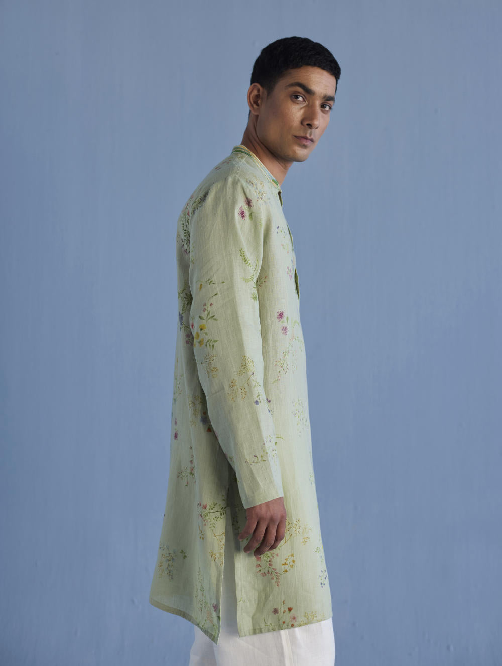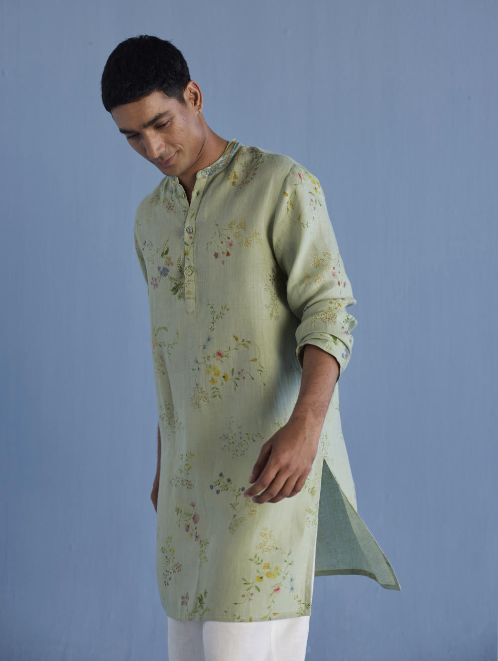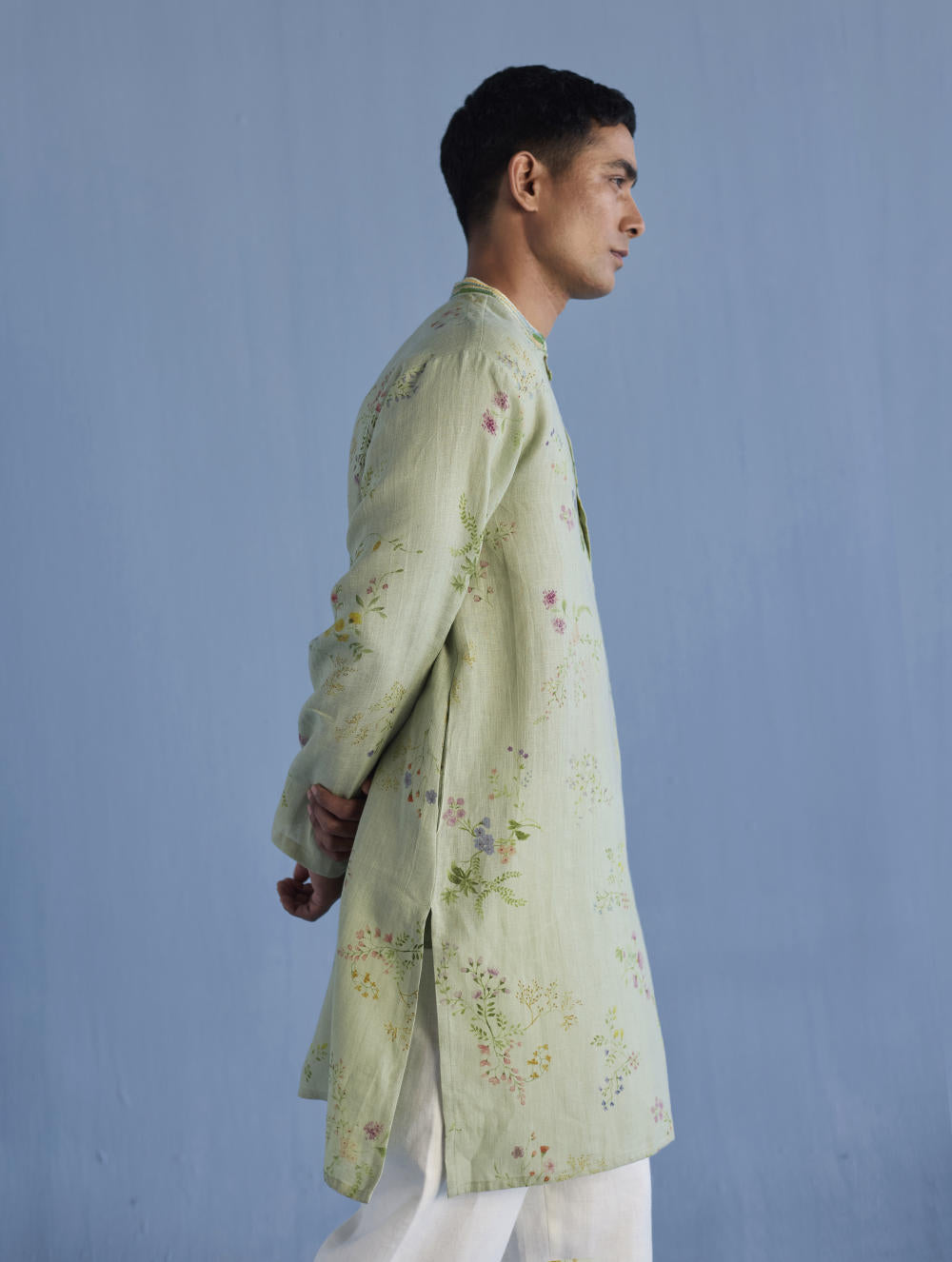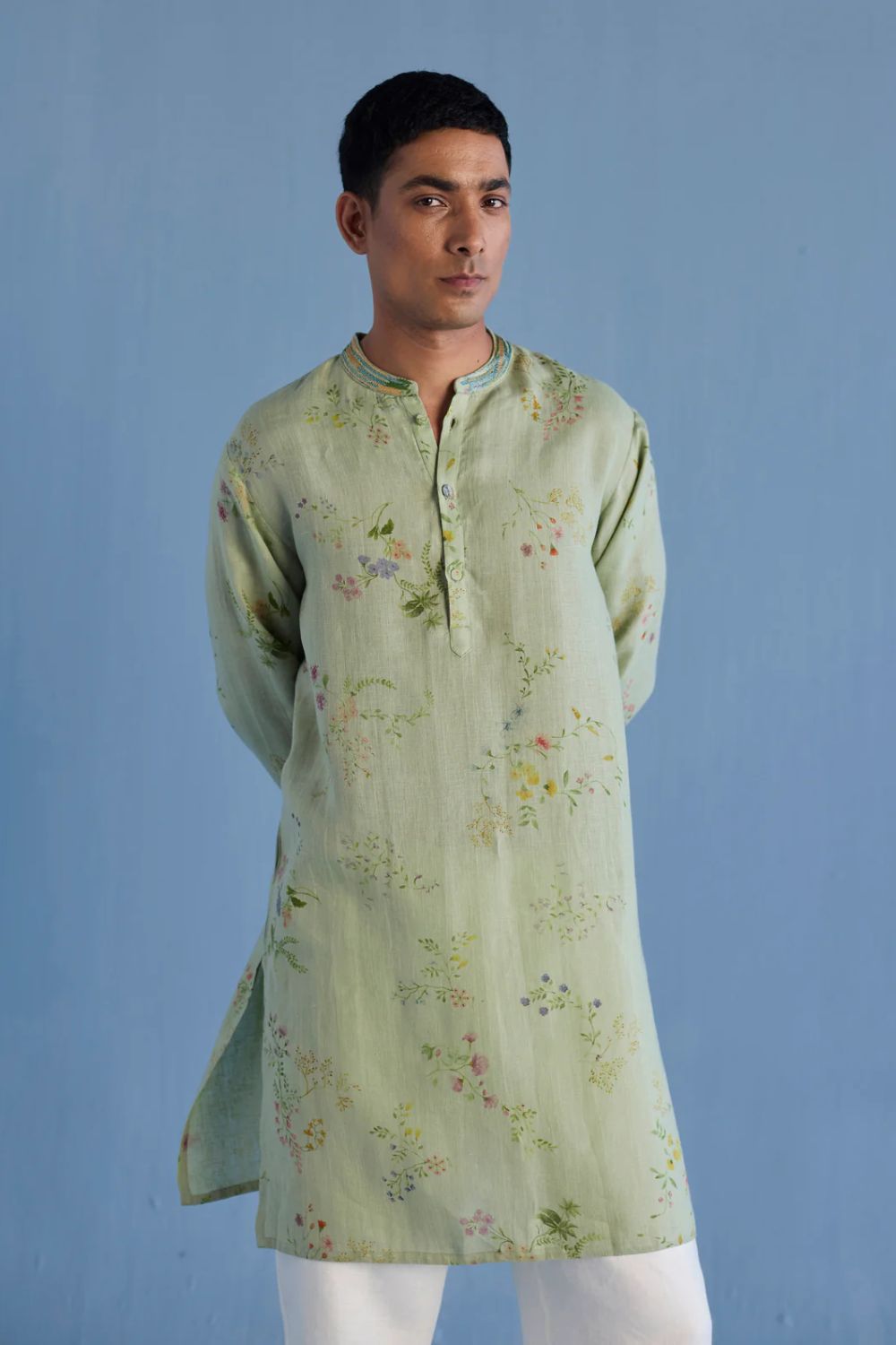 A statement, yet timeless, mandarin collared kurta in the softest pure yarn-dyed linen printed in a hand-painted watercolour floral print with a hand-embroidered collar with mixed silk threads and beads mimicking the brush strokes in colours derived from the floral print.