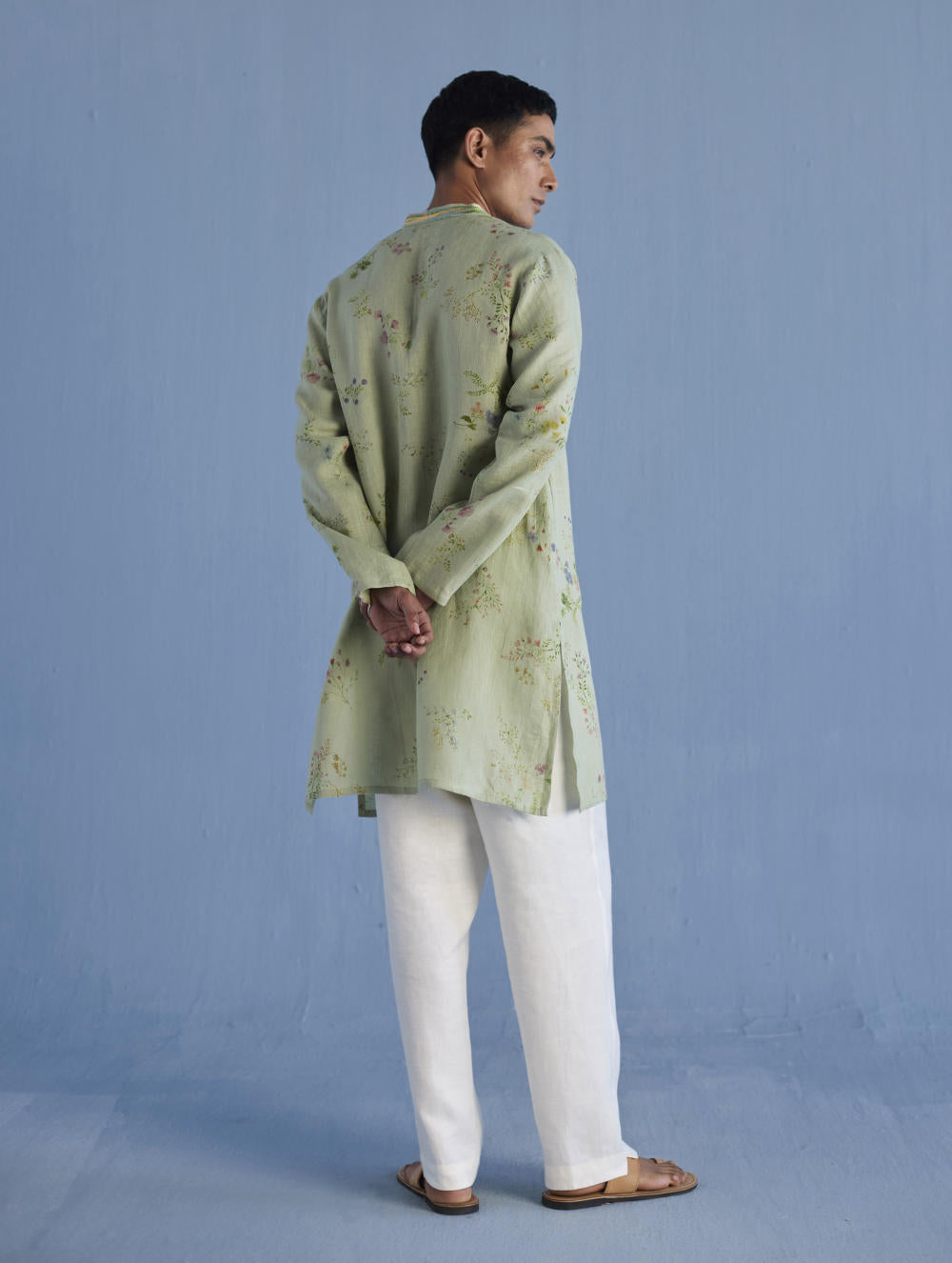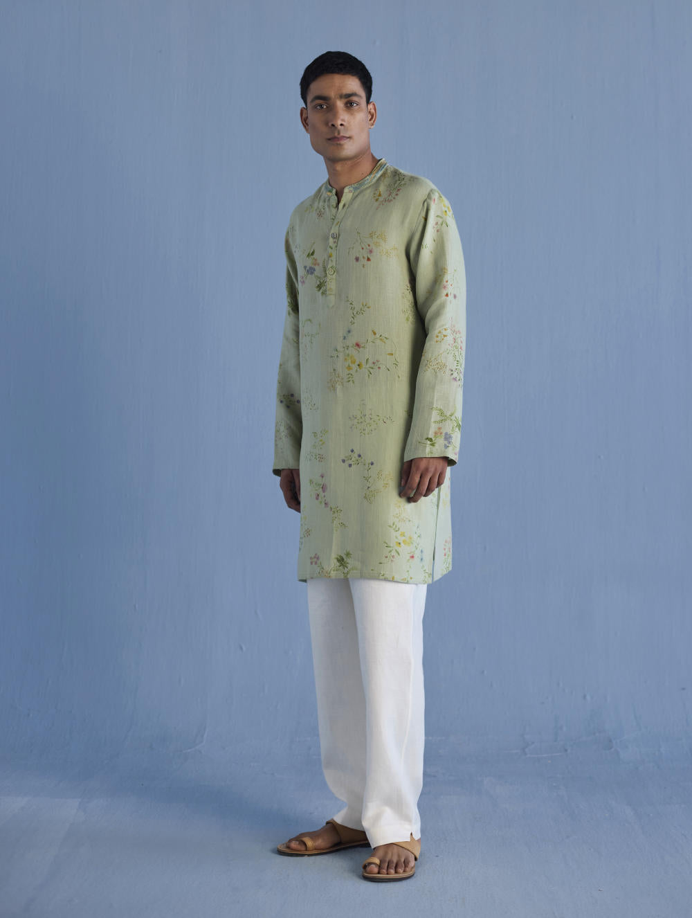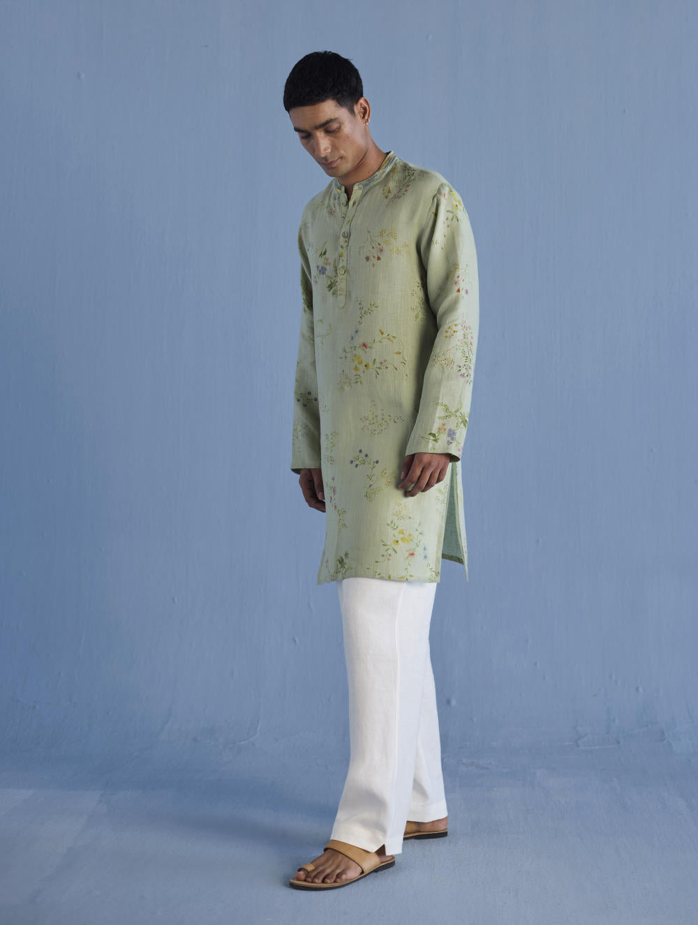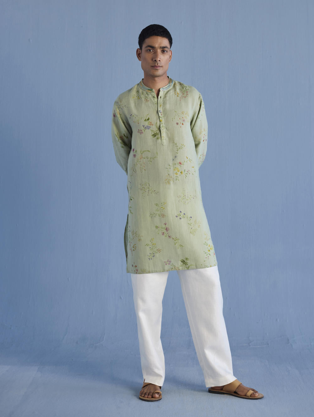 A statement, yet timeless, mandarin collared kurta in the softest pure yarn-dyed linen printed in a hand-painted watercolour floral print with a hand-embroidered collar with mixed silk threads and beads mimicking the brush strokes in colours derived from the floral print.