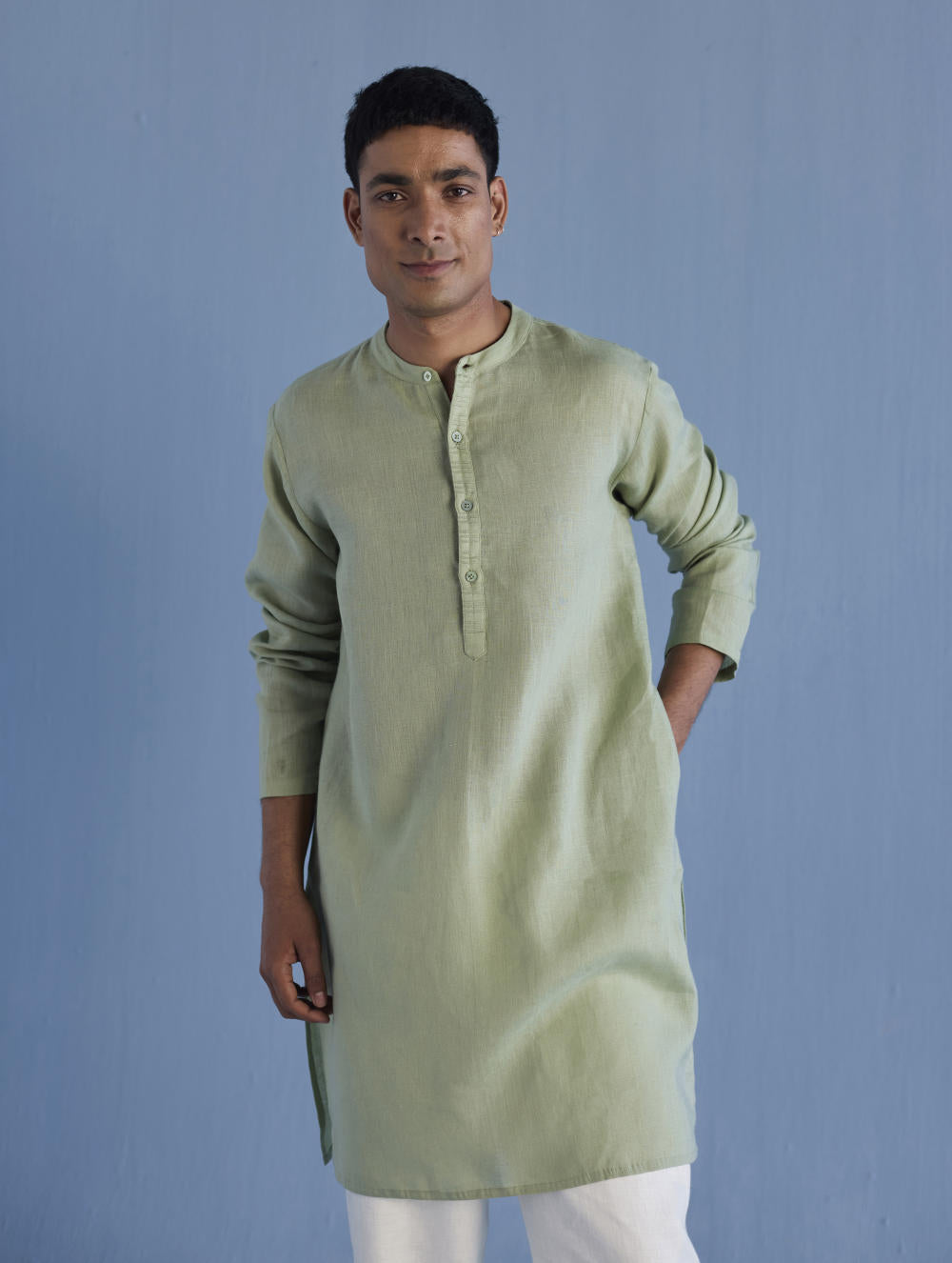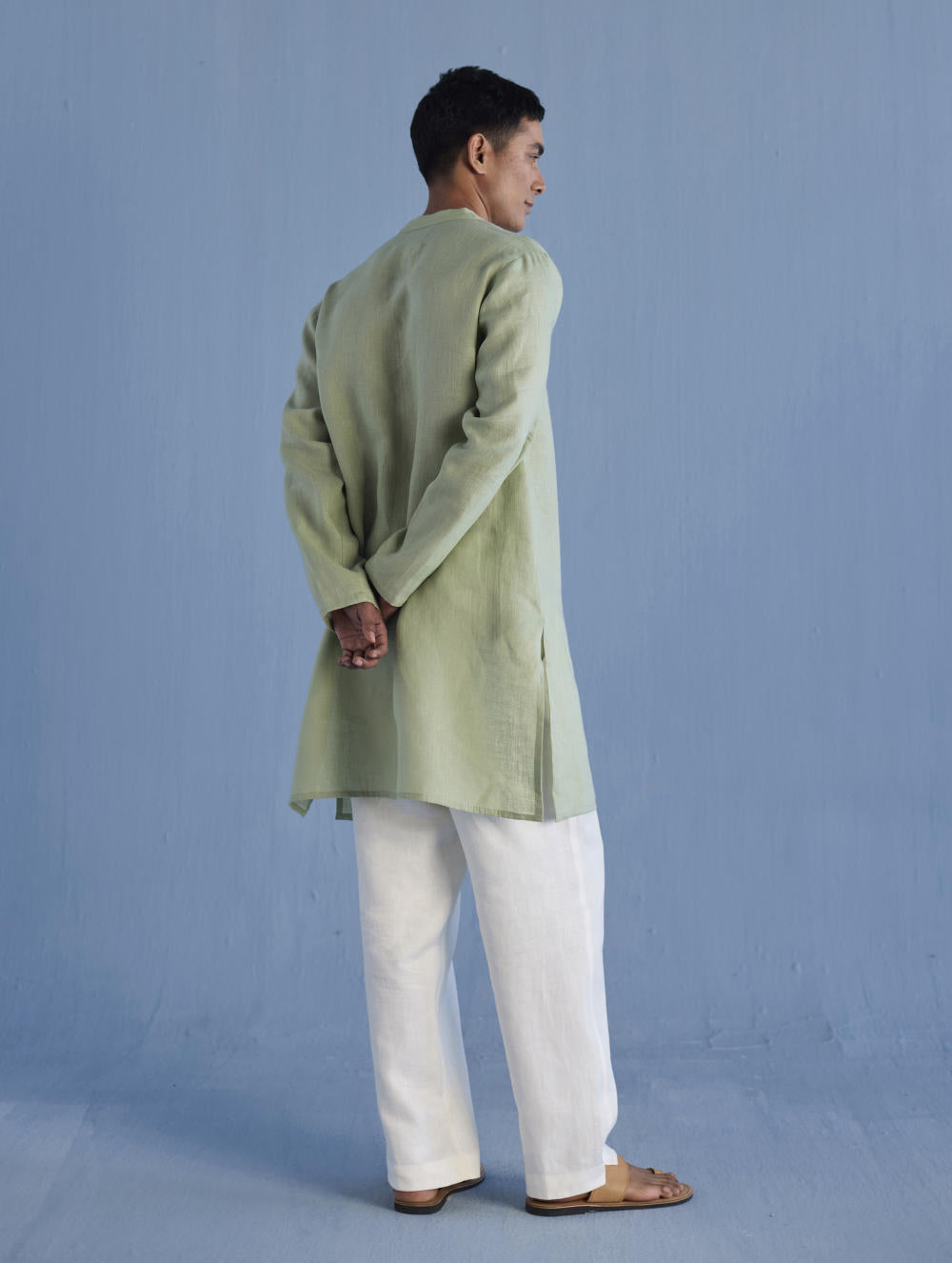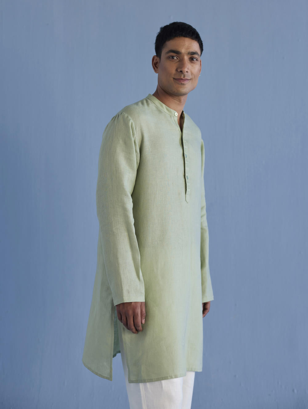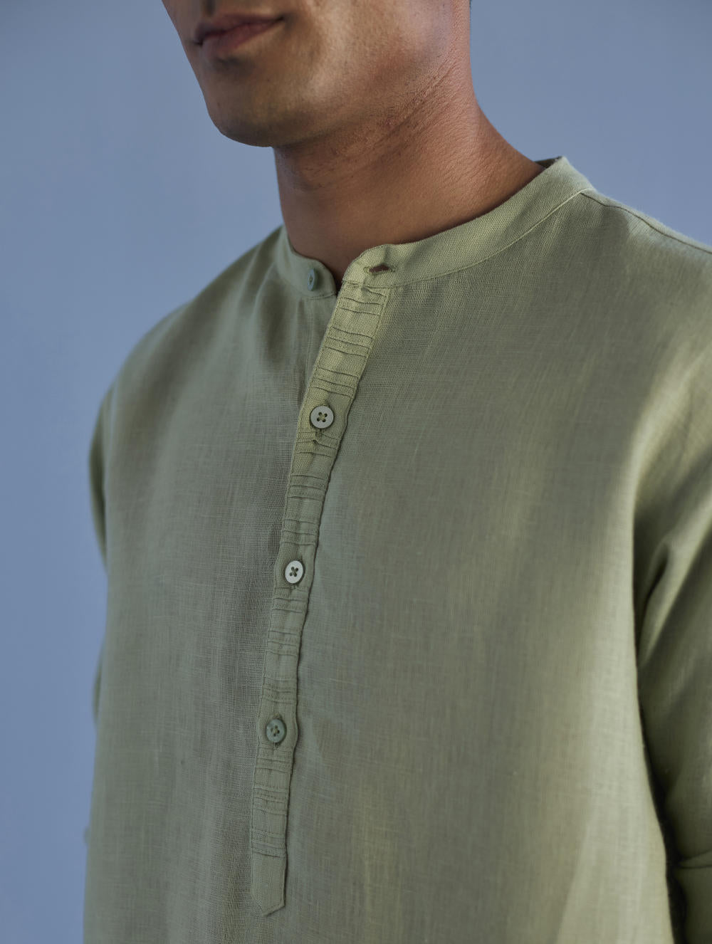 A classic mandarin collared shirt in soft pure yarn-dyed linen with fine hand pintucked details on the placket finished with tonal hand dyed buttons. Easy-to-wear and pair with denims or classic linen pants. Tailored thoughtfully for easy wearability and breathability.