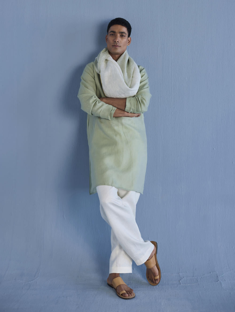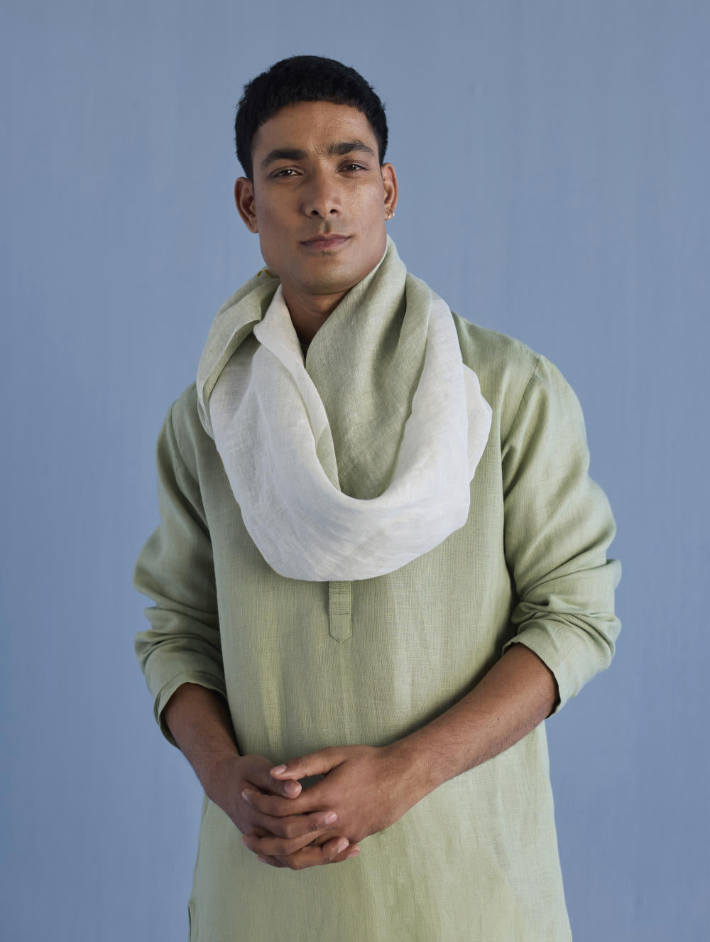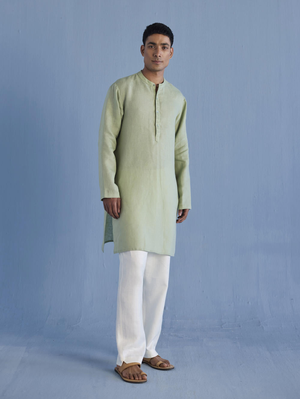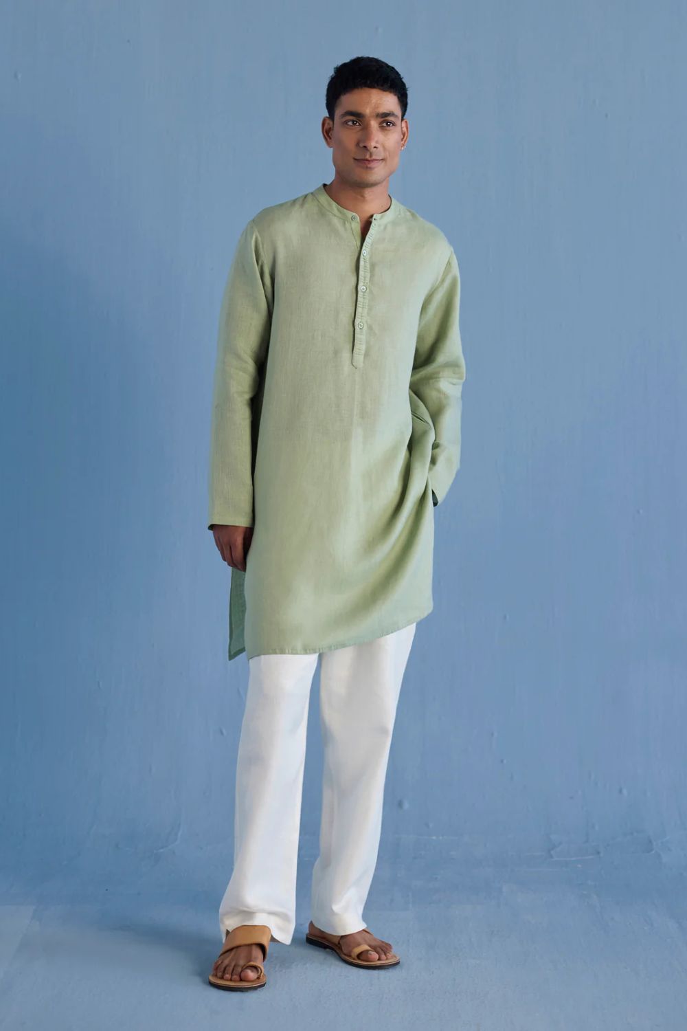 A classic mandarin collared shirt in soft pure yarn-dyed linen with fine hand pintucked details on the placket finished with tonal hand dyed buttons. Easy-to-wear and pair with denims or classic linen pants. Tailored thoughtfully for easy wearability and breathability.