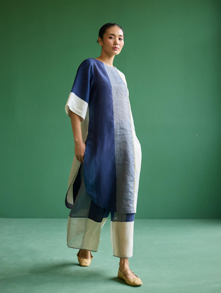 This Risa Kurta is designed in our soft signature handloom linen with a woven metallic border and stripes. The kurta is color-blocked using two signature linens in shades of ivory and shades of navy. With a relaxed fit, boat neck, pockets and 3/4th, the Risa Kurta is perfect for both casual outings and festive occasions, offering a perfect balance between comfort and style.