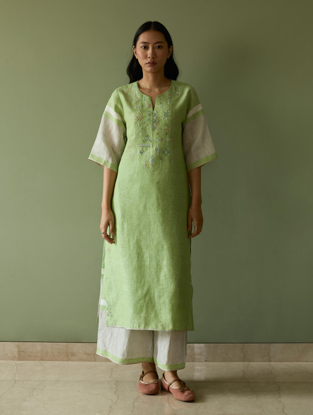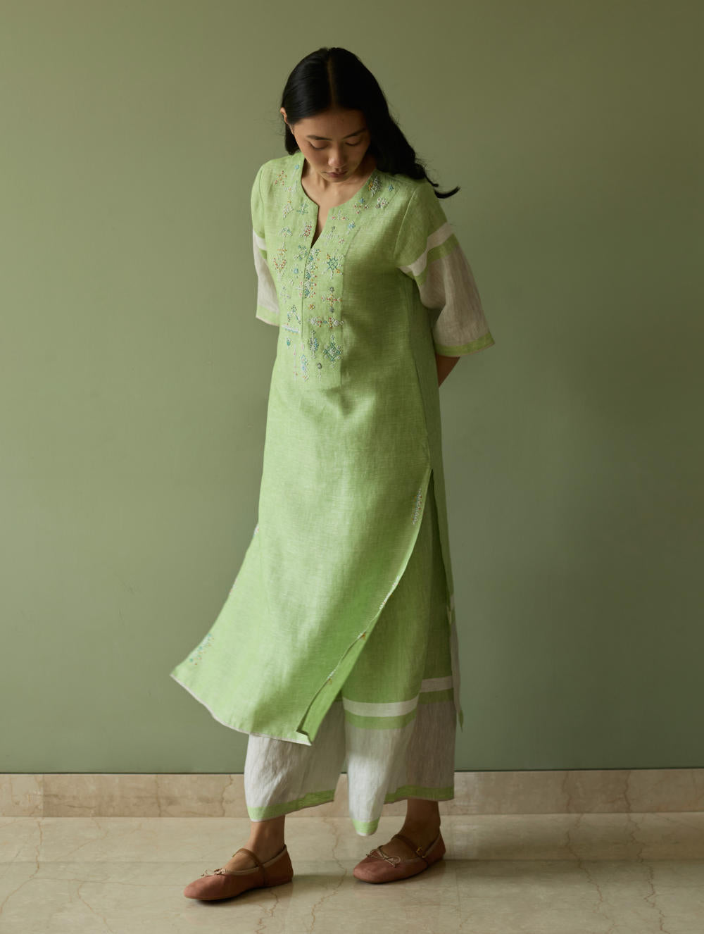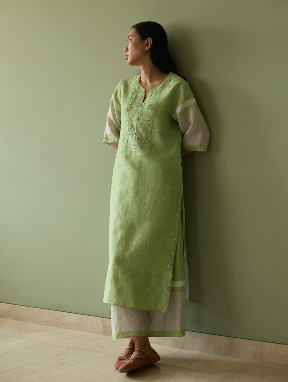 Kurta - A signature Manan kurta crafted from our soft handwoven metallic border linen with a soft grey selvedge. Hand-embroidered with intricate motifs, along the neckline and side slits, inspired by the timeless age-old Tangalia weave. The hand-embroidery is brought to life through meticulous multi-coloured french knots in threads and fine beadwork, creating a subtle pattern of texture and colour. Wear Vira with our flared pants for a statement, yet comfortable look.