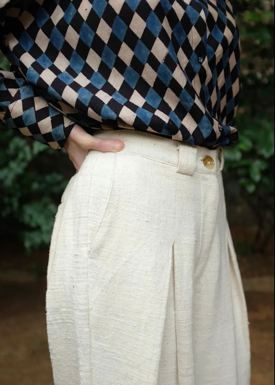 A timeless pant crafted using a heavyweight handspun handwoven indiginous cotton. Designed to form a barrel silhouette, two inverted box pleats fall from the waist and into large darts at the hem, creating a sculpted yet effortless look. A versatile staple with a fixed waistband at the front and elasticated back, wider than usual belt loops and pockets at the sides and back, large enough to sub a bag.