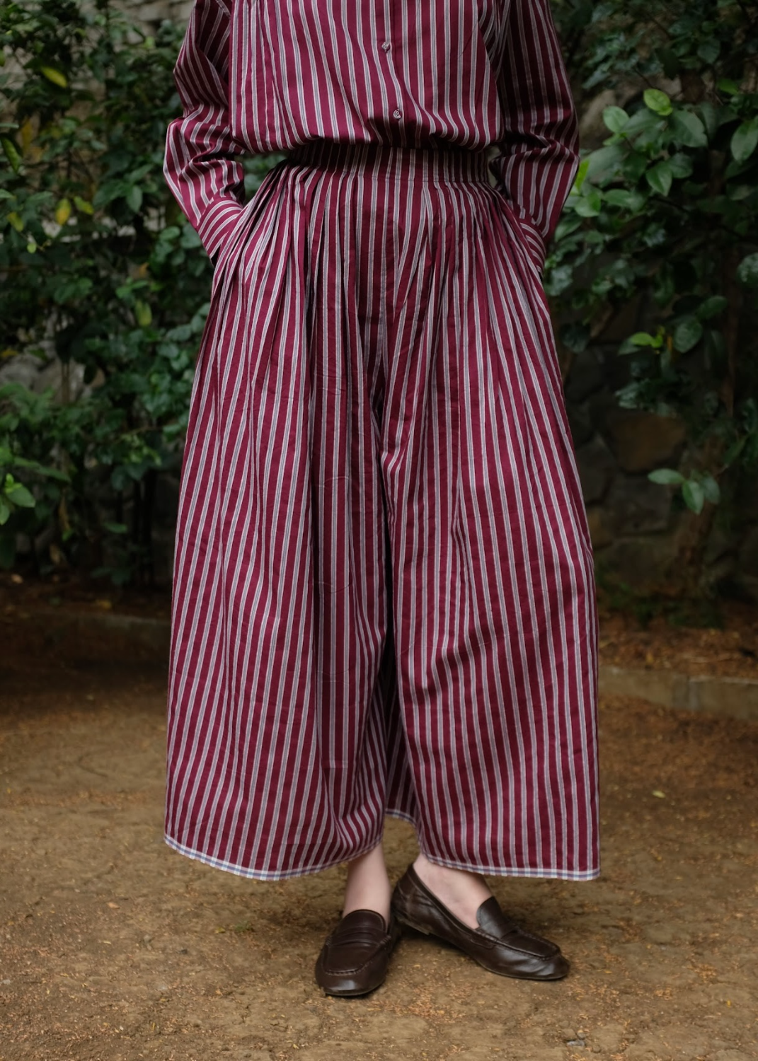 Crafted from handwoven cotton-silk stripes in a rich tone of wine, finished with a contrasting selvedge. These super-wide-leg pants flow like a skirt. Heavily pleated at the waist, with a side zip and pockets.