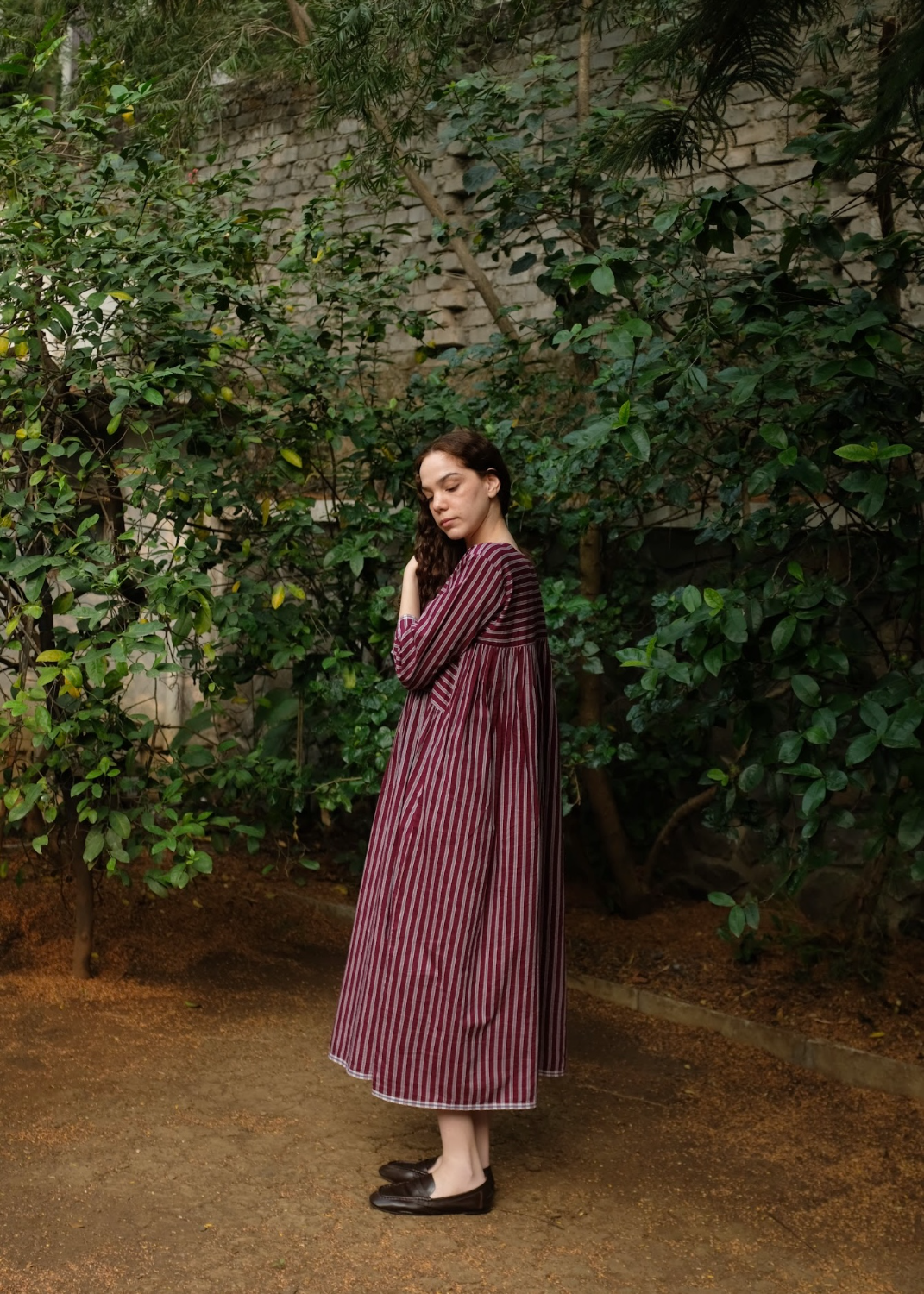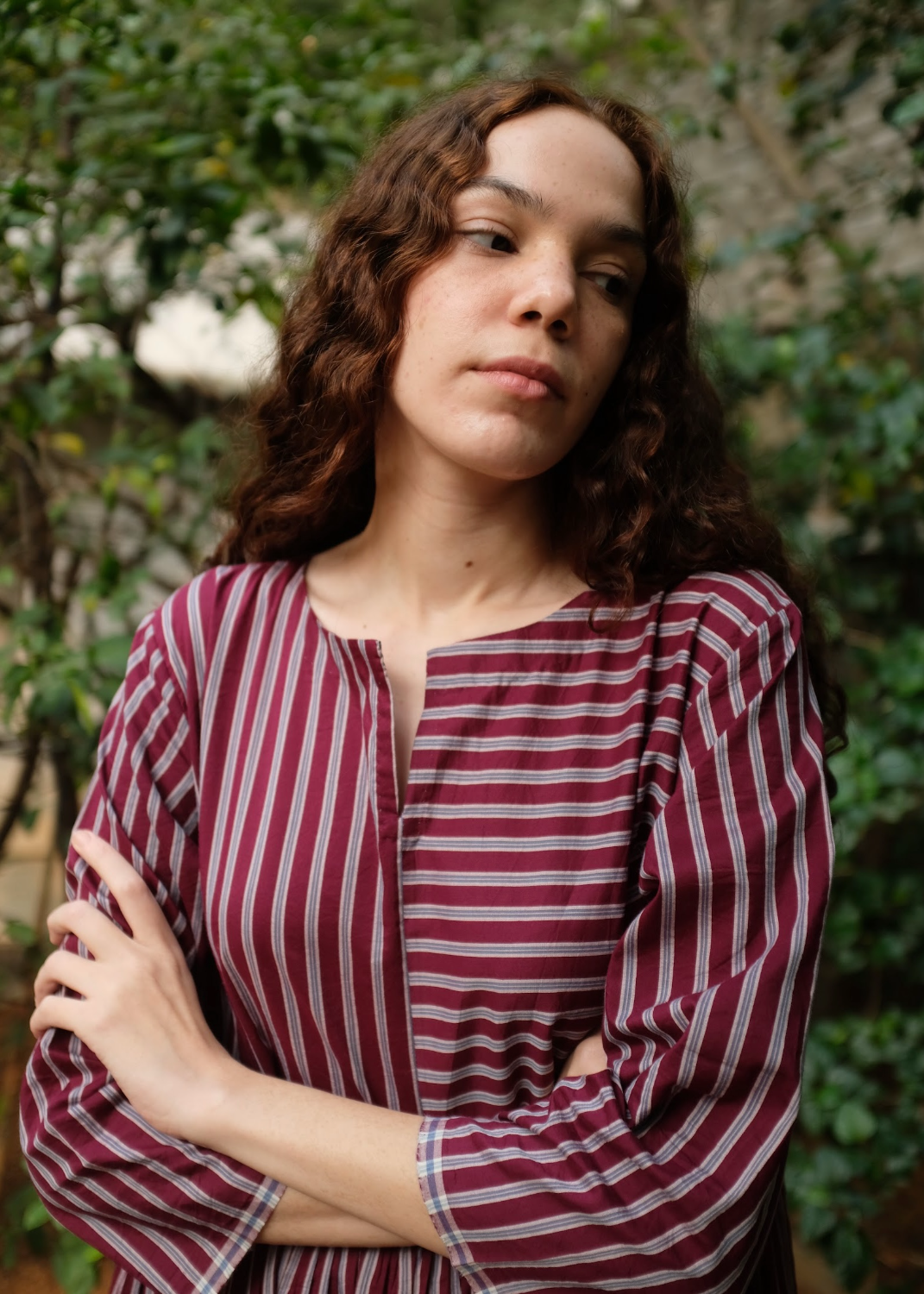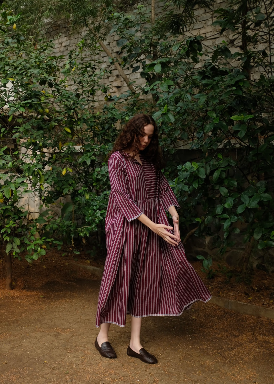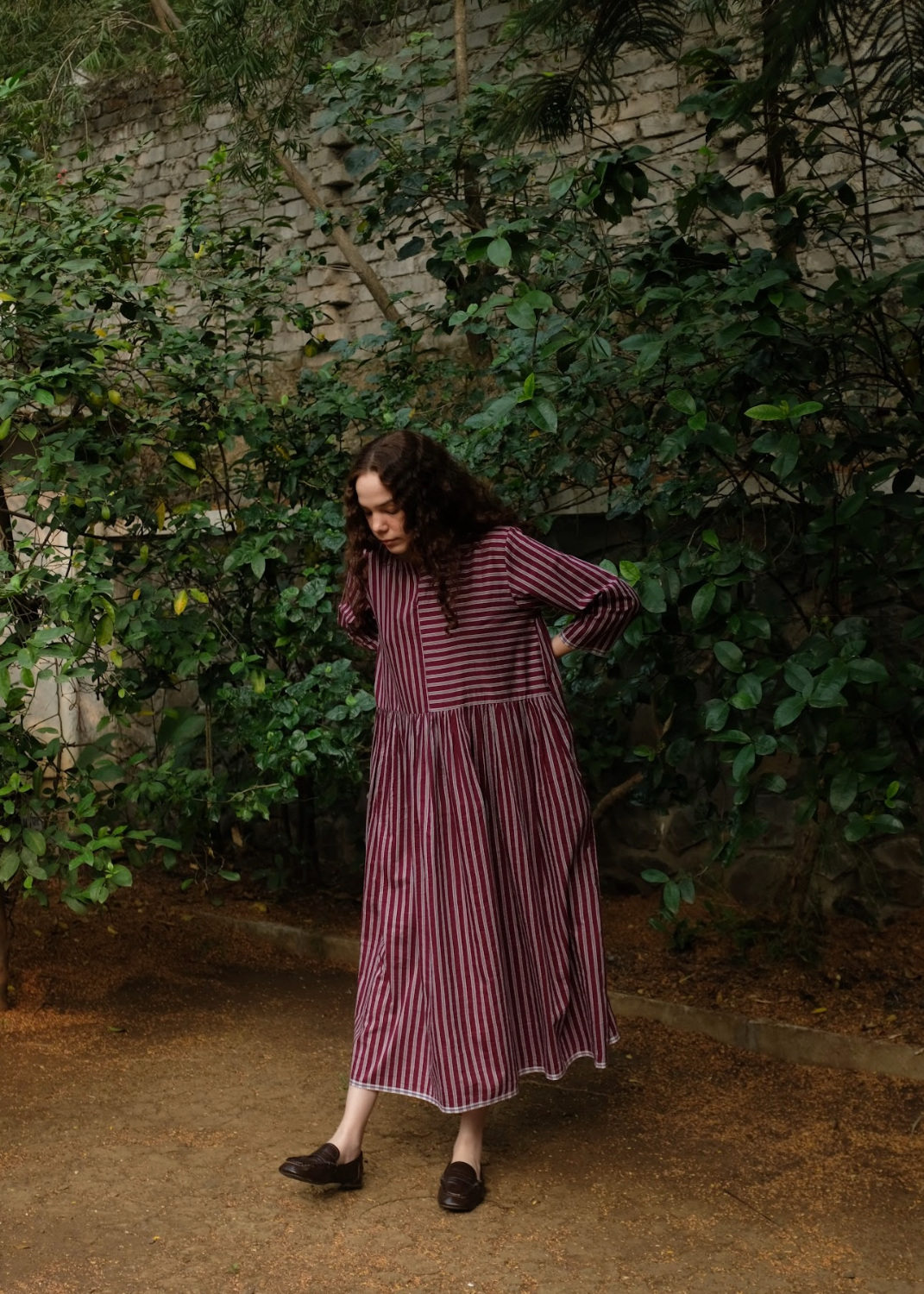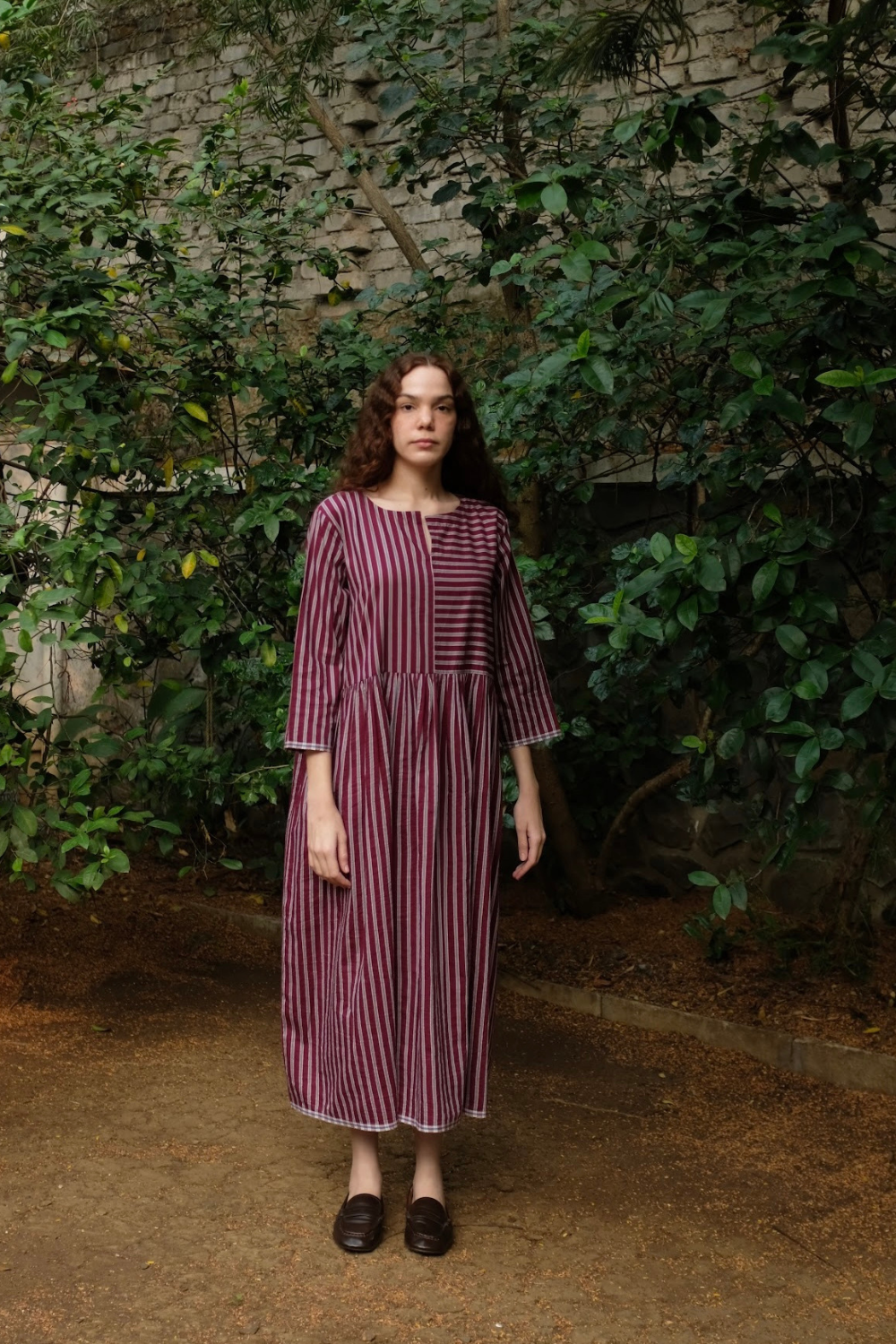 A beautiful wine striped dress with a playful front bodice that showcases an interesting play on stripes. The soft, flowy fabric and subtle design elements create a chic, relaxed style perfect for both casual and elevated looks. A Mason and Mill classic.