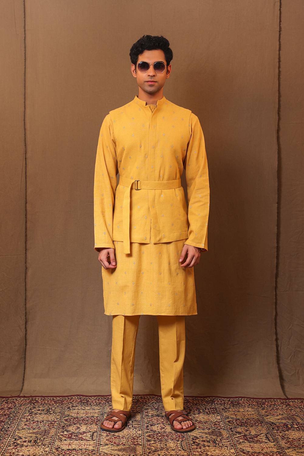 Bandi , kurta and pant set. Embroidered on handspun kala cotton this set comes with a belt. Total 4 pcs with the belt.