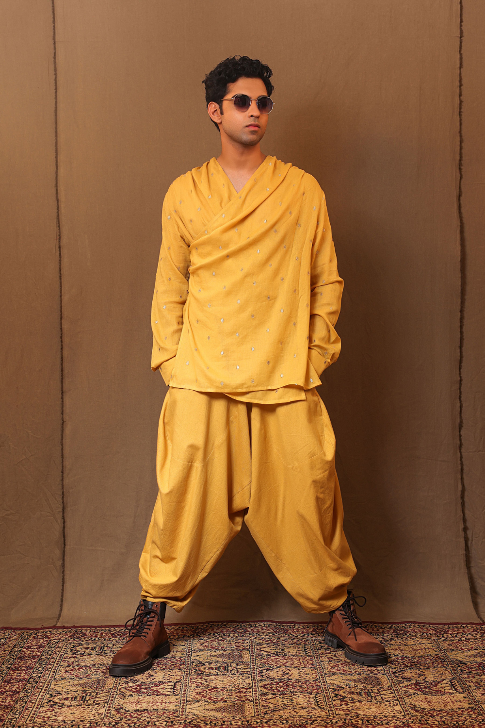 Overlap shirt made in embroidered handspun soft cotton. Side buttons and cuffs on the sleeves comes with baggy pants to complete the look.Total 2 pcs.