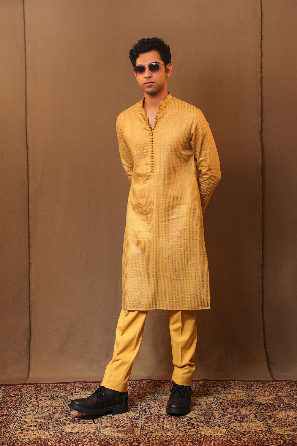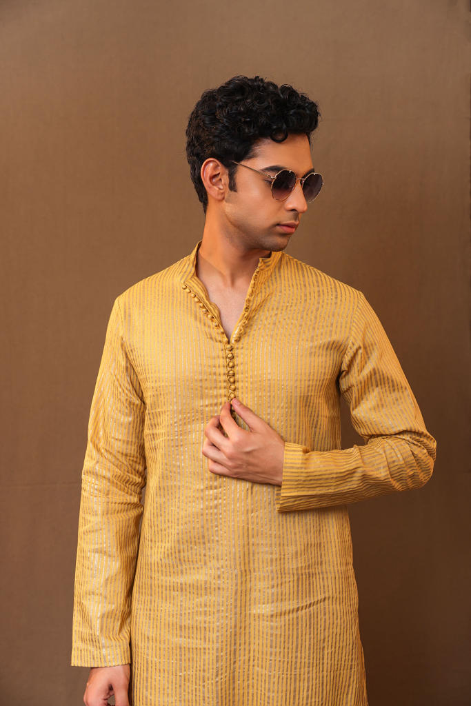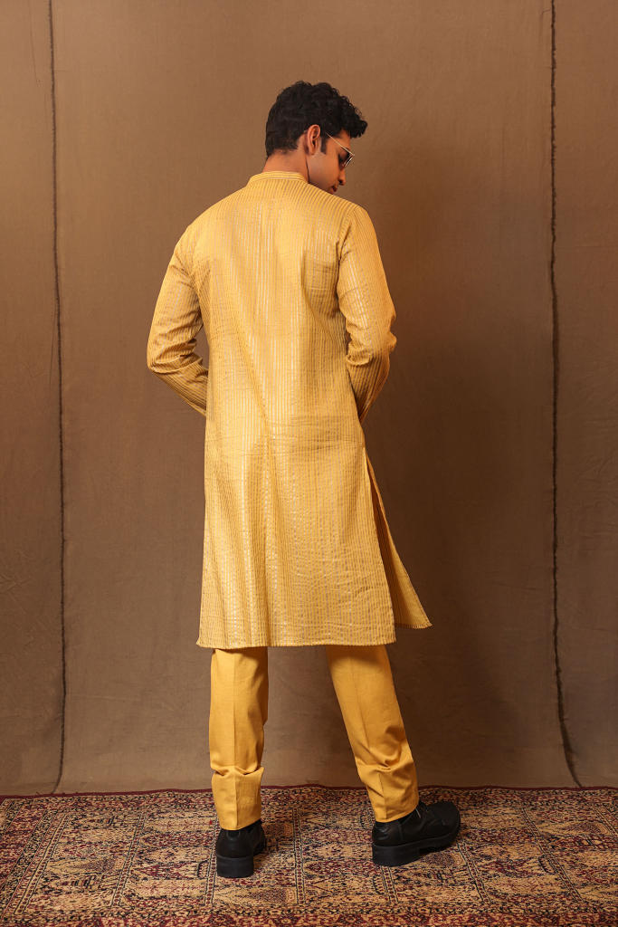 Buttined down kurta made with metallic striped handspun cotton. Team it up with the straight pants to complete the look.