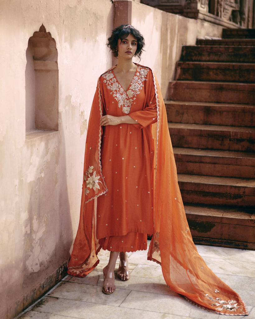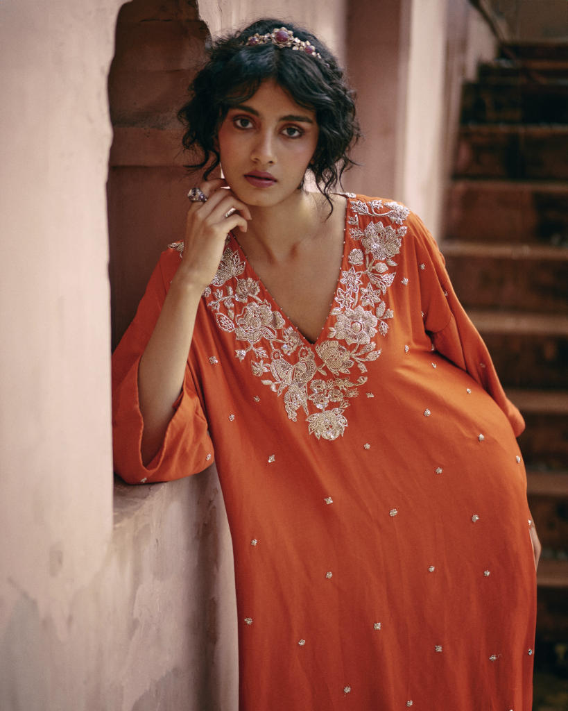 Every collection begins long before the garment is stitched: months of research into India’s rich craft traditions, followed by the painstaking creation of detailed illustrations. These artworks are then scanned, enhanced with jewel-toned palettes and touches of rich gold, and finally translated onto fabric. The result is a visual language so distinct that their name has become synonymous with print, colour, and the kind of glamour that still feels feather-light.