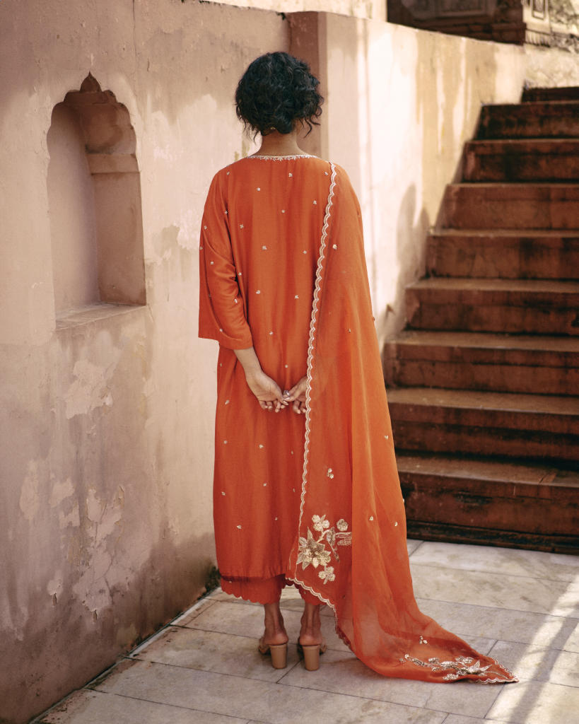 A burnt orange kurta set featuring a kaftan style kurta with all-over buttis and hand-embroidered chintz motifs on the neckline. The pants are flared and have scallop detailing and hand-embroidered buttis. The scalloped dupatta is hand-embroidered in zardozi and aari embroidery, and features our signature Roop Flip bird motif, making this ensemble timeless.