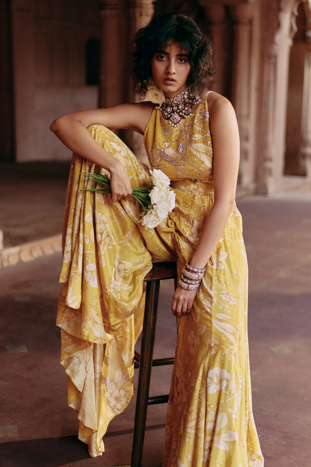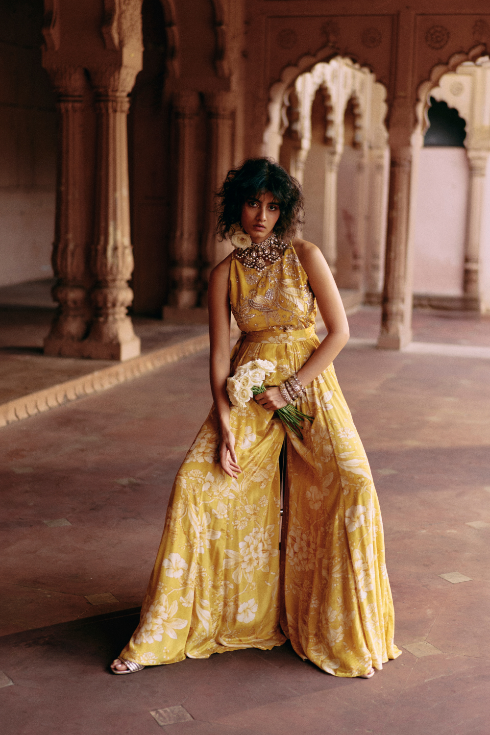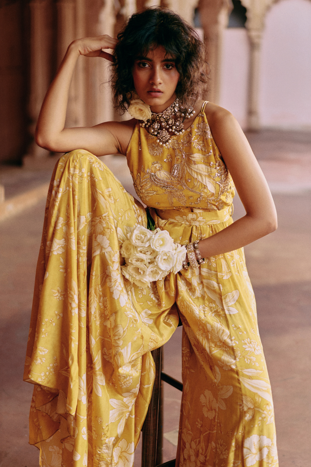 A tuscany yellow jumpsuit featuring our signature Roop flip bird print, featuring a pair of birds in their enchanting habitat. The print is enhanced with hand-embroidery in zardozi and aari work and the look is complete with a printed belt.