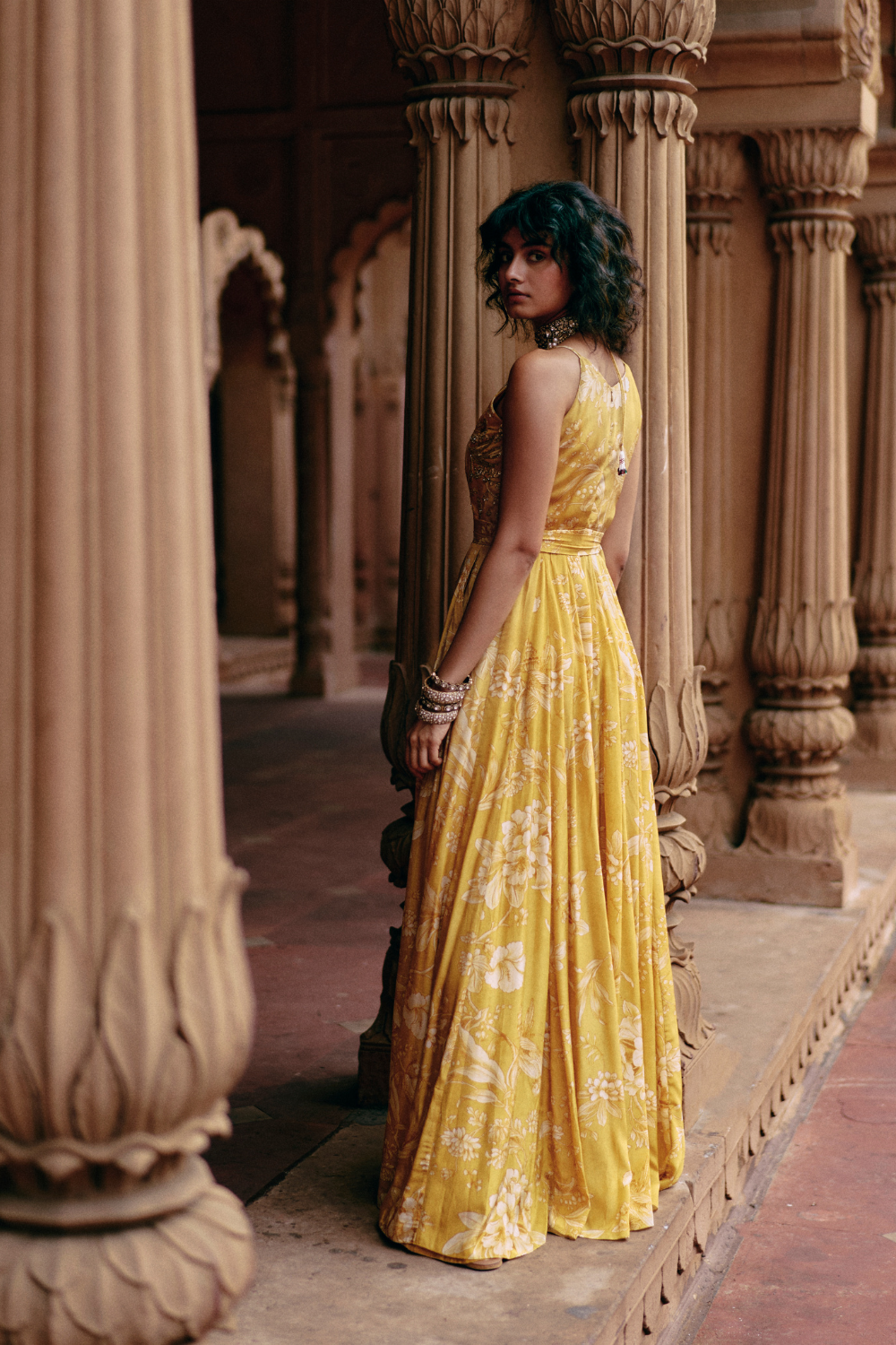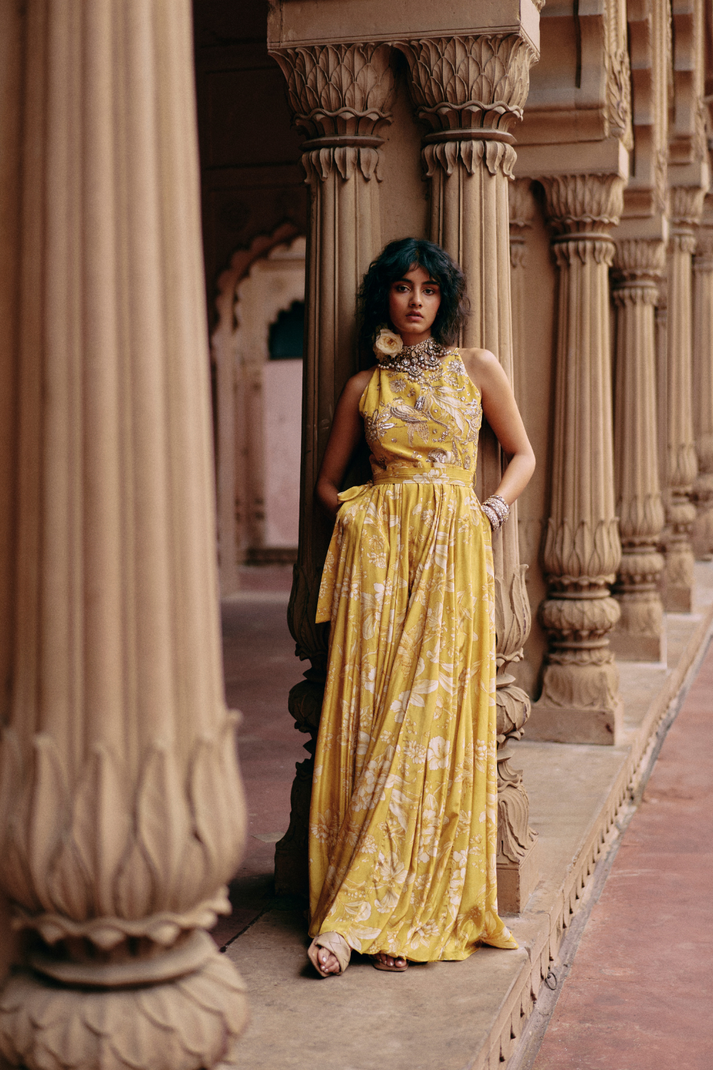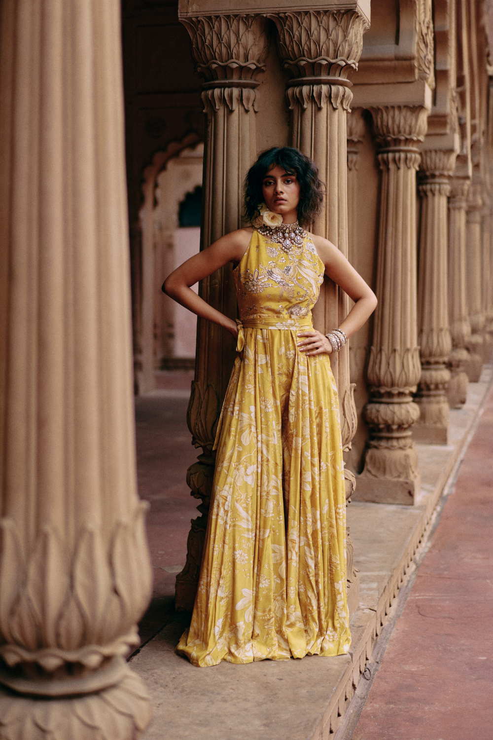A tuscany yellow jumpsuit featuring our signature Roop flip bird print, featuring a pair of birds in their enchanting habitat. The print is enhanced with hand-embroidery in zardozi and aari work and the look is complete with a printed belt.