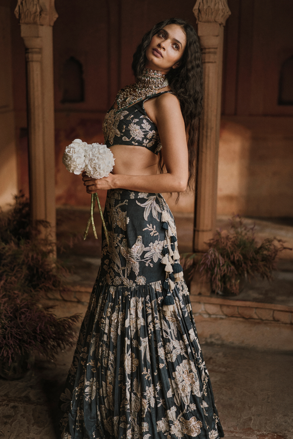 A romantic fish cut lehenga in our signature Roop flip bird print, featuring a pair of birds in their enchanting habitat. Hand–embroidered in mixed techniques, the print truly sings.It is paired with a U cut sleeveless blouse, featuring ornate hand-embroidery and an organza dupatta with scallops and delicate buttis.
