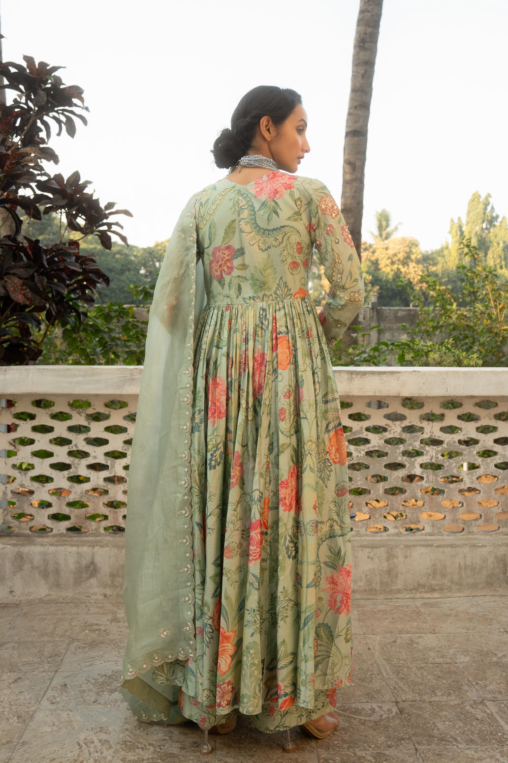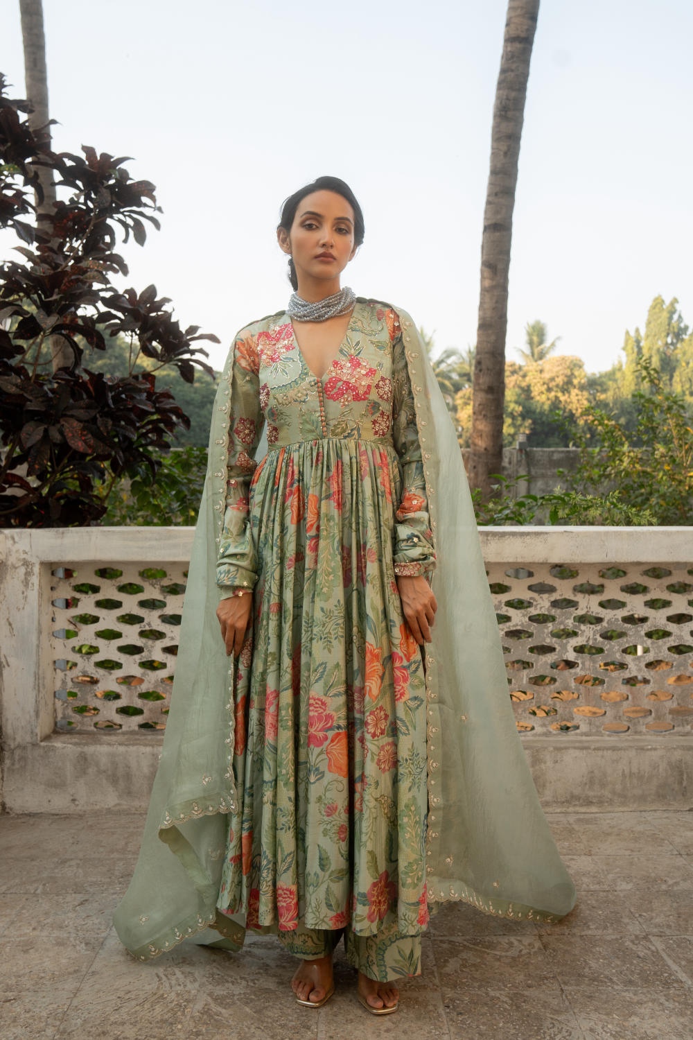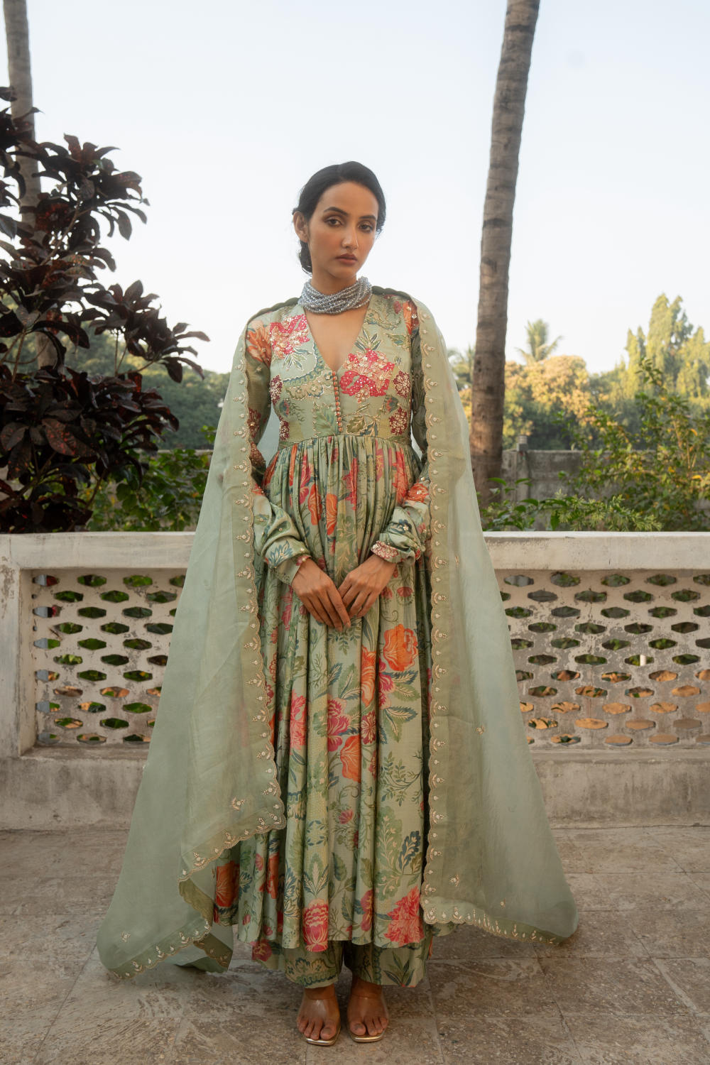 Featuring this V-neck print embroidered anarkali set in our signature floral print. It has hand embroidered details. The look is completed with an embroidered dupatta and pants.
