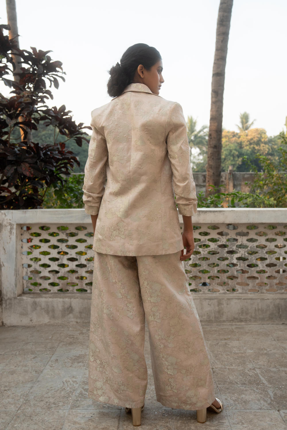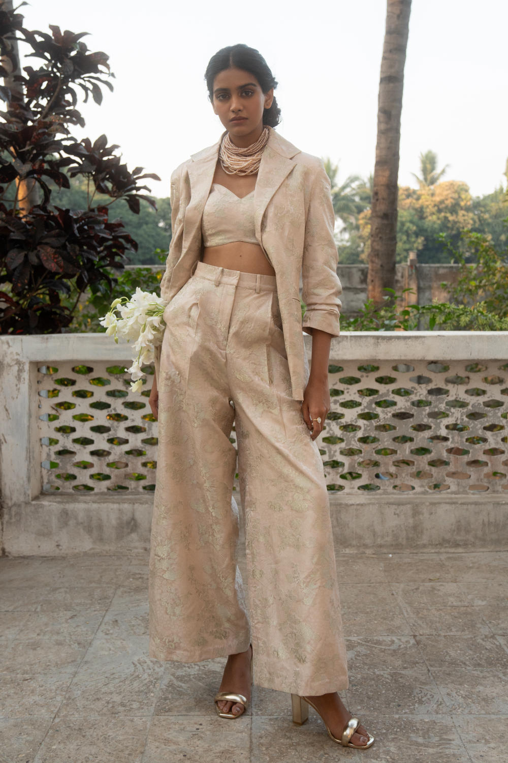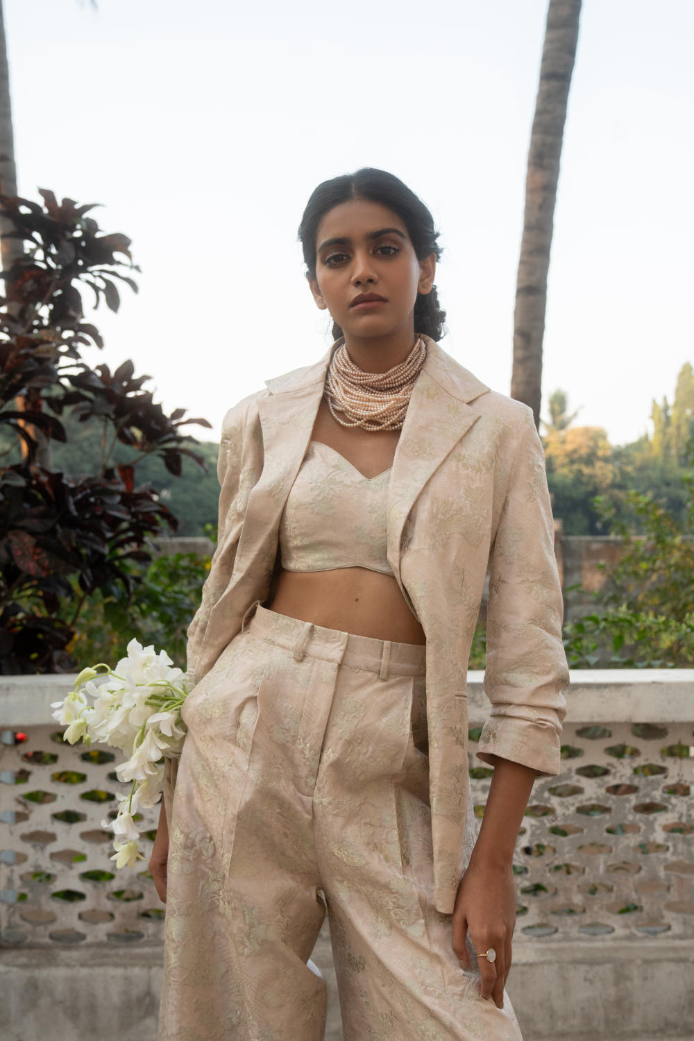 Featuring the russian selfwoven silver jacquard blazer set, it is adorned with floral jaal overall. It is paired with bustier and pants.