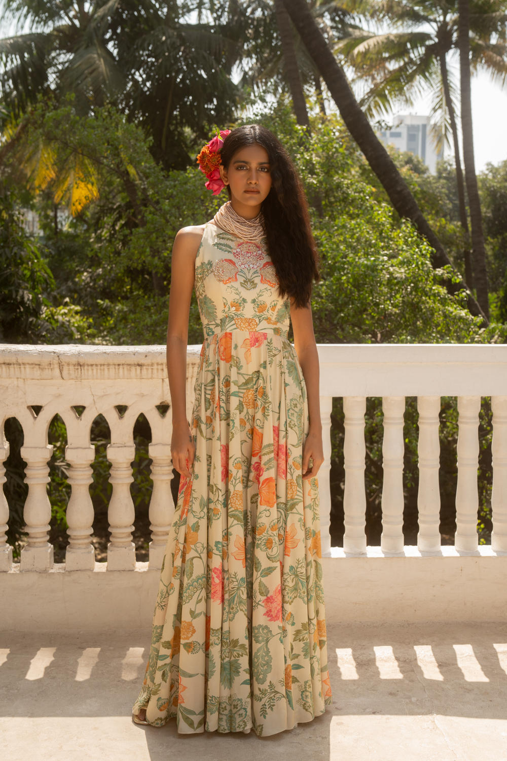 Every collection begins long before the garment is stitched: months of research into India’s rich craft traditions, followed by the painstaking creation of detailed illustrations. These artworks are then scanned, enhanced with jewel-toned palettes and touches of rich gold, and finally translated onto fabric. The result is a visual language so distinct that their name has become synonymous with print, colour, and the kind of glamour that still feels feather-light.