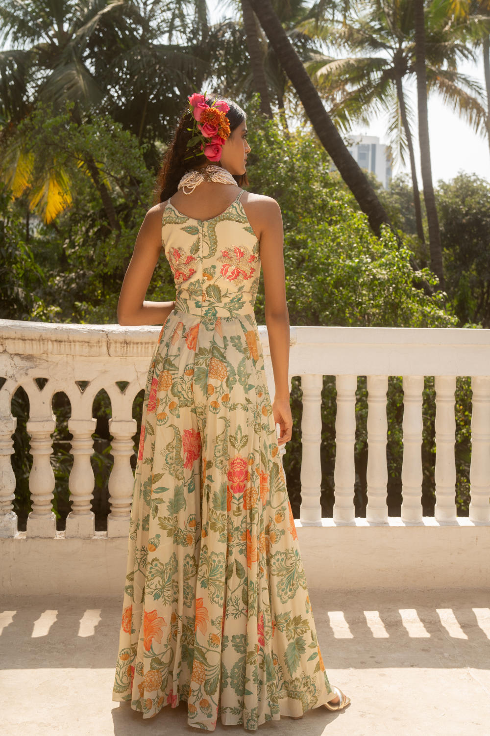 Featuring our signature floral printed jumpsuit, it is embellished using zardosi emb. Perfect for your day events.