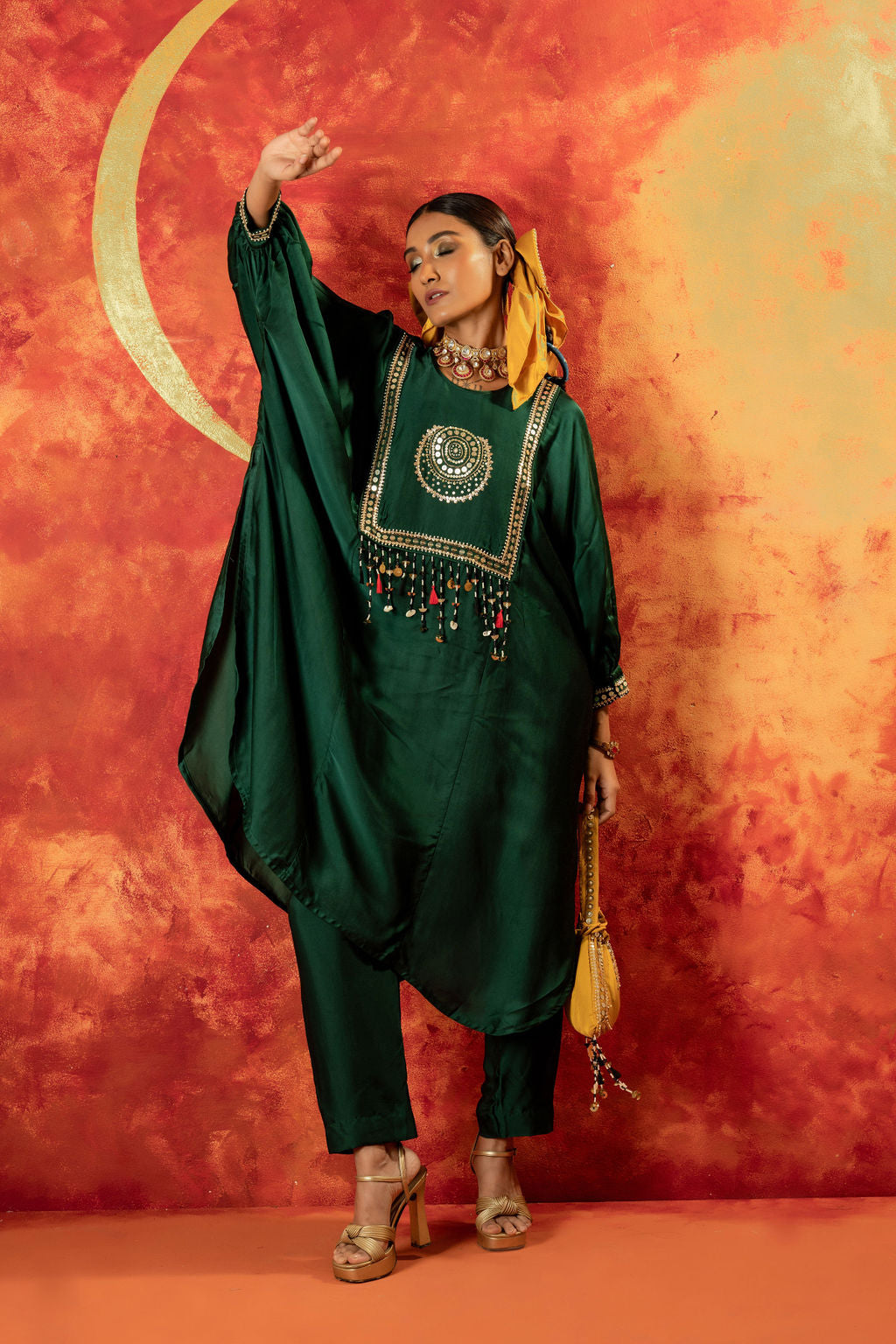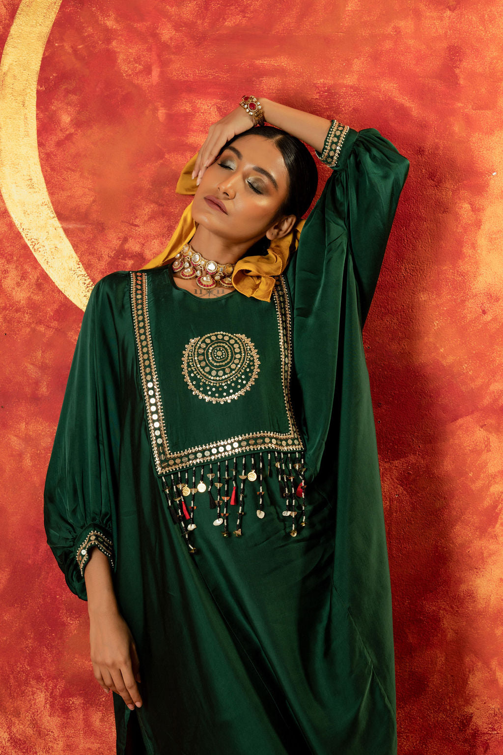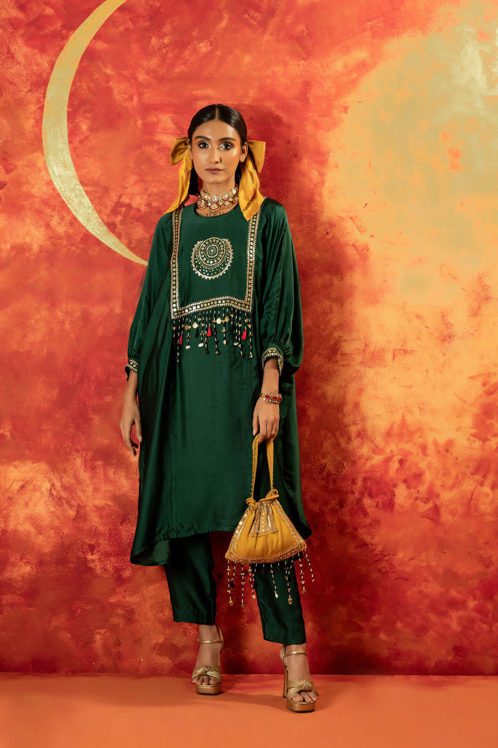 This anti-fit kurta and straight slim pants set in vegan satin showcases a signature Luna motif for an ornamental touch. Featuring bat-style sleeves, hand embroidery, and mirror-like sequin detailing, it’s perfect for festive & pre-wedding occasions, blending traditional craftsmanship with modern elegance
