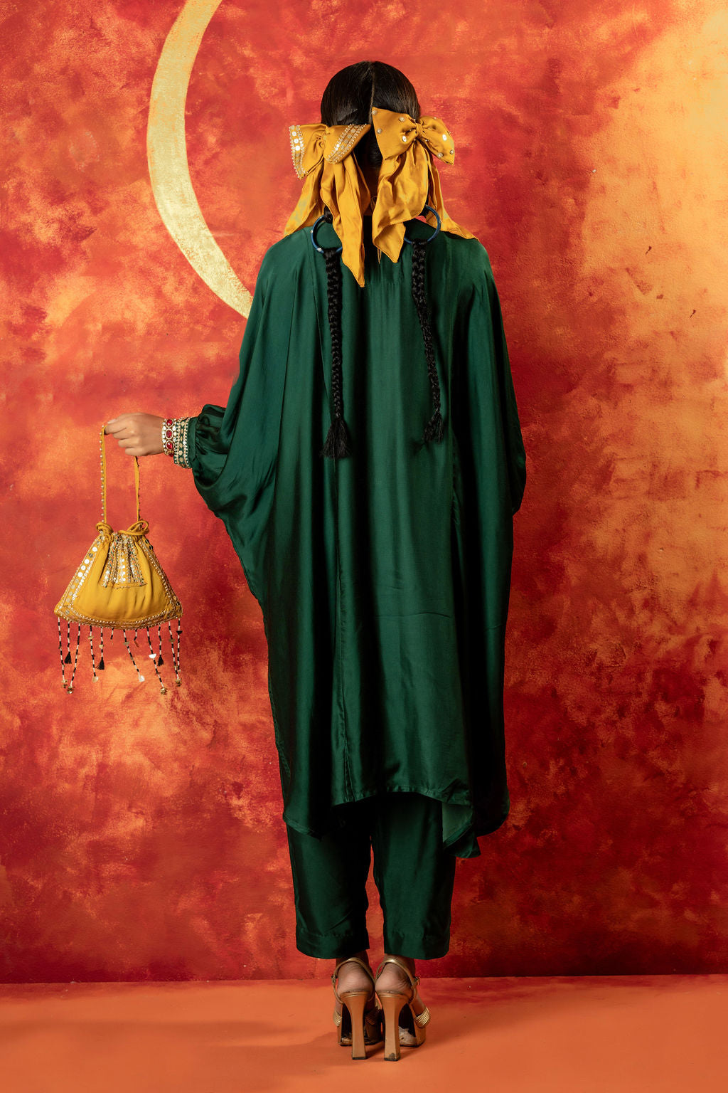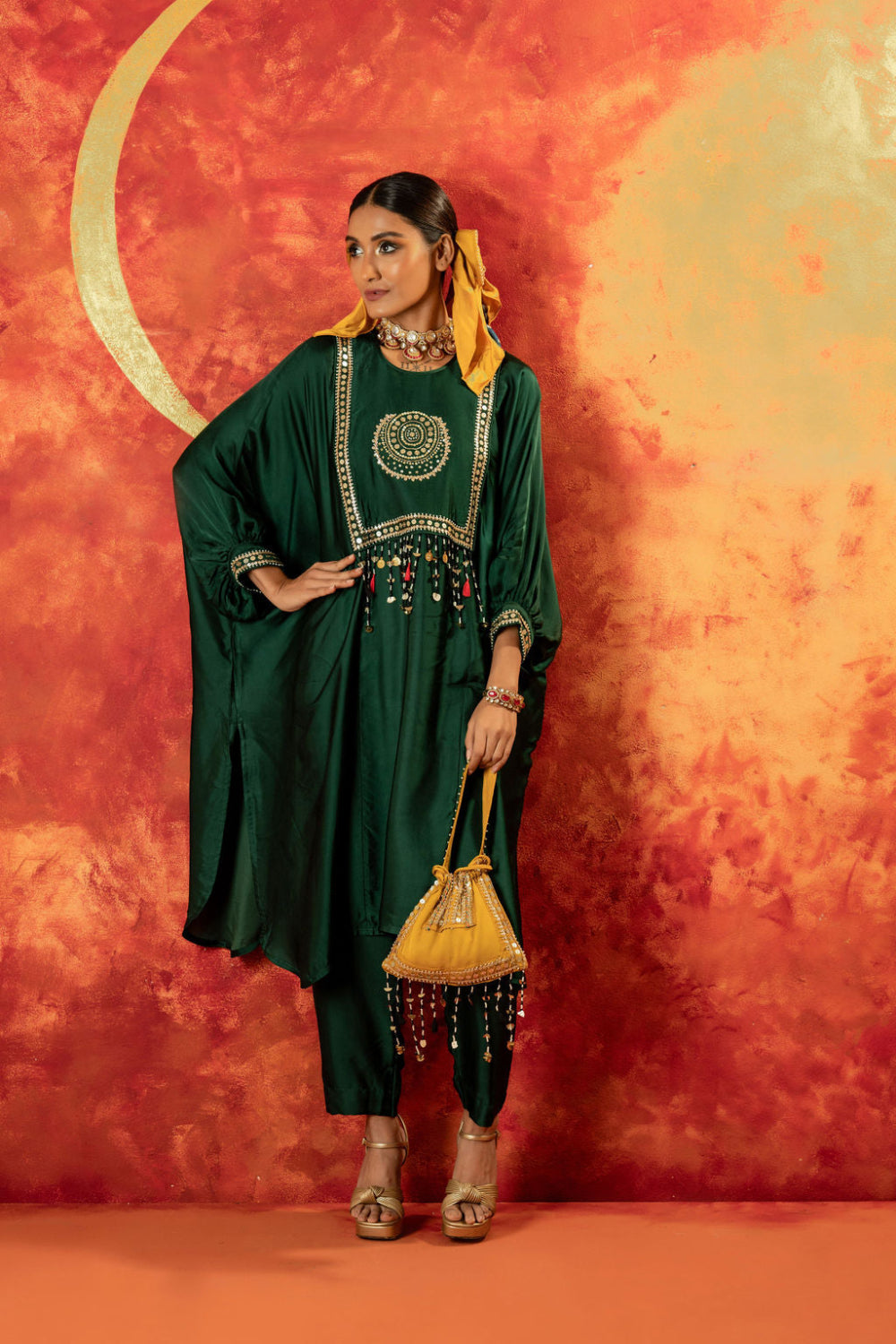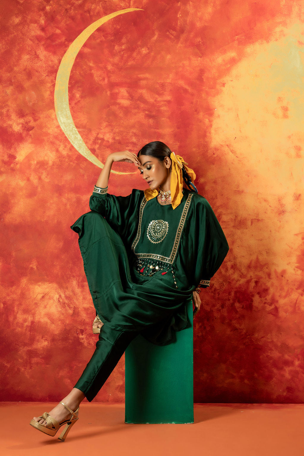 This anti-fit kurta and straight slim pants set in vegan satin showcases a signature Luna motif for an ornamental touch. Featuring bat-style sleeves, hand embroidery, and mirror-like sequin detailing, it’s perfect for festive & pre-wedding occasions, blending traditional craftsmanship with modern elegance
