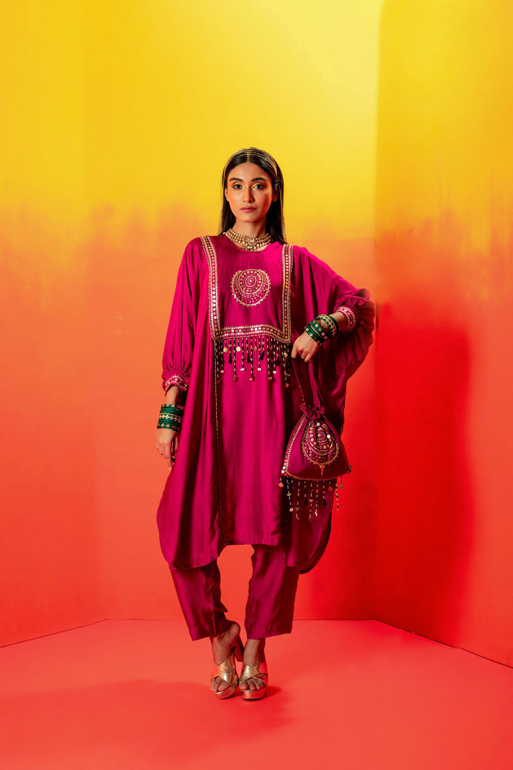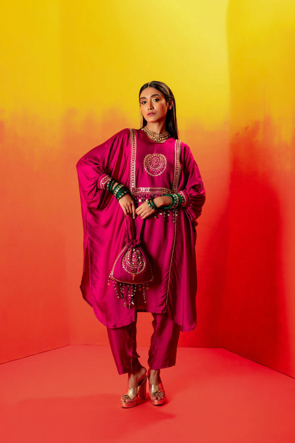 This anti-fit kurta and straight slim pants set in vegan satin features a stunning signature Luna motif for an ornamental finish. Designed with bat-style sleeves and enhanced by intricate hand embroidery, it showcases light gold sequin and pearl bead detailing. Perfect for festive and pre-wedding occasions, this outfit seamlessly blends traditional craftsmanship with modern elegance, offering a stylish choice for any celebration
