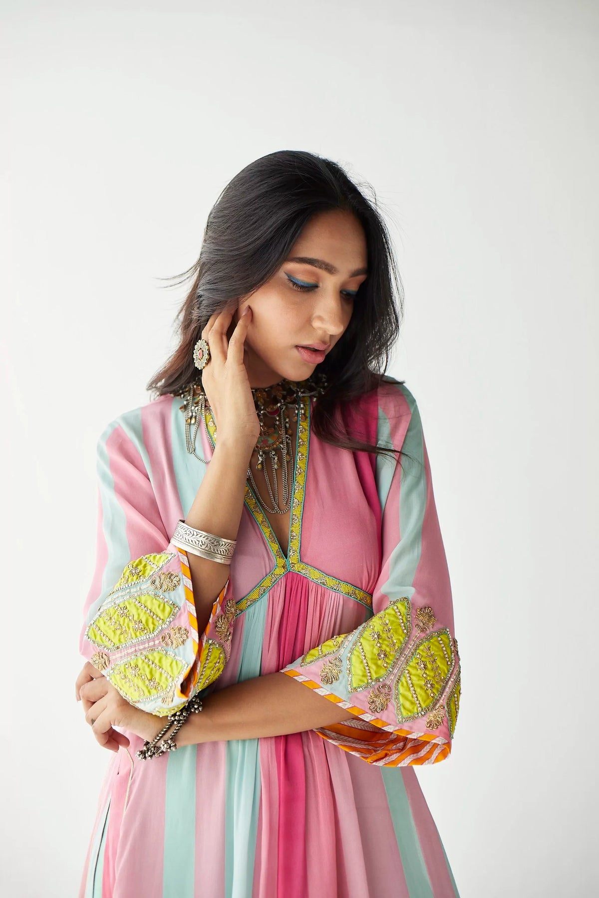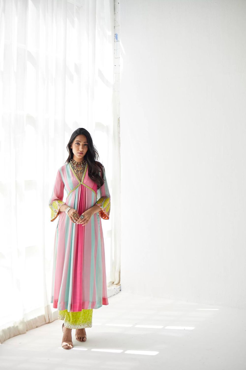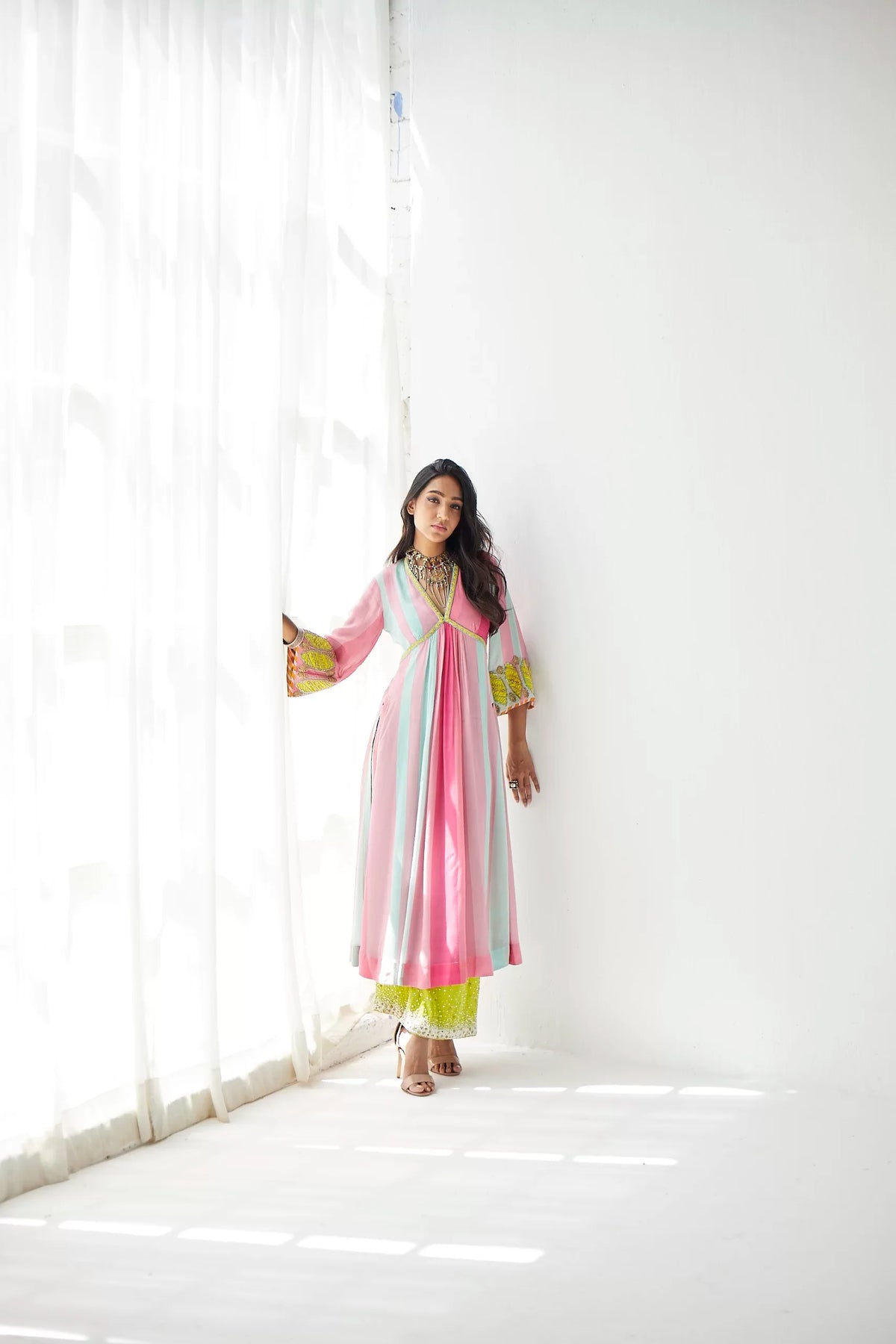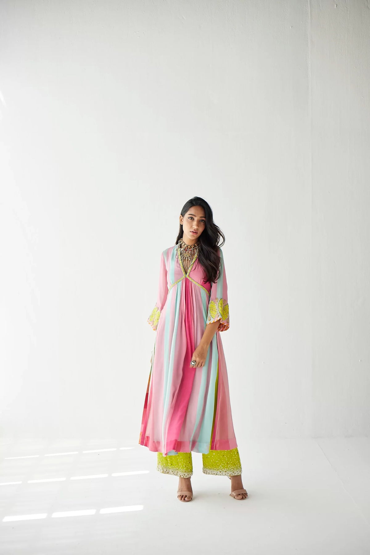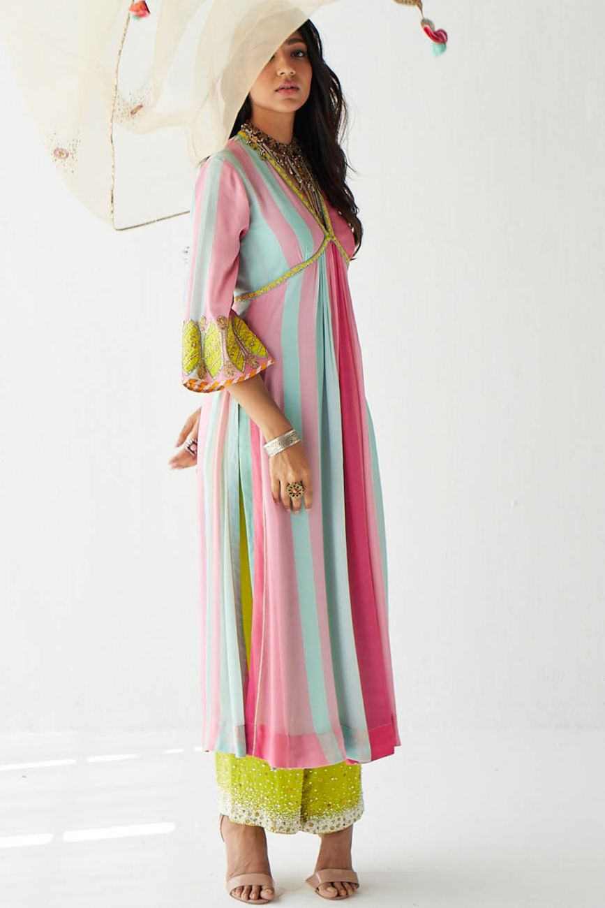 Bright pink – Powder blue printed striped crepe A-line kurta with hand embroidered neck and bell sleeves paired with lime green pearl hand embroidered palazzo.