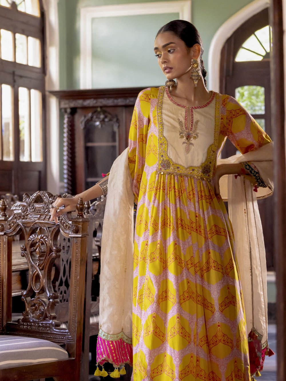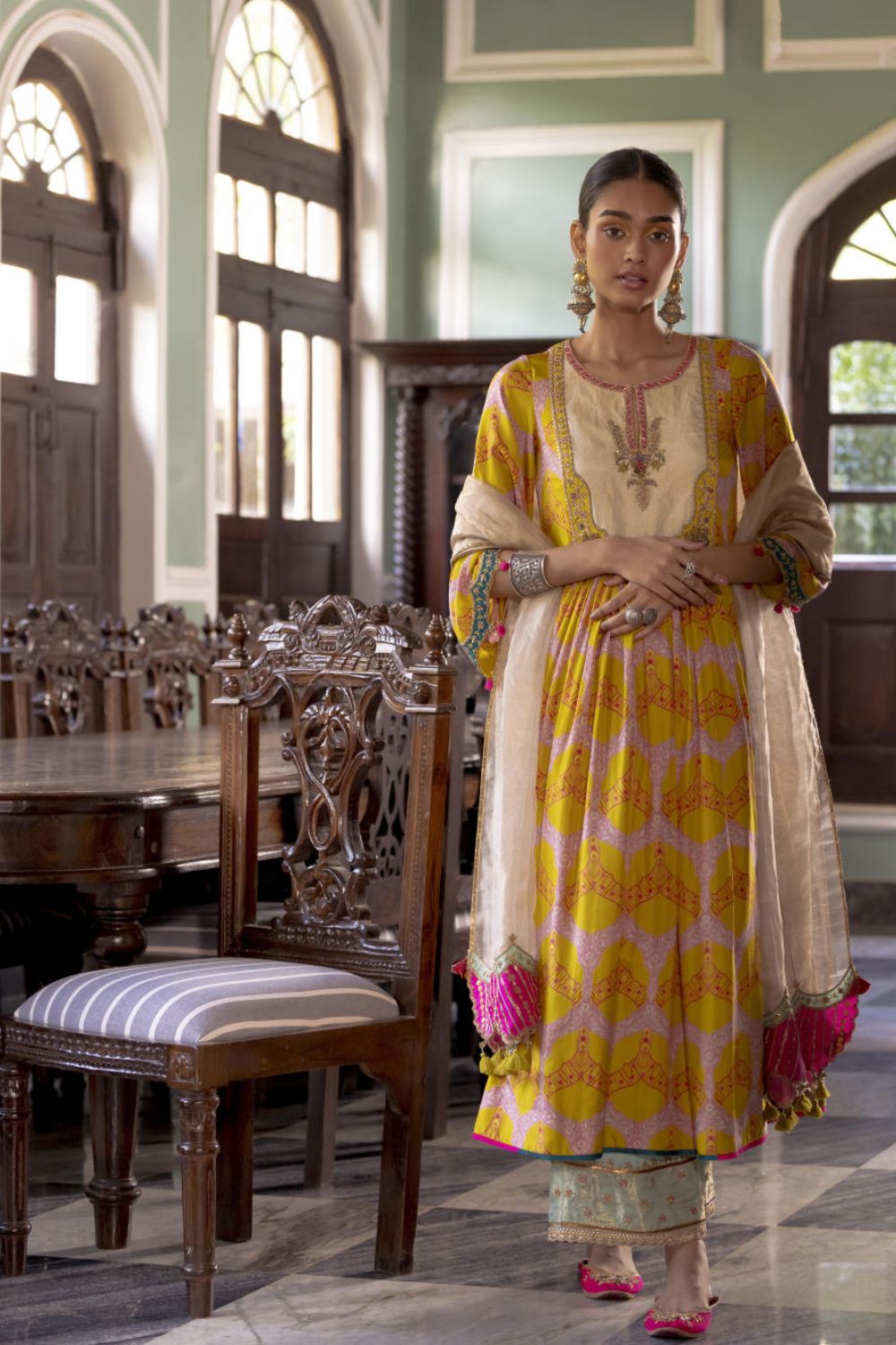 Lime Yellow printed silk front puckering kurta with intricate hand embroidered yoke and sleeves. Paired with hand embroidered Powder Blue palazzo and Ivory tissue organza dupatta with tassel detailing.