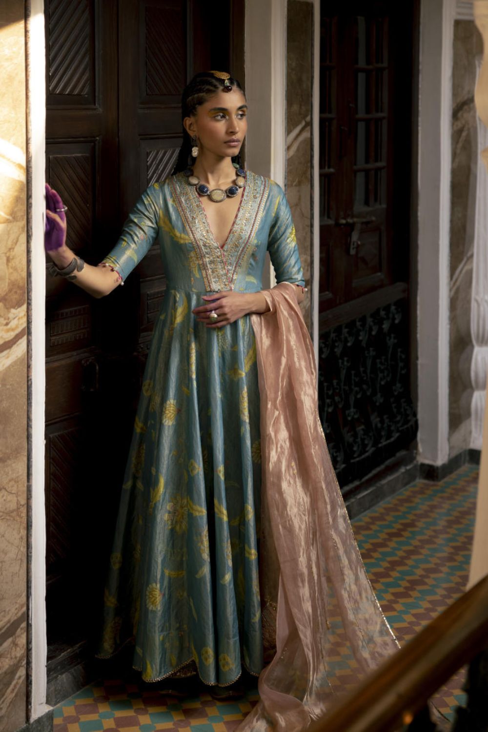 Moonlight blue full length printed tissue silk Anarkali with intricate embroidered neckline and scalloped hem , detailed with tassels on sleeves.Paired with Nude pink tissue hand embroidered dupatta with tassel detailing .