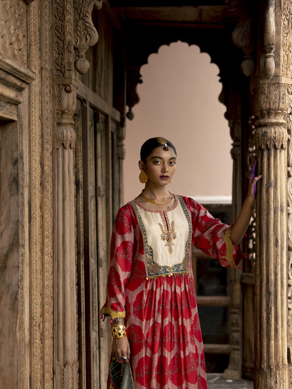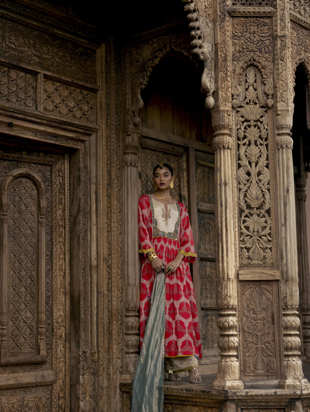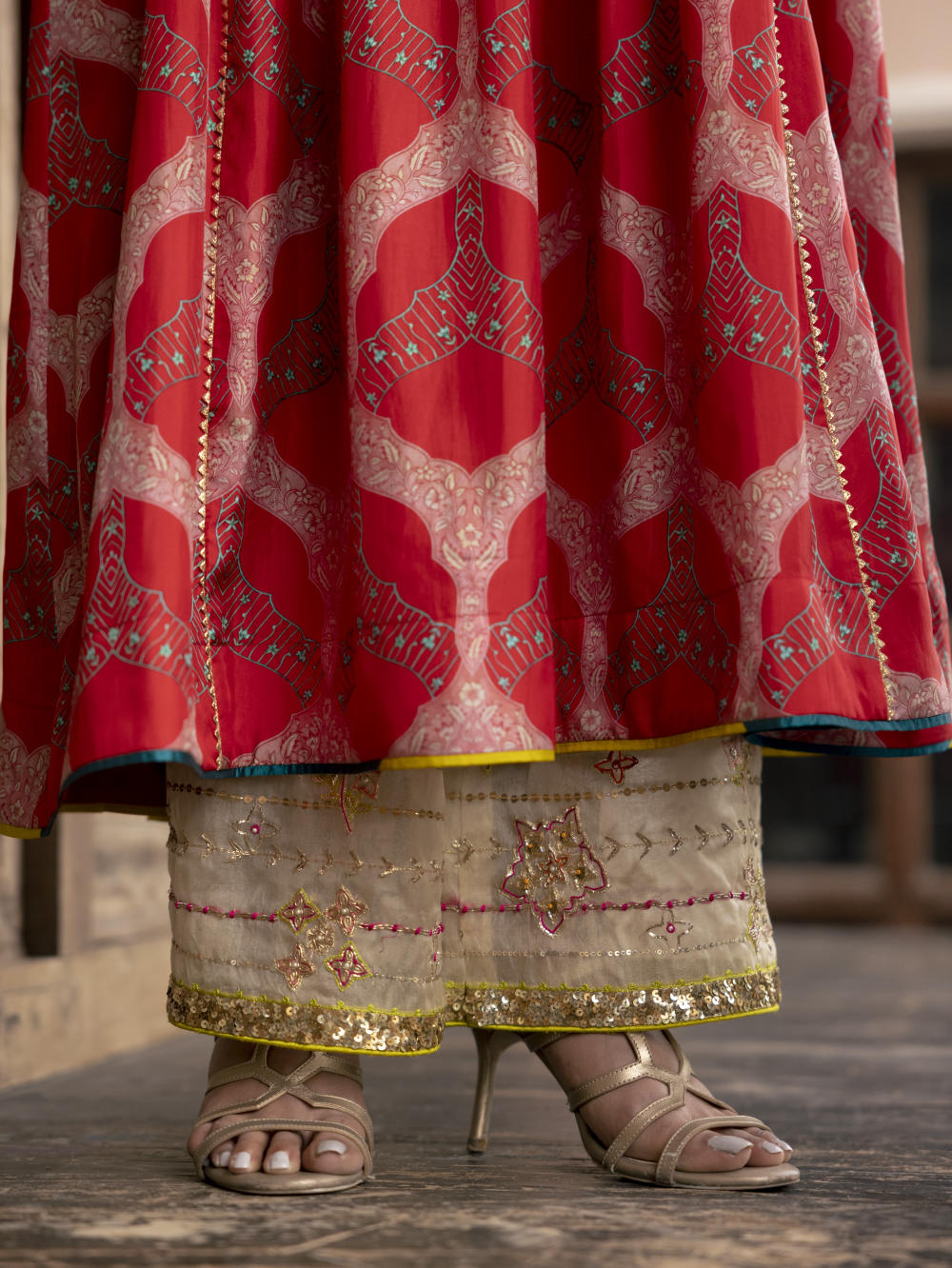 Red printed silk front puckering kurta with intricate hand embroidered yoke and sleeves. Paired with hand embroidered ivory palazzo and teal tissue organza dupatta.