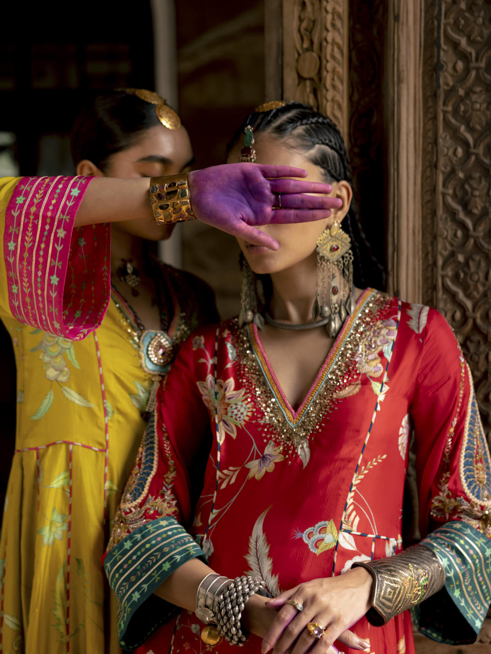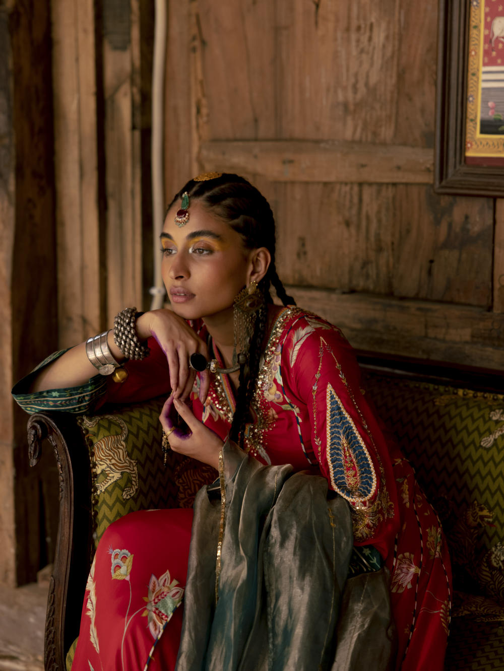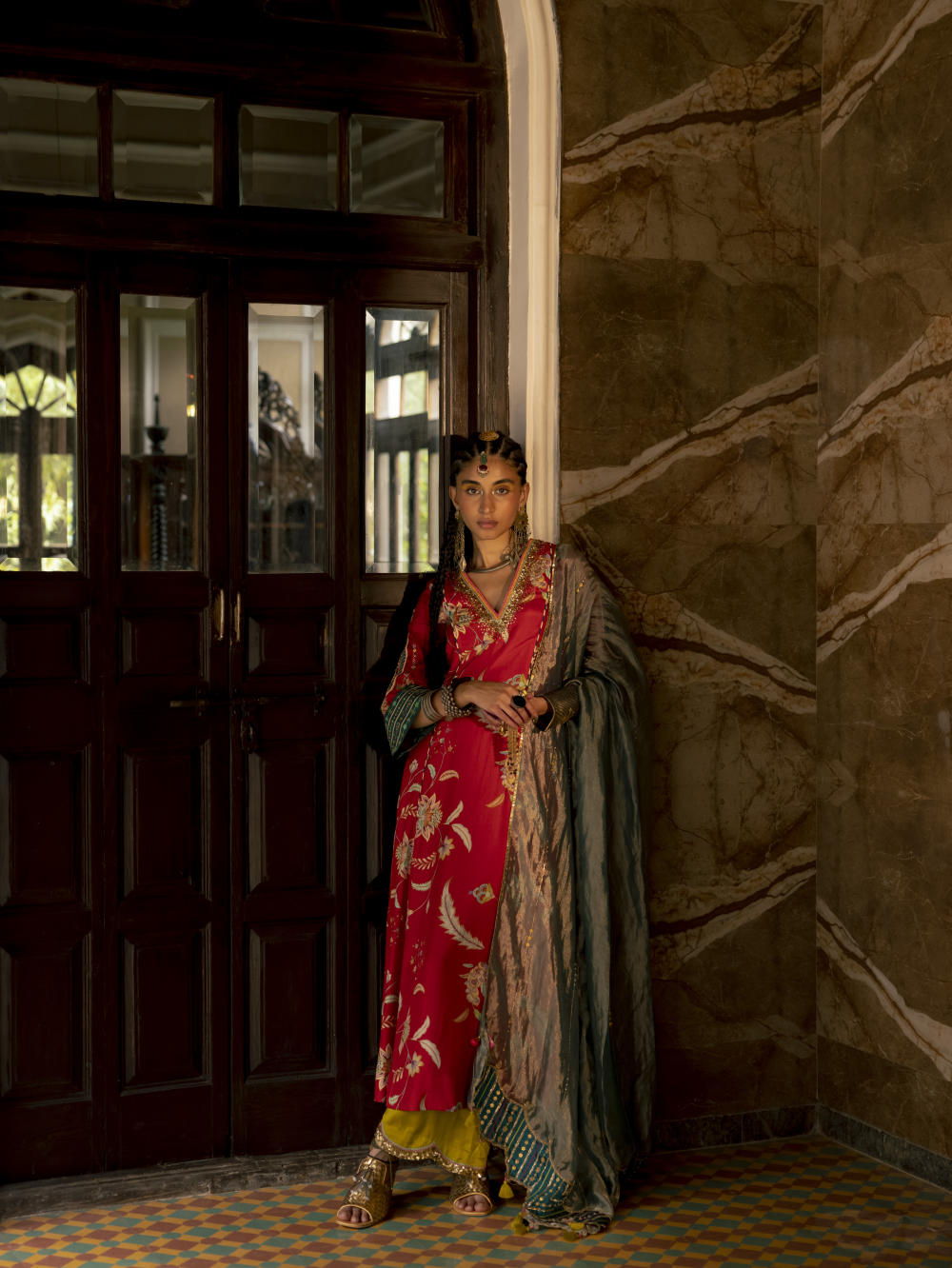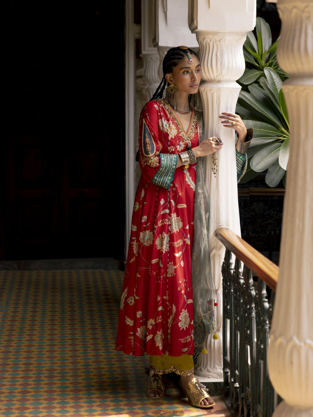 Red printed silk side kali kurta with embroidered sleeves and intricate neckline. Paired with hand embroidered Lime green palazzo and Teal Blue tissue dupatta with tassel detailing.