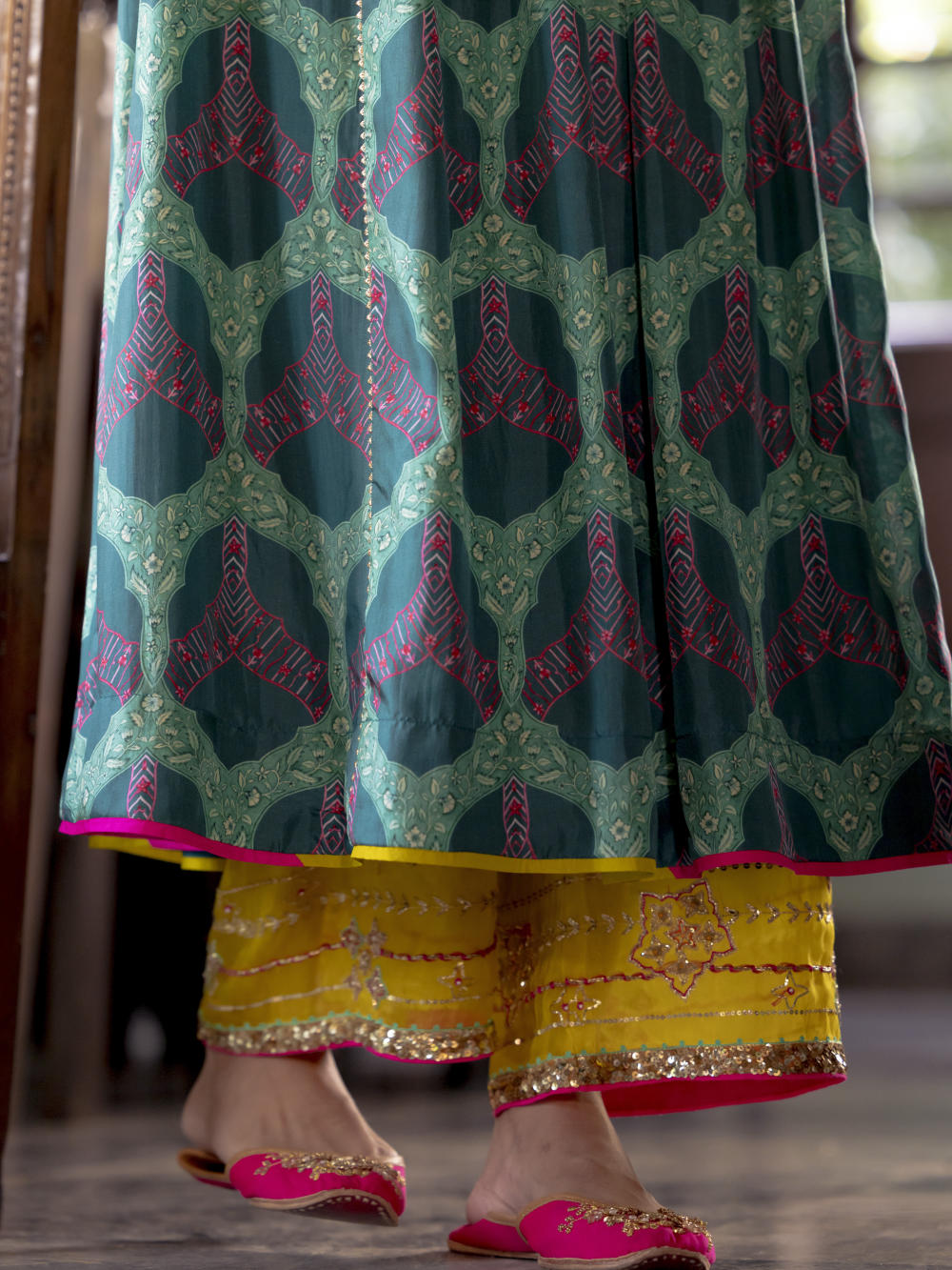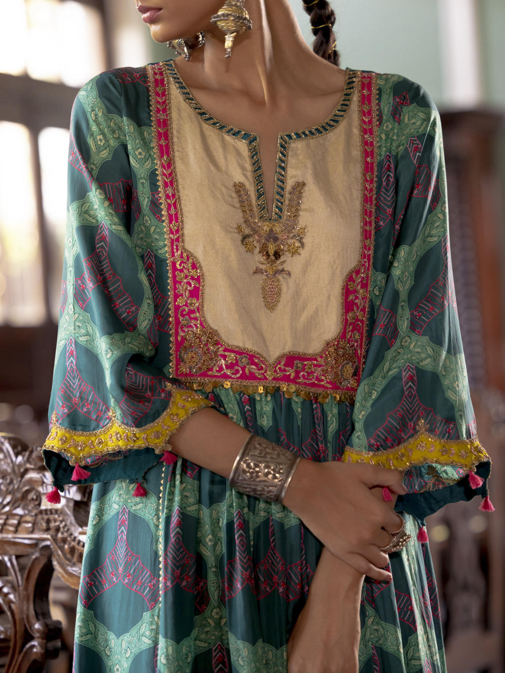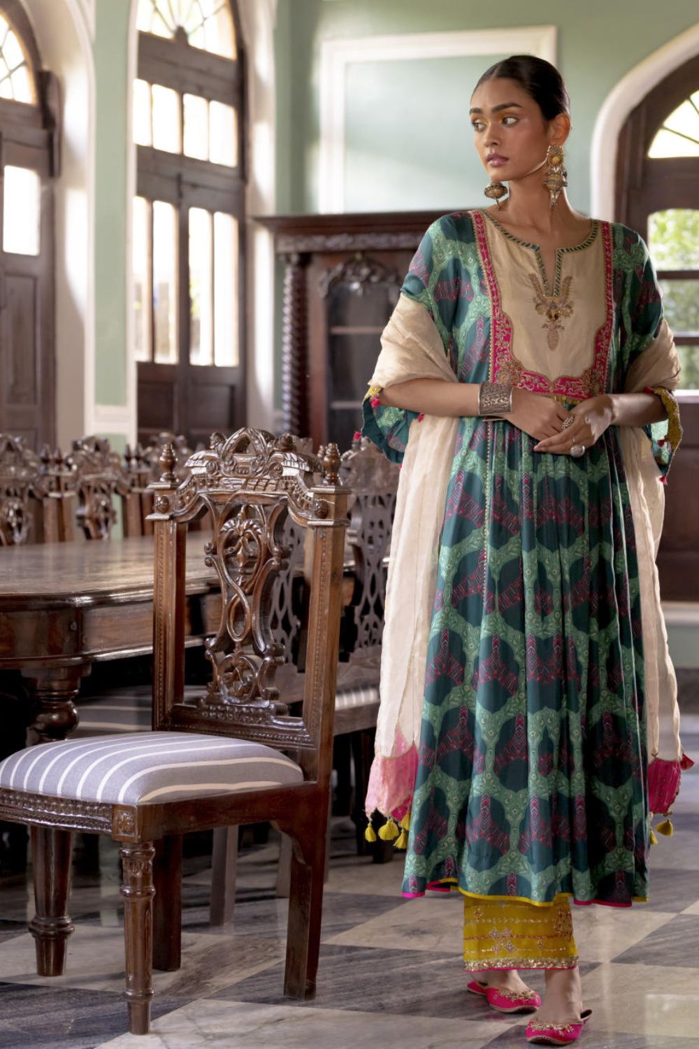 Teal green printed silk front puckering kurta with intricate hand embroidered yoke and sleeves. Paired with hand embroidered lime green palazzo and Ivory tissue organza dupatta.