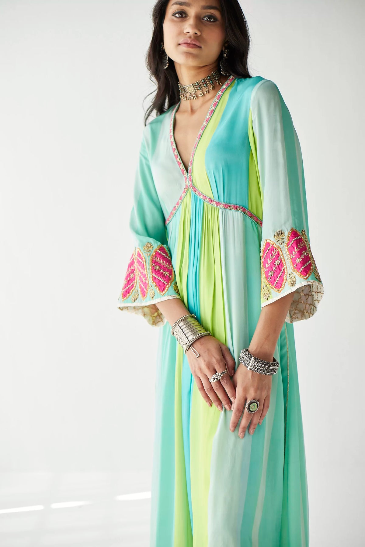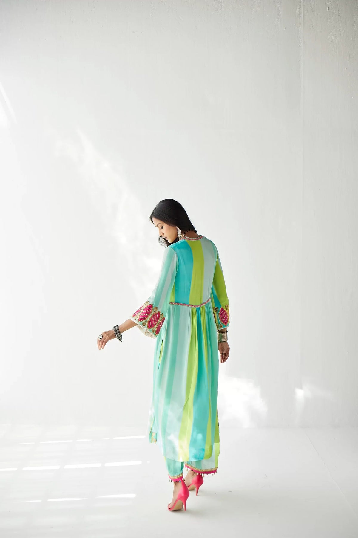 Their work is an ode to handcrafted Indian design — rooted in traditional embroidery techniques like zardozi, dabkaa, and fine threadwork, yet shaped into silhouettes that feel refreshingly contemporary. Clean cuts, relaxed forms, pure fabrics, and a distinctive palette come together to create pieces that travel seamlessly from India to Singapore and beyond.