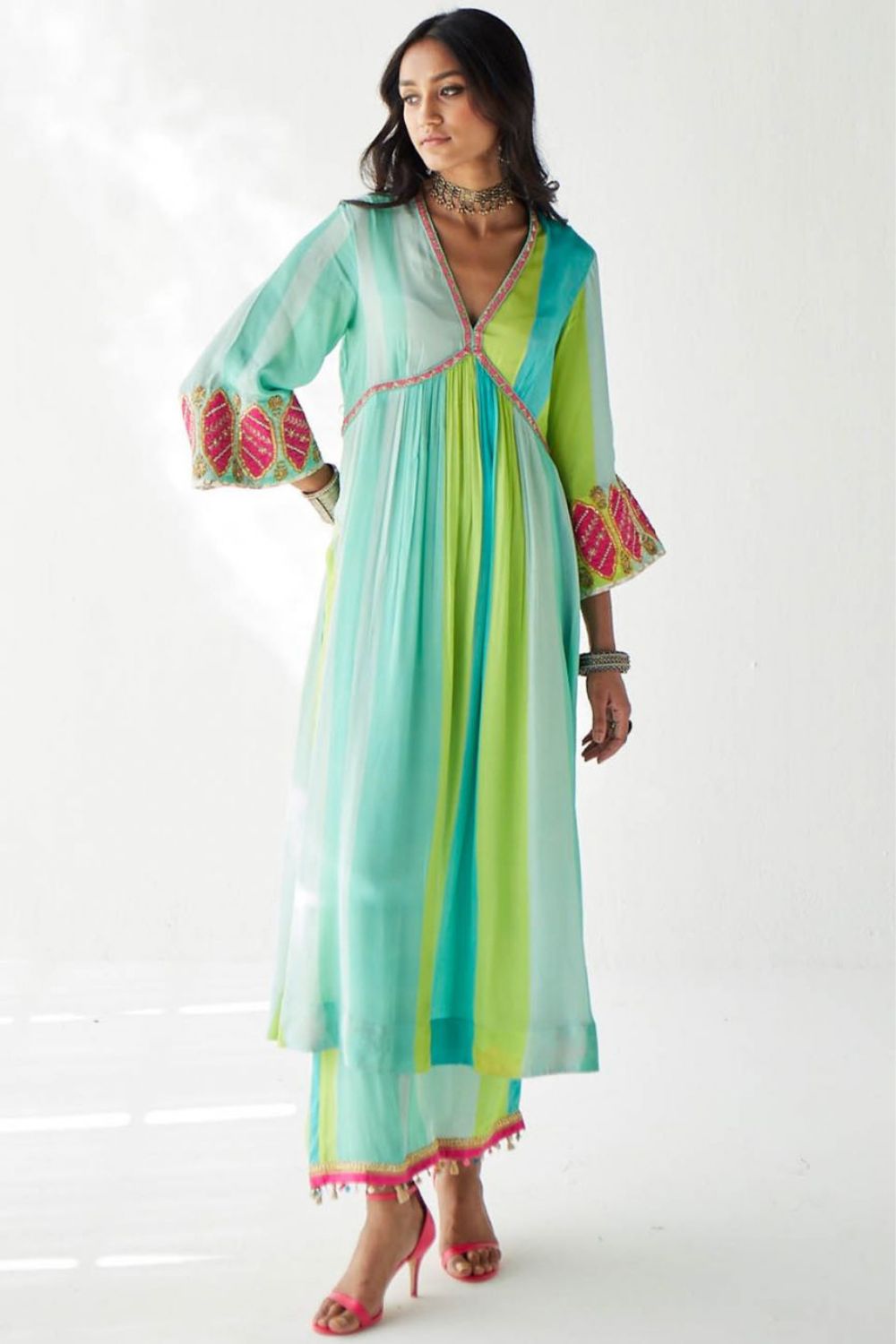 Ferozy – Green printed striped crepe A-line kurta with hand embroidered neck and bell sleeves paired with printed palazzo with tassel detailing. Paired with lime green hand embroidered organza dupatta.