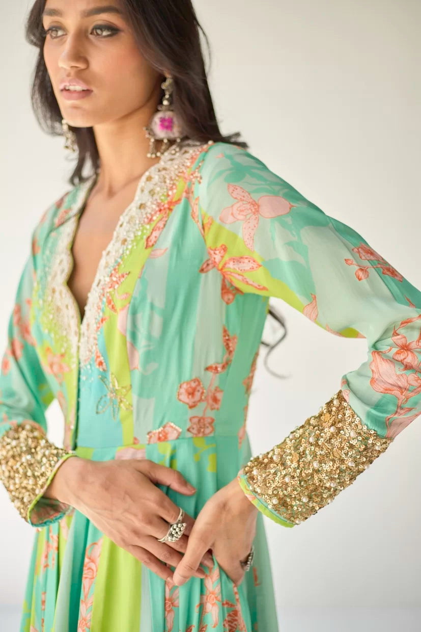 Ferozy – Green printed crepe front slit anarkali with intricate pearl hand embroidered scallop neck and sleeves, paired with printed crepe palazzo with tassel detailing.