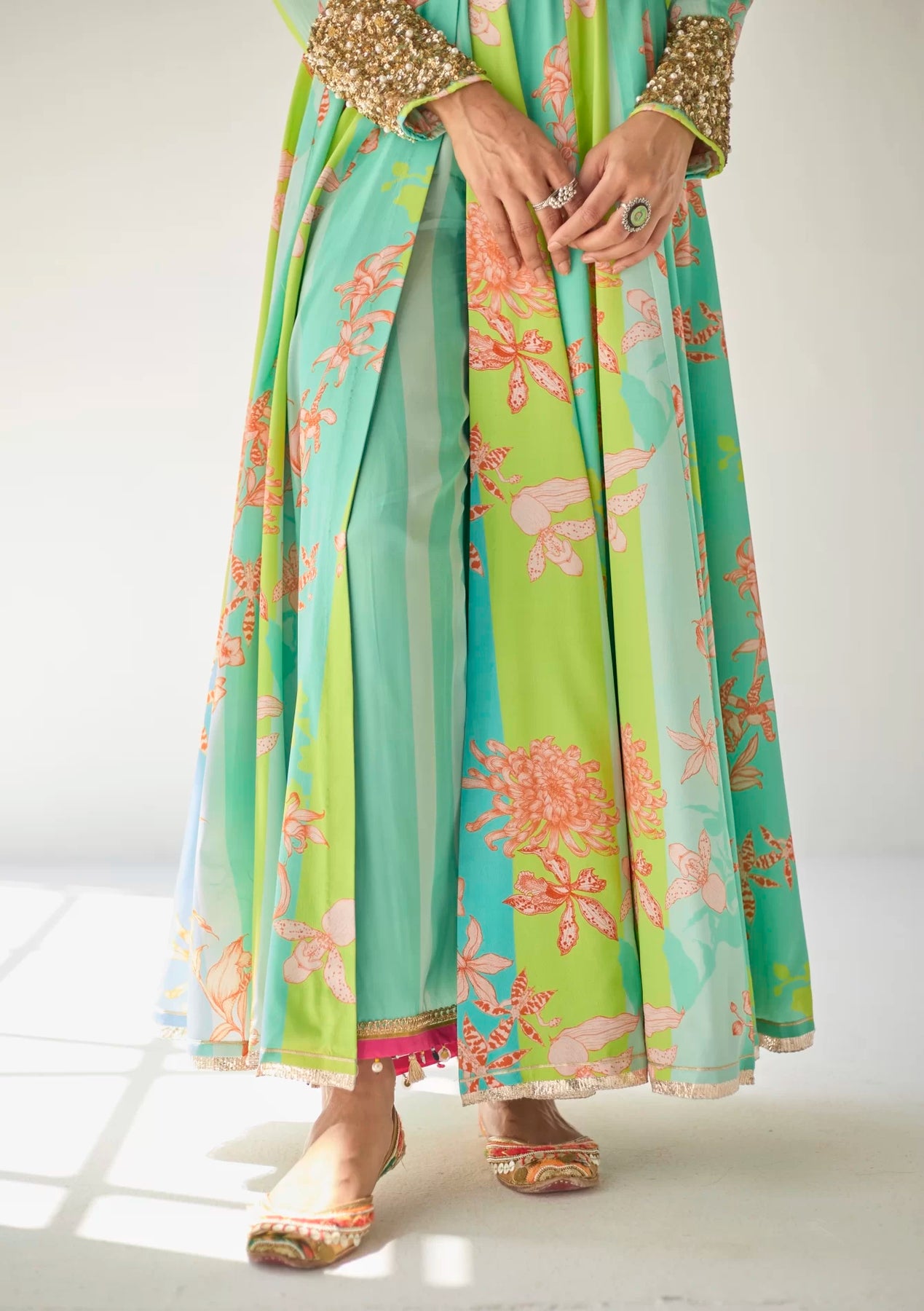 Their work is an ode to handcrafted Indian design — rooted in traditional embroidery techniques like zardozi, dabkaa, and fine threadwork, yet shaped into silhouettes that feel refreshingly contemporary. Clean cuts, relaxed forms, pure fabrics, and a distinctive palette come together to create pieces that travel seamlessly from India to Singapore and beyond.