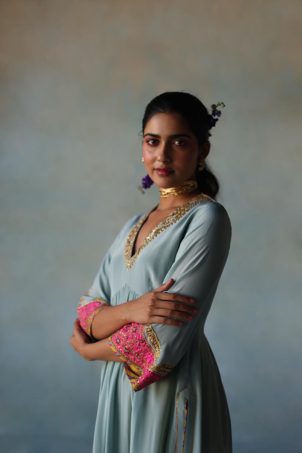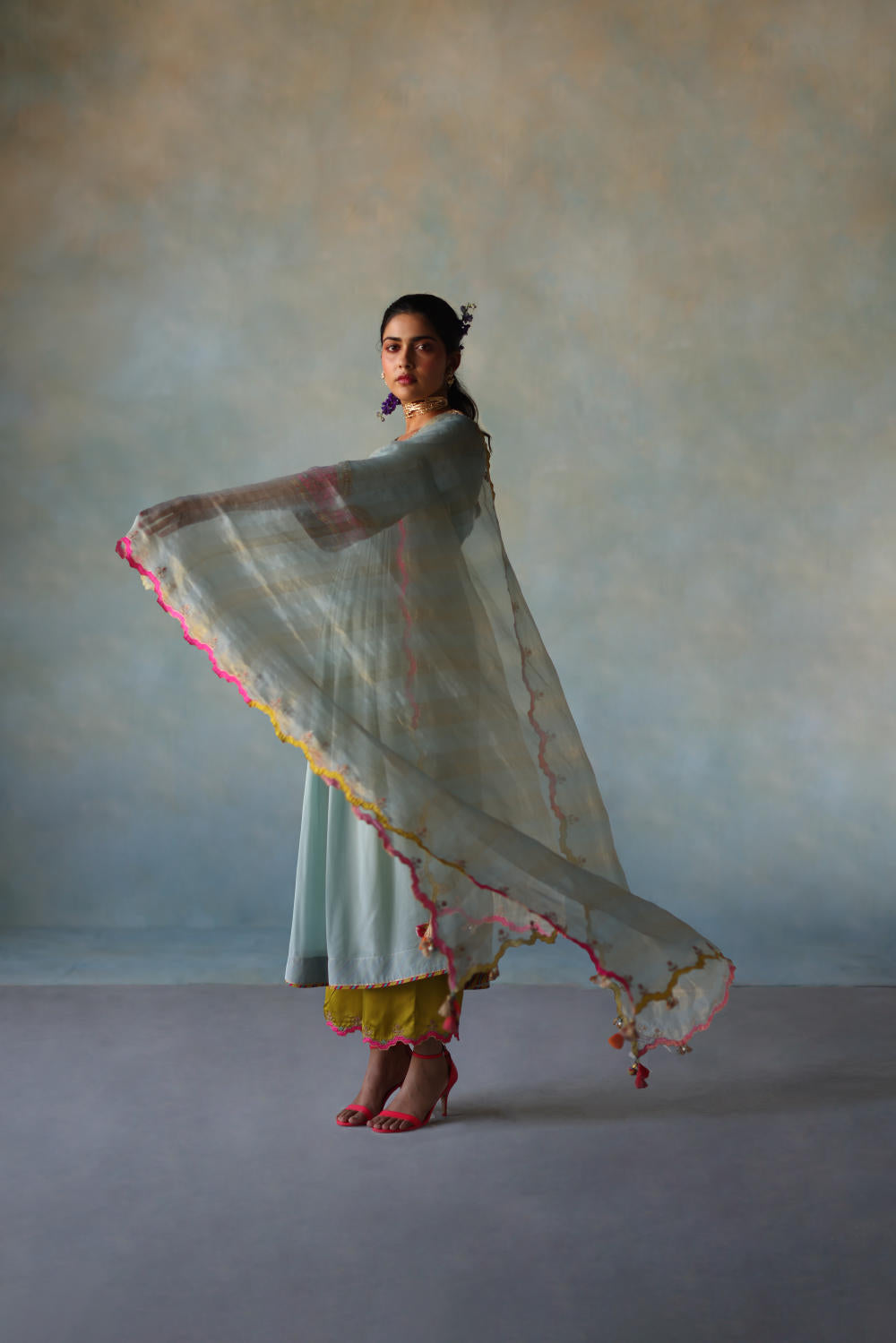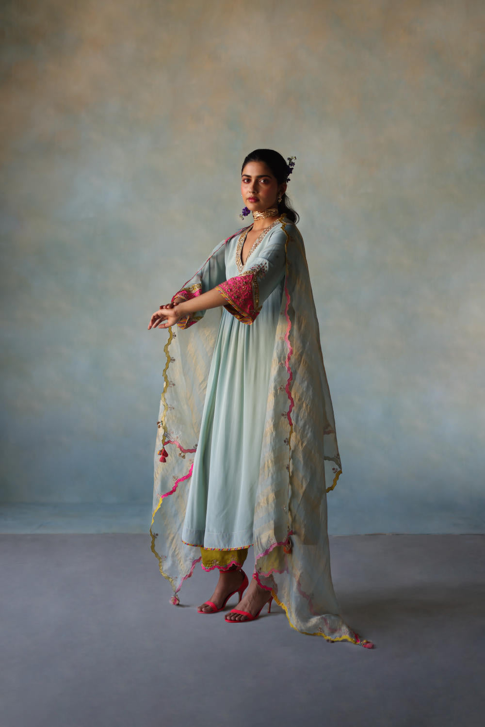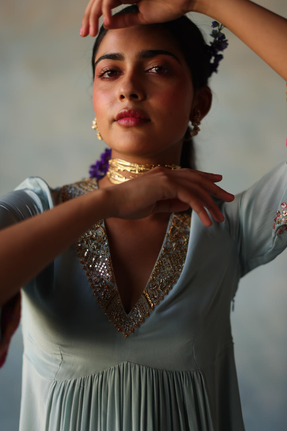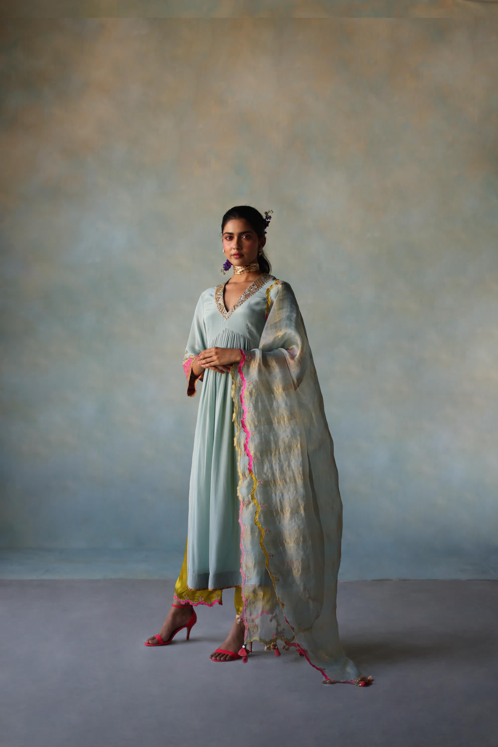 Ice Blue crepe front puckering kurta with hand embroidered neckline and sleeves. Paired with applique dori embroidered modal satin palazzo and ice blue tissue organza dupatta with scallops.