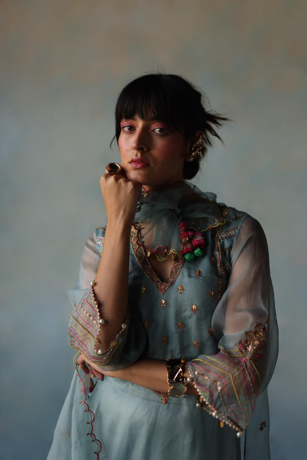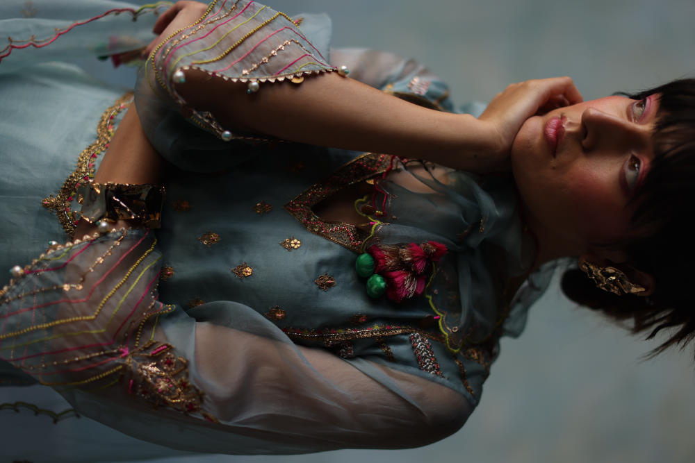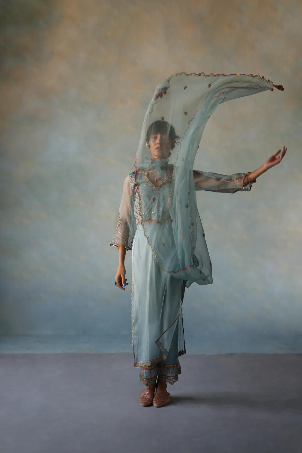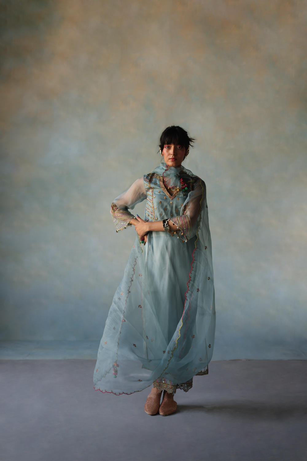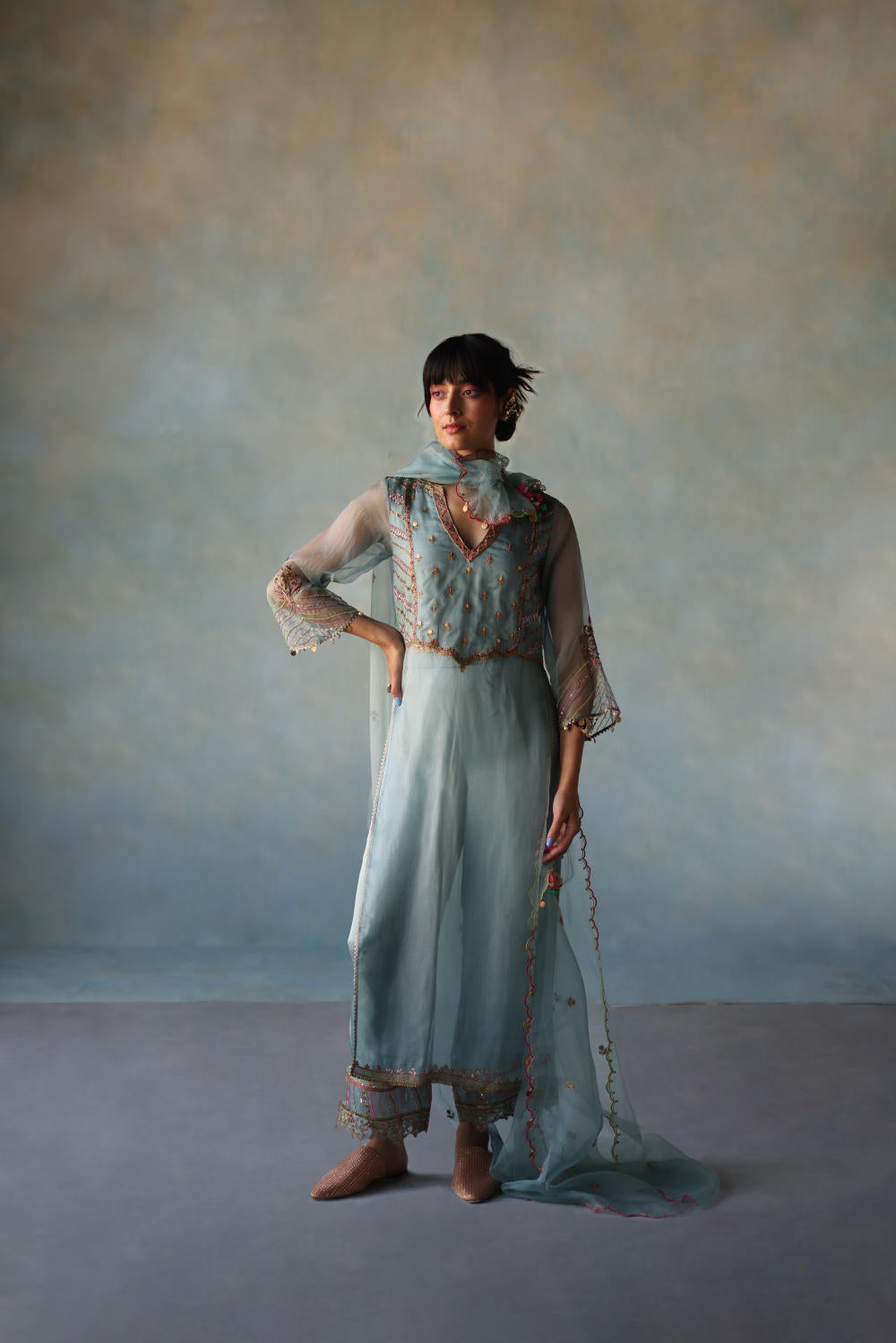 Ice Blue organza kurta with hand embroidery on yoke and scalloped hemline paired with ice blue modal satin palazzo with hand embroidered organza panel and dori embroidered ice blue organza dupatta with scallops and tassel detailing.